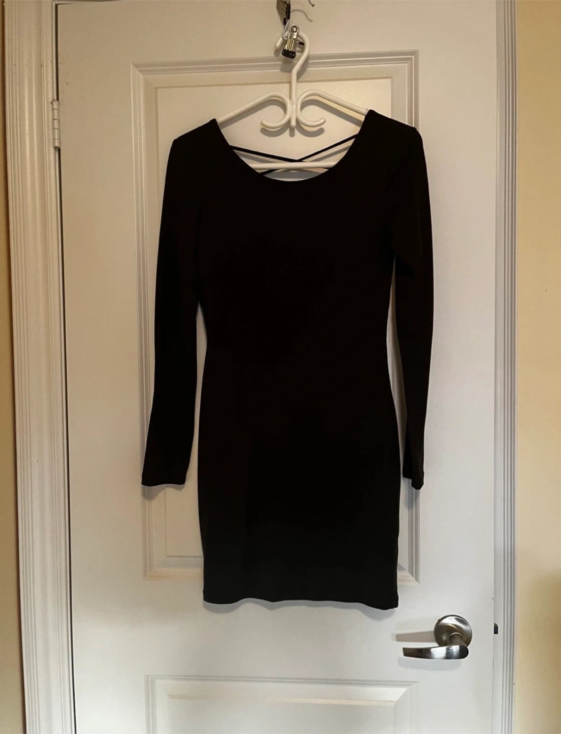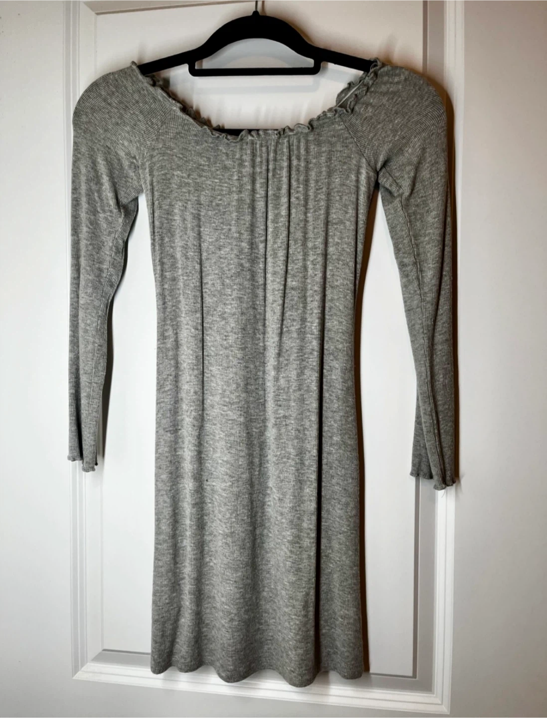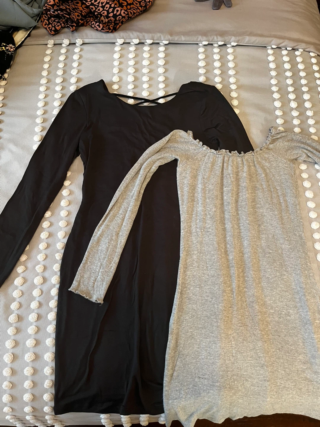 Selling two long sleeve dresses. One is black with a criss-cross back detail size S, and the other is a light grey with a ruffled neckline size M. Both are in good condition and ready for a new home!