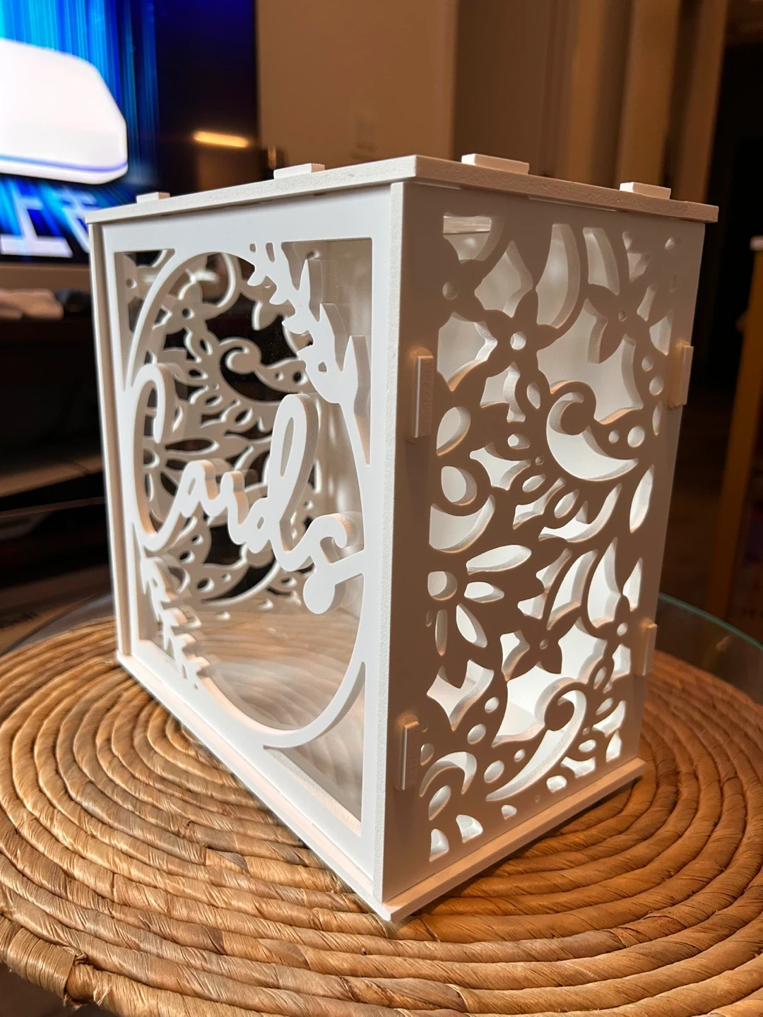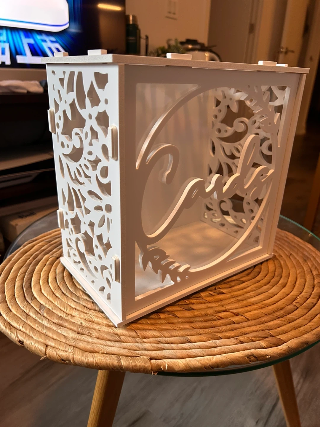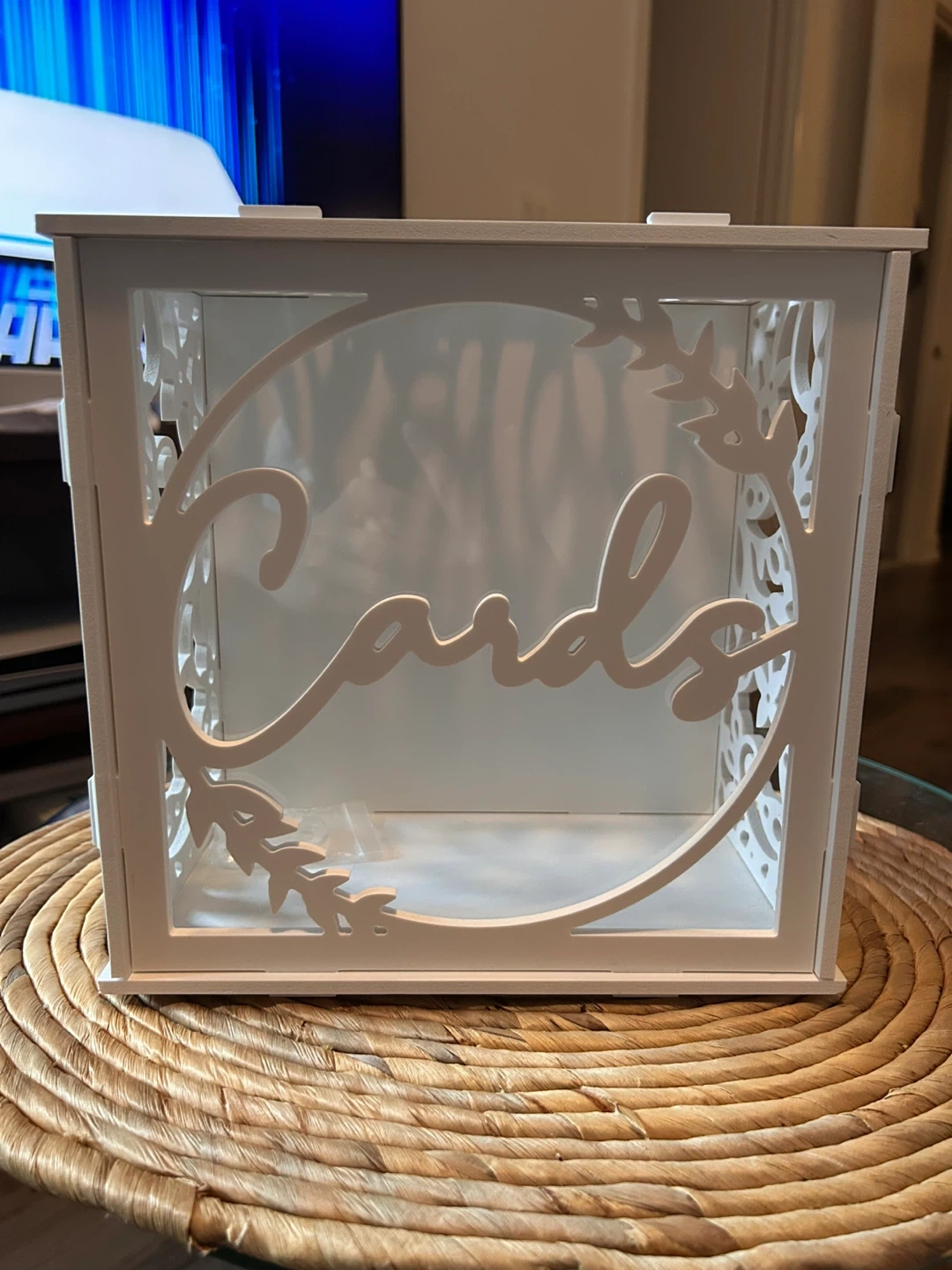 Selling a lovely white wedding card box. It's in great condition and perfect for holding cards at your wedding reception. The box has a decorative design with the word "Cards" on the front. It's a beautiful way to collect your cards and keep them safe!