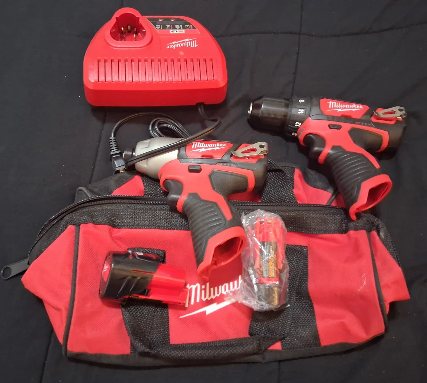 Selling a Milwaukee M12 cordless drill driver and impact driver kit. It comes with a charger, a battery, and a bag. Great for various projects around the house!