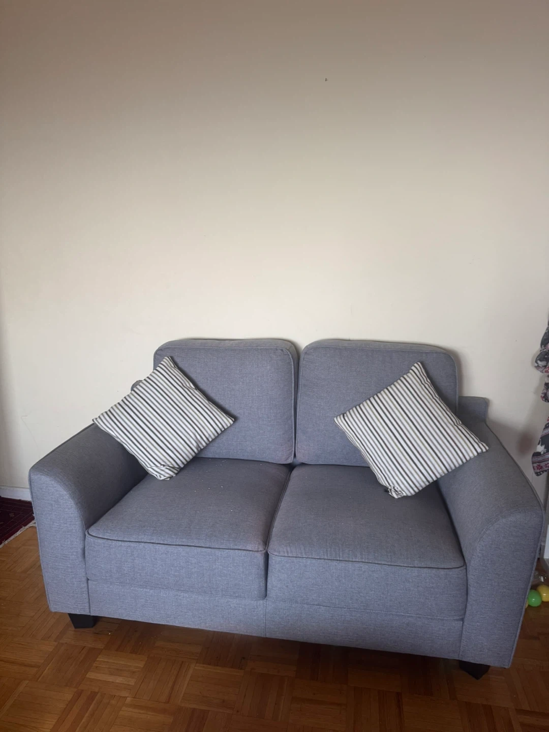 Selling a comfy grey loveseat sofa. It comes with striped cushions to complete the look. Perfect for a small space or apartment!