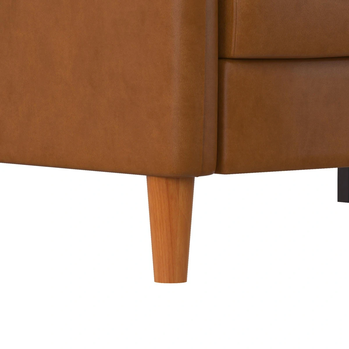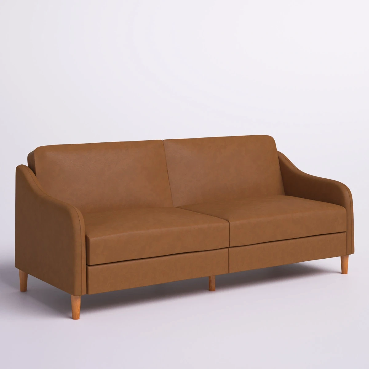 This convertible sofa easily turns into a bed! The sofa is brown and made of faux leather.