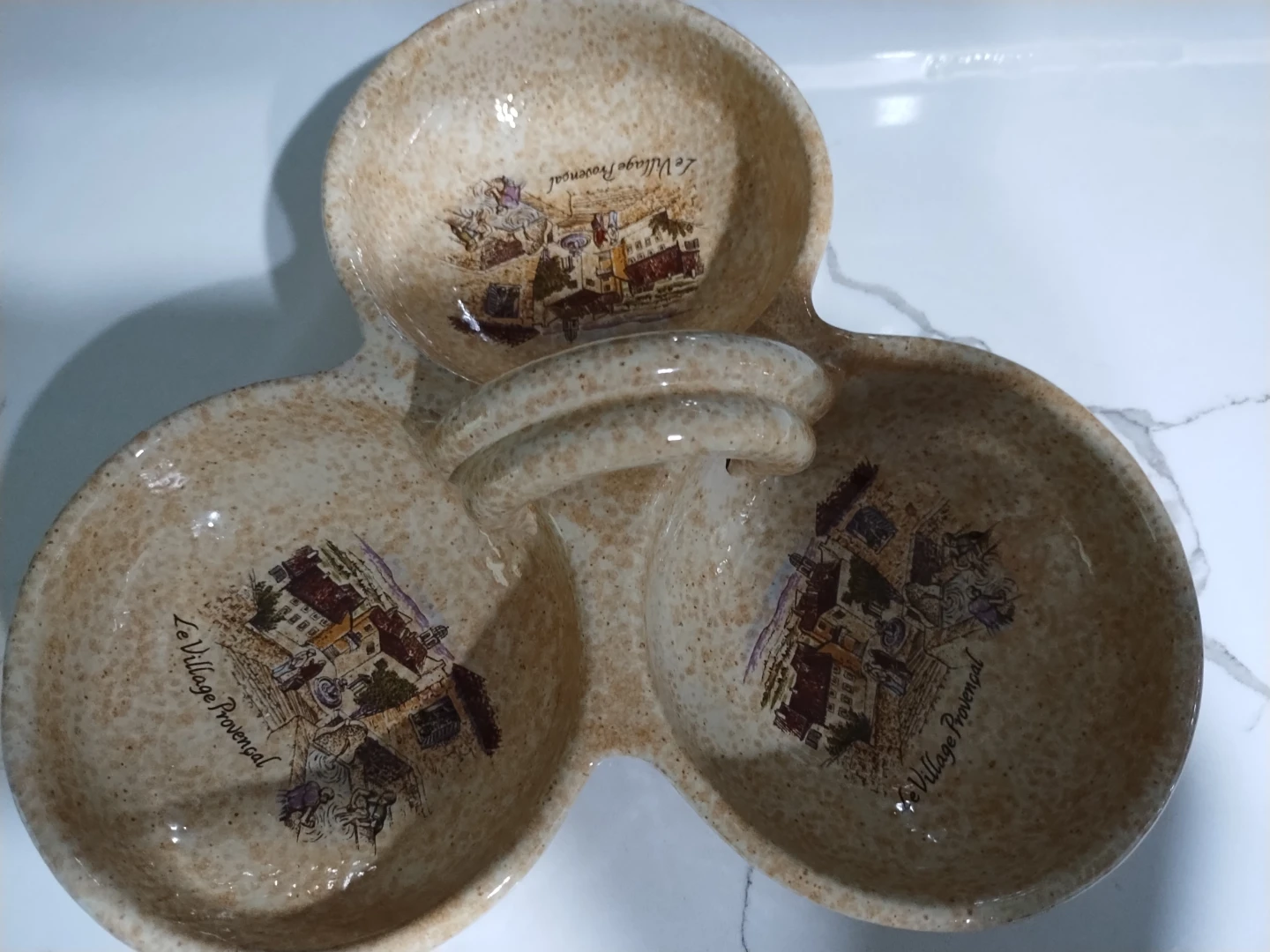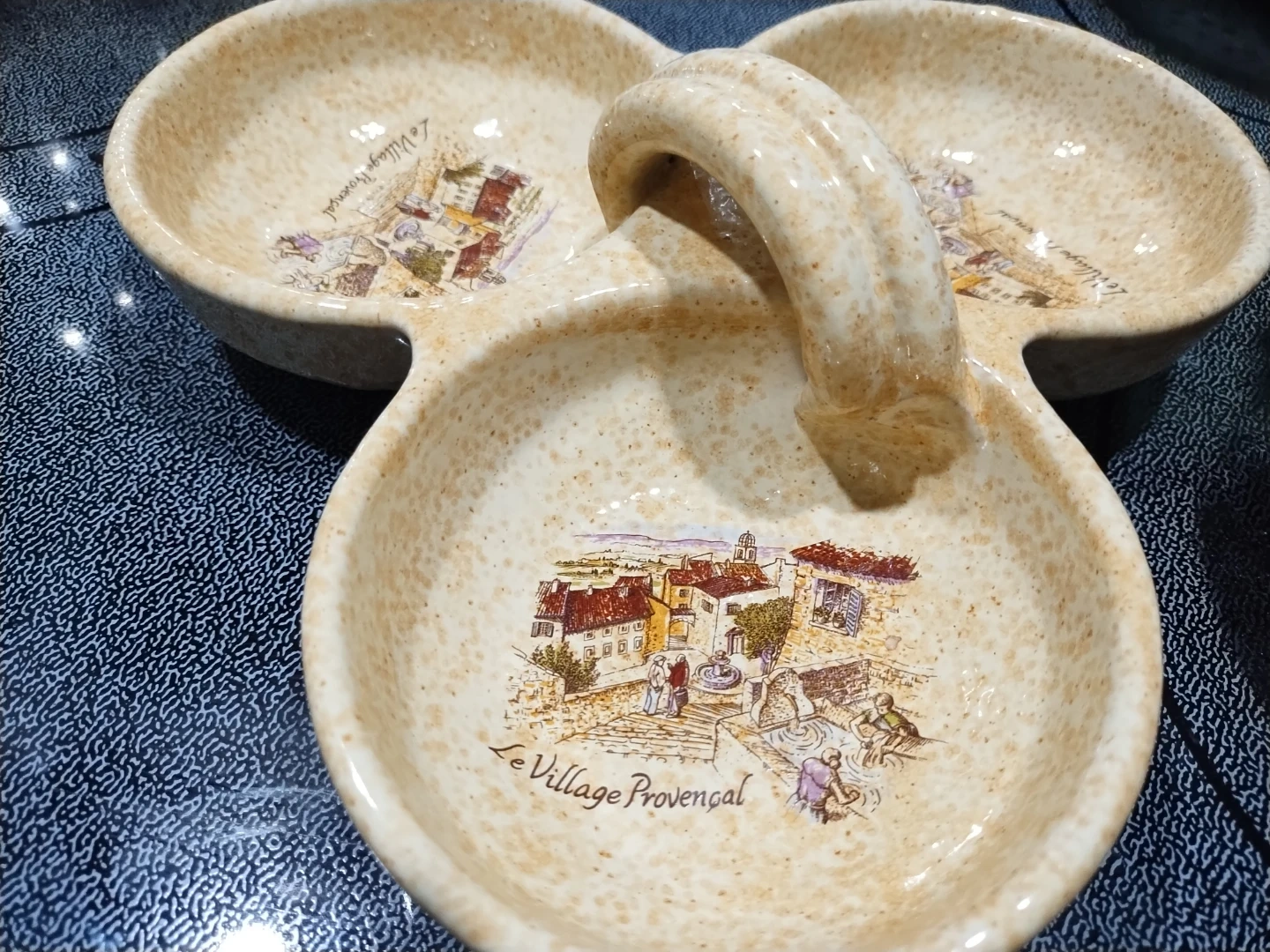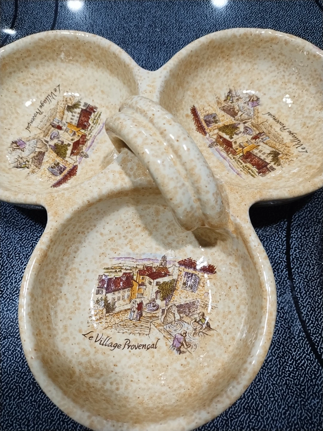 Here's a lovely vintage serving dish featuring a charming "Le Village Provençal" design! It has three divided sections, perfect for serving snacks, appetizers, or condiments at your next gathering