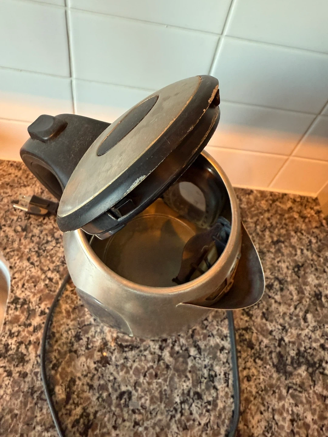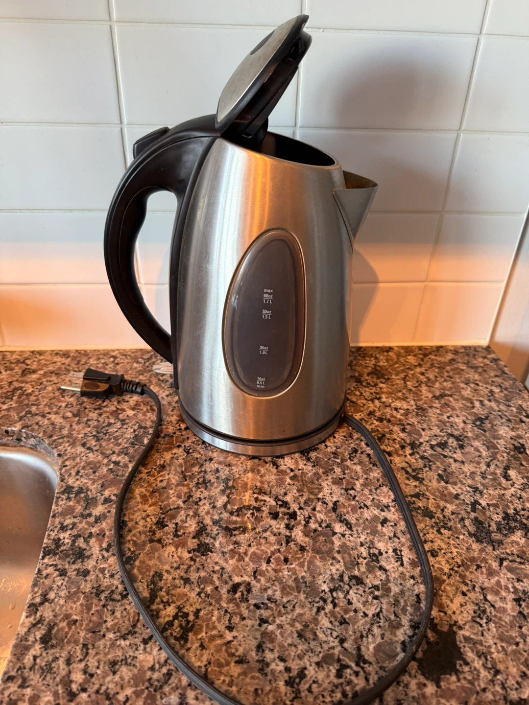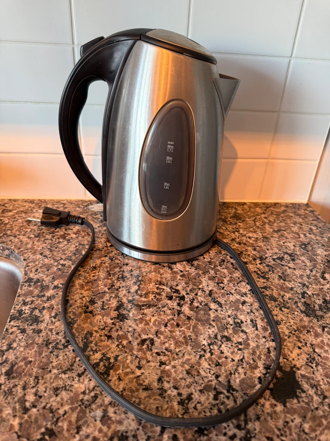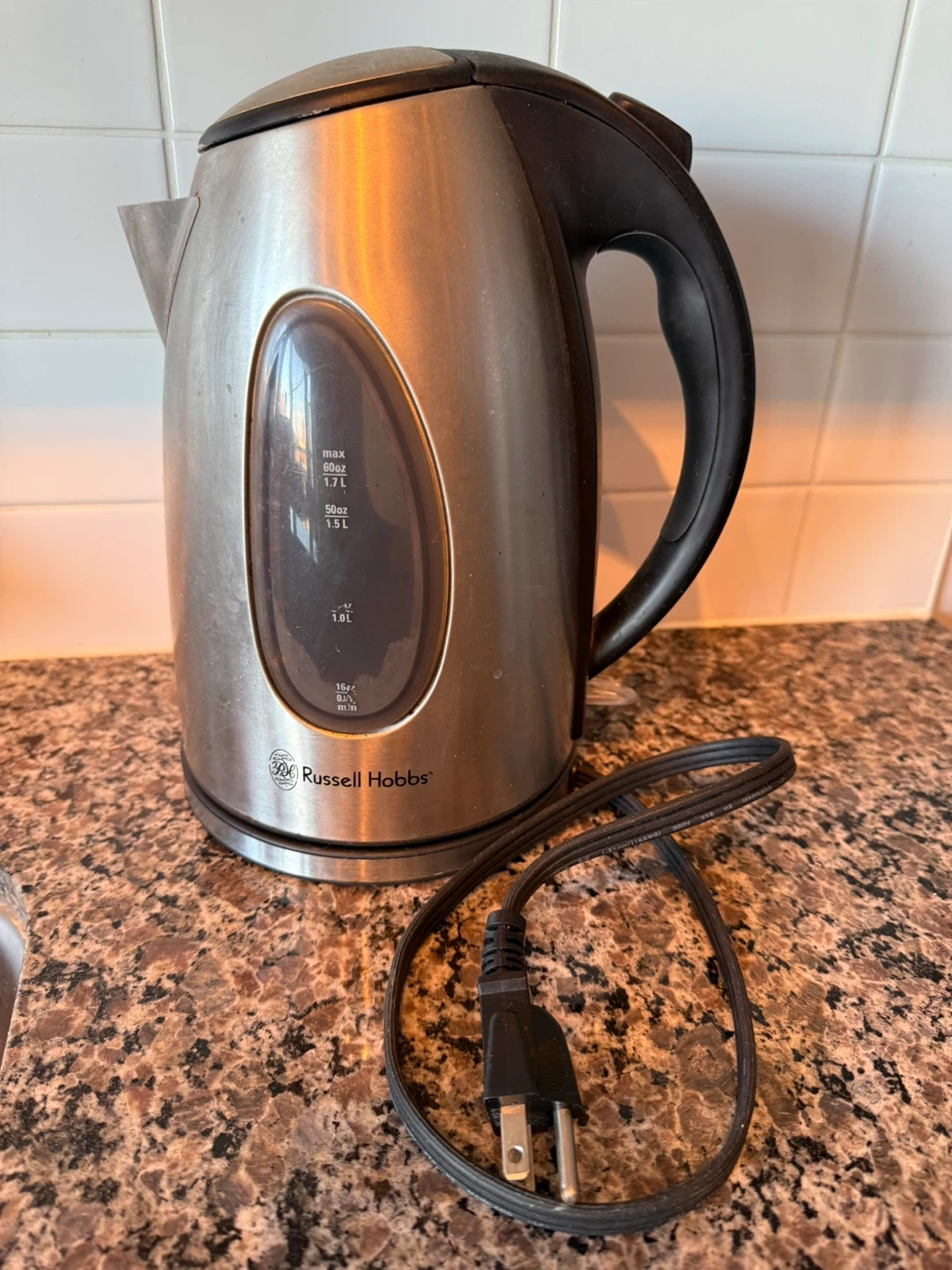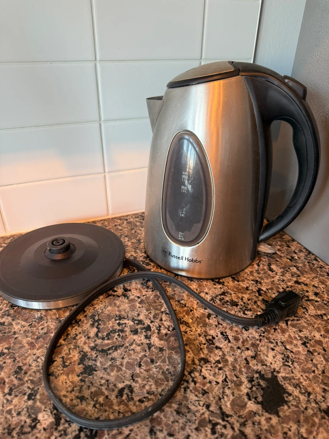 Selling a used Russell Hobbs electric kettle. It has a 1.7L capacity and a visible water level indicator. Perfect for quickly boiling water for tea or coffee!