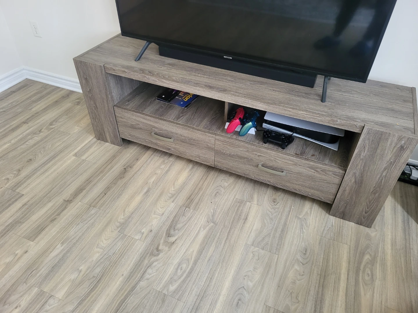Selling a wood grain TV stand. It's in great condition and would look great in any living room or entertainment area! It features drawers for storage and open shelving for consoles or decor