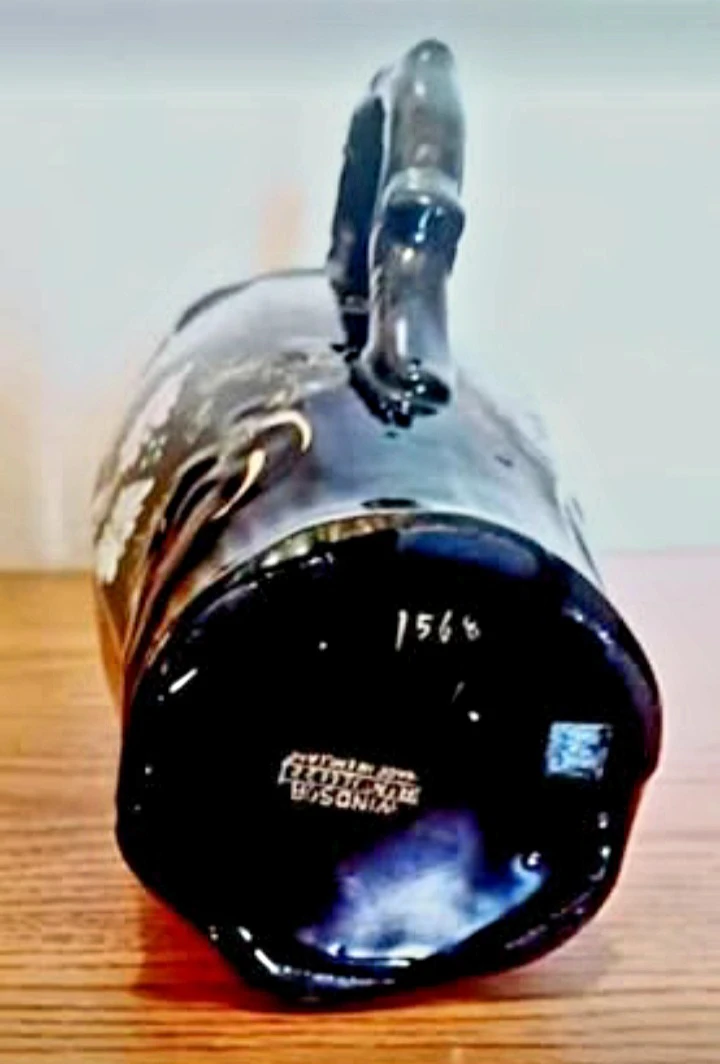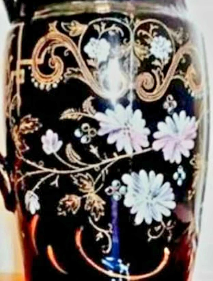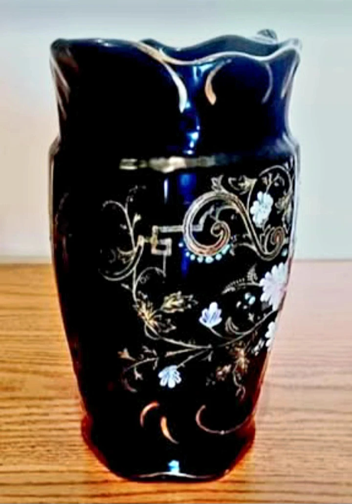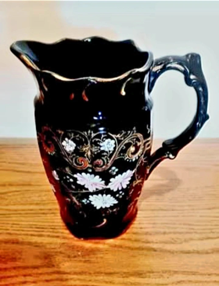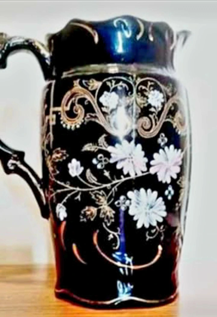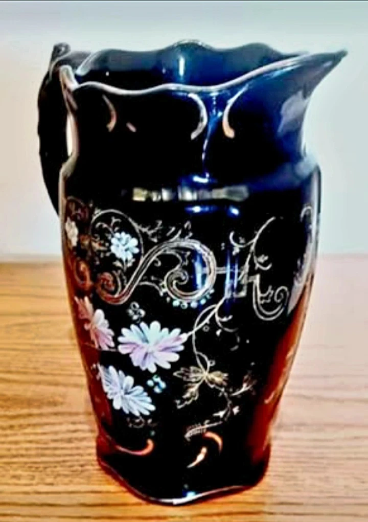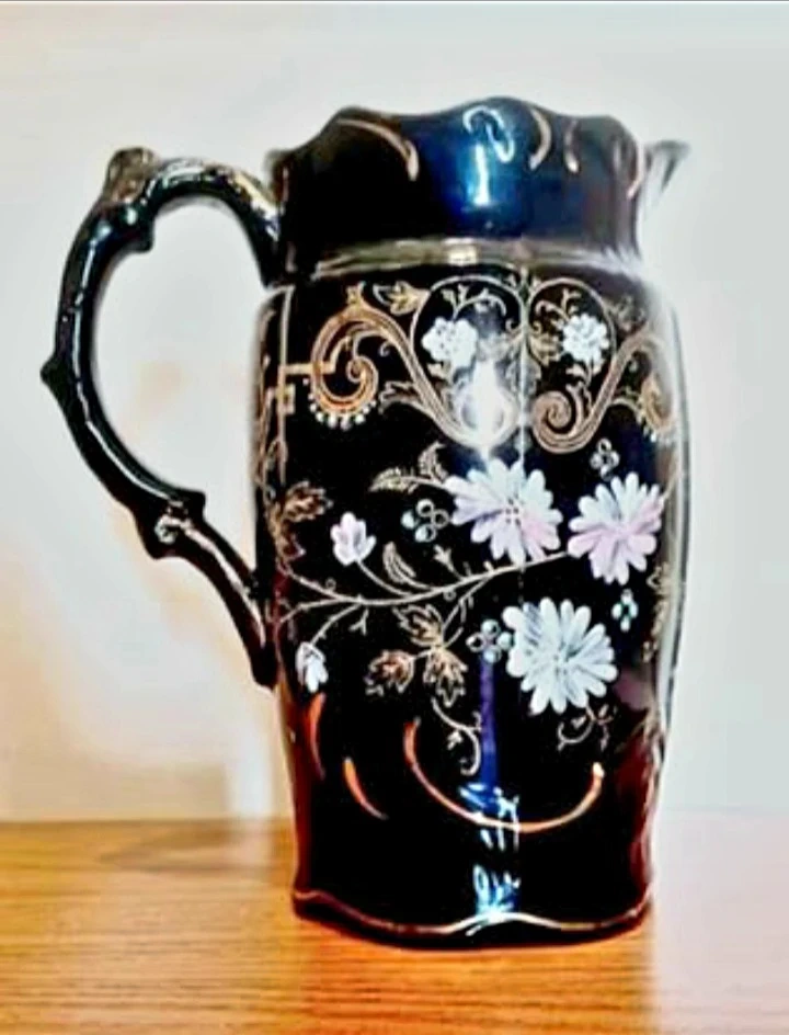 Vintage Hand-painted Windsor Pitcher features a striking Dark Blue background adorned with delicate floral designs, making it a Unique decorative piece with a touch of Elegance. This pitcher has a stunning design, perfect for adding character to your collection or home decor.
