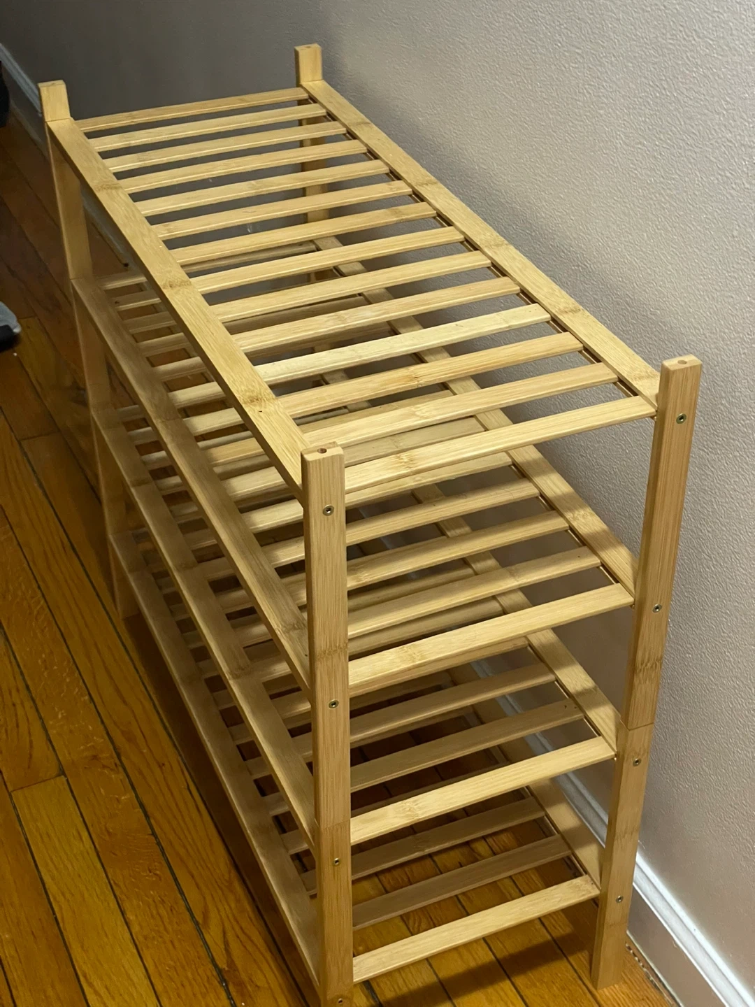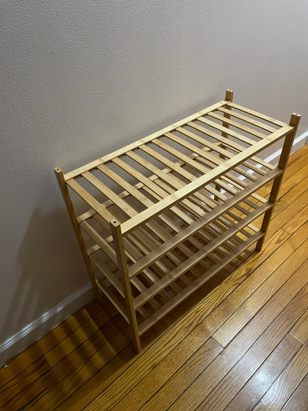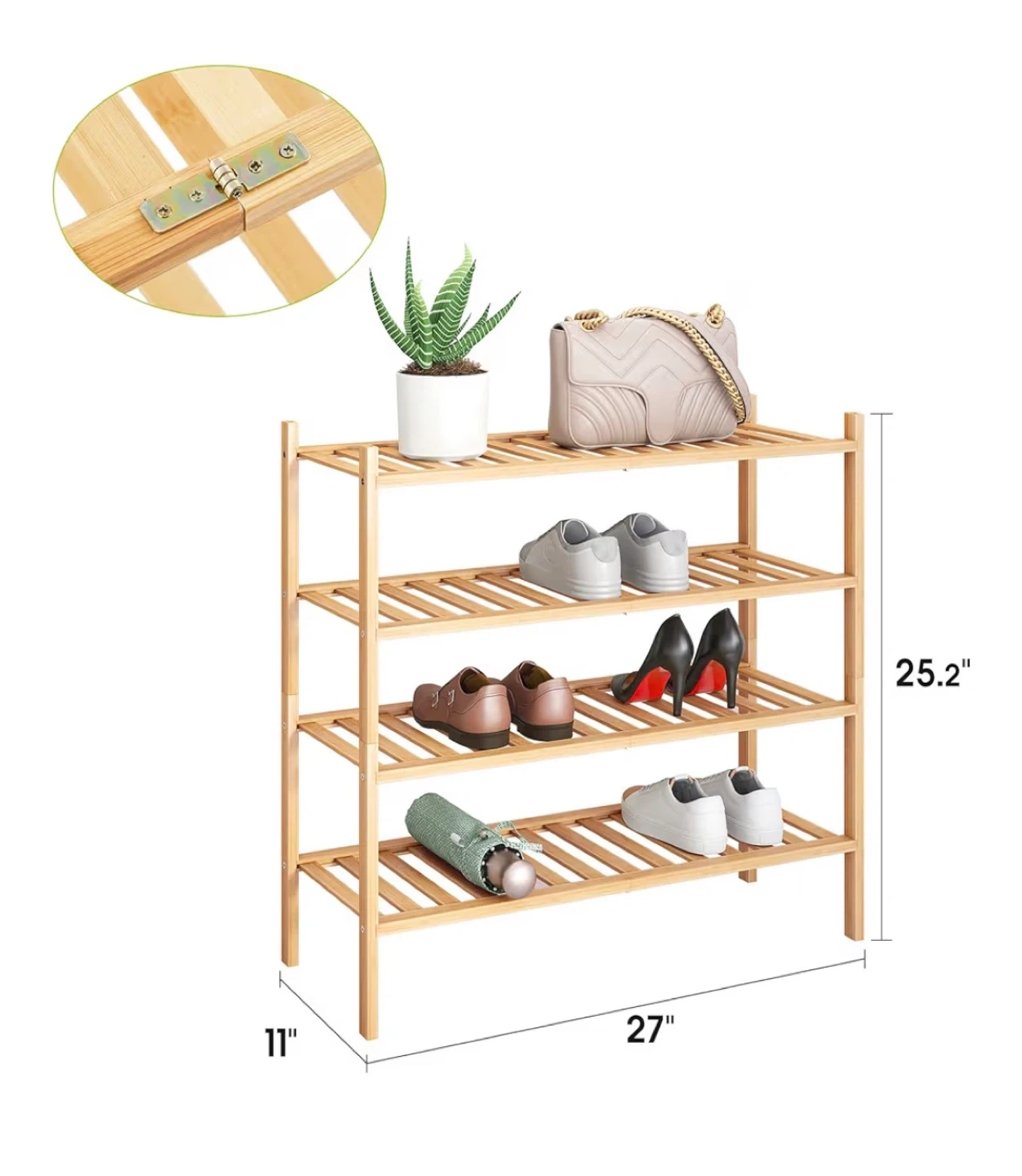 I'm selling a bamboo 4-tier shoe rack organizer. It's perfect for keeping your shoes neat and tidy! The dimensions are 25.2" x 27" x 11".