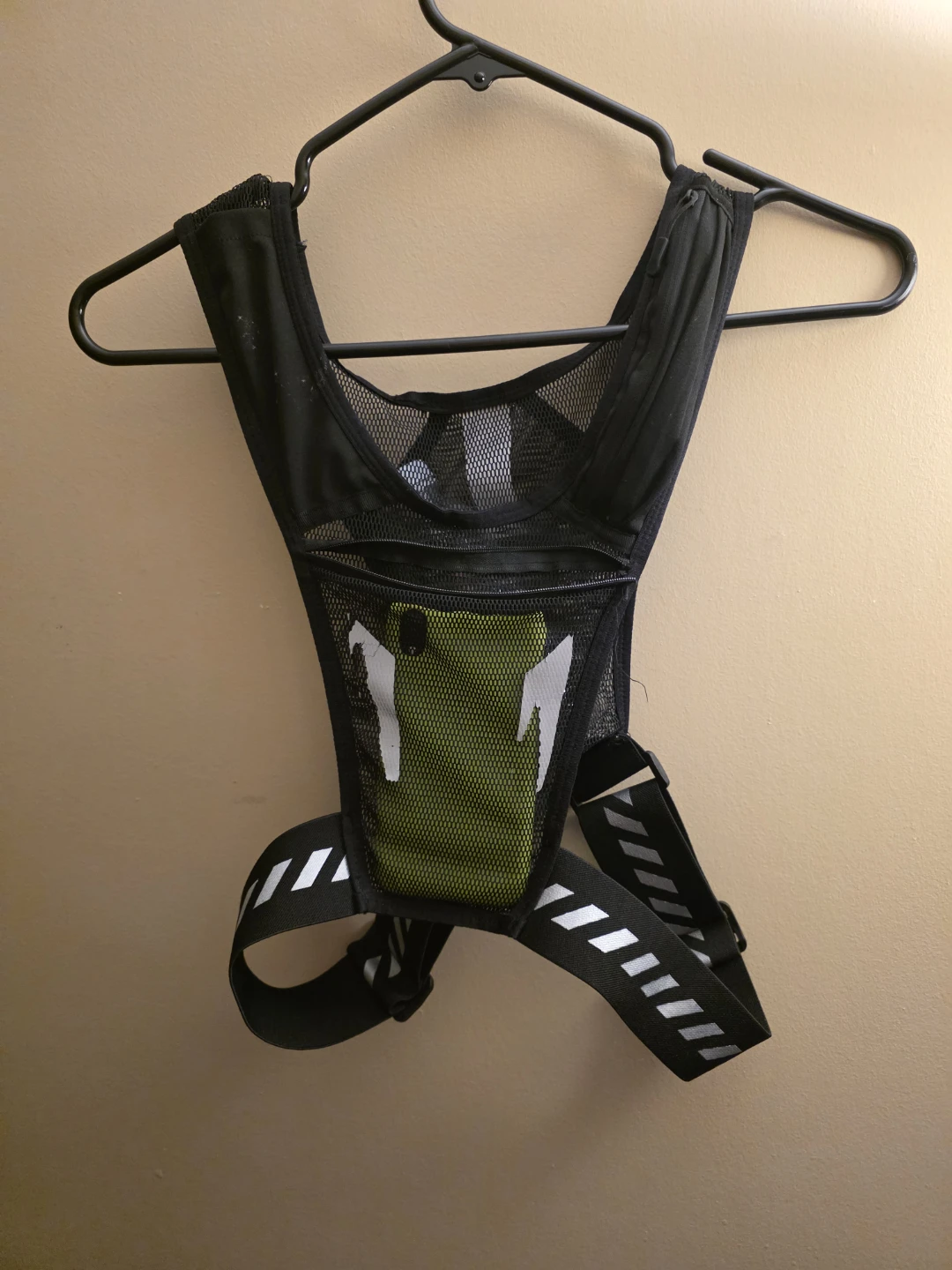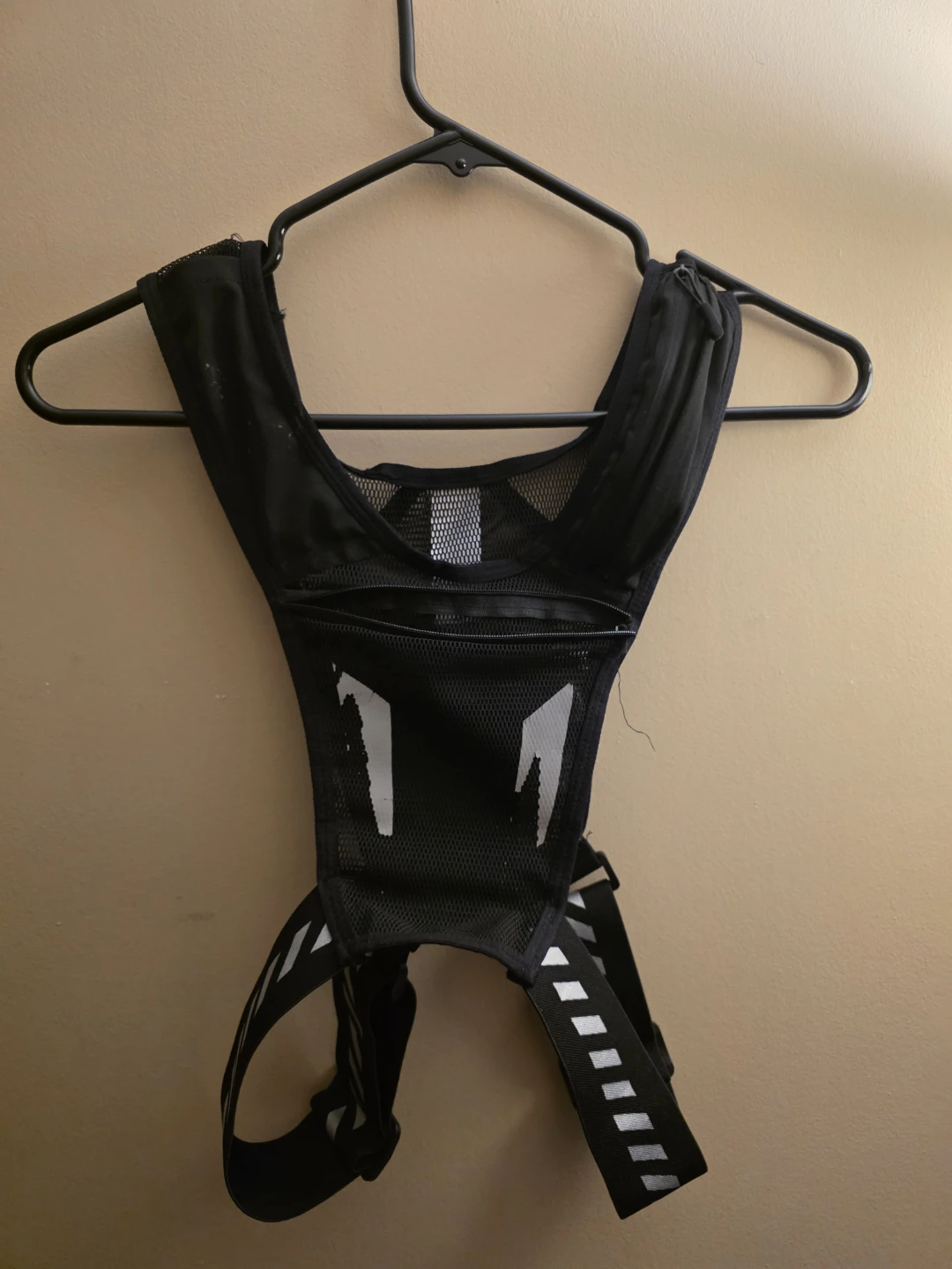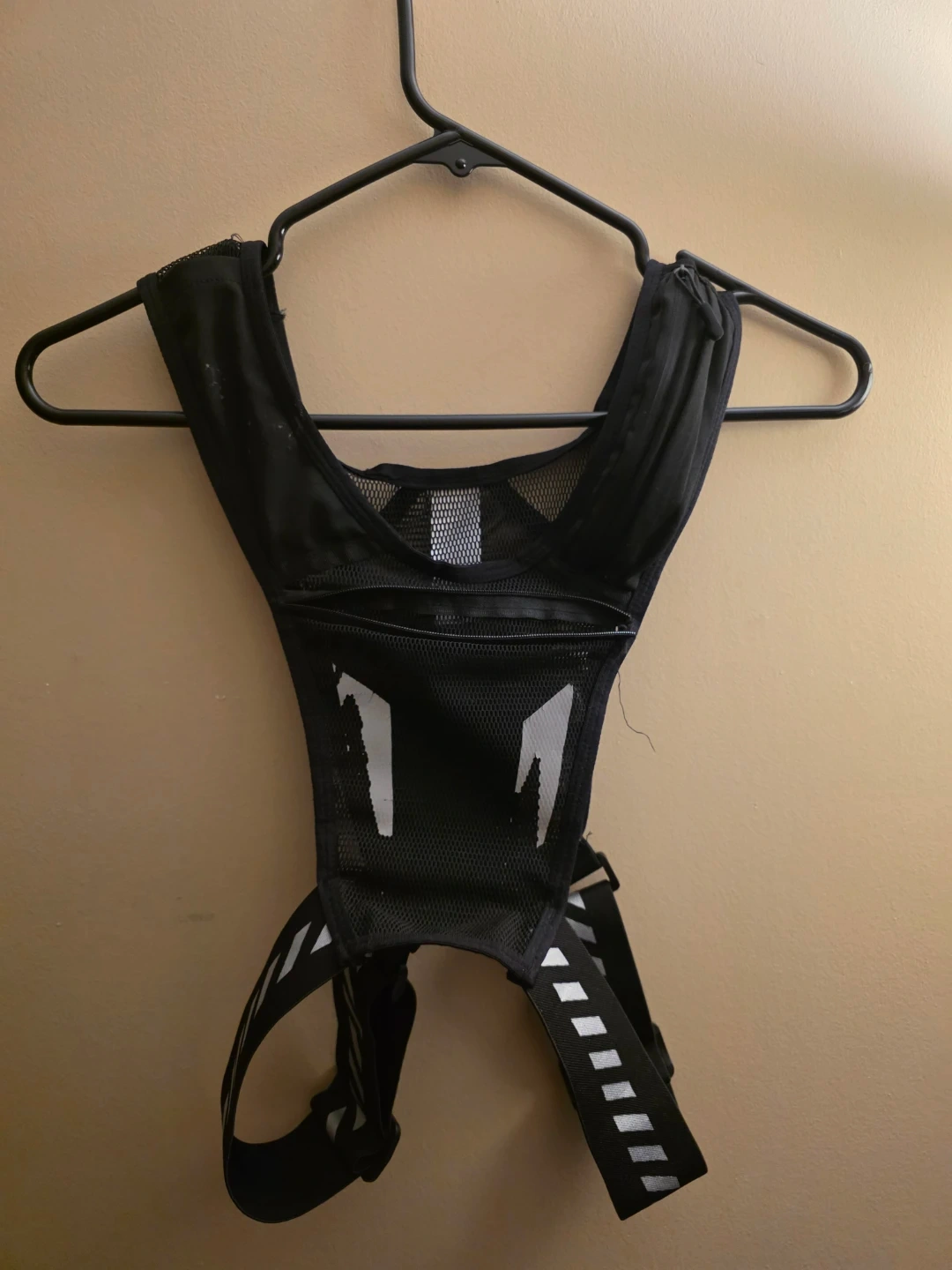 Selling a black running vest. It has a mesh design for breathability and adjustable straps for a comfortable fit. Perfect for carrying small water bottle , the pocket infront is ok for a phone , the pocket on the right for the keys