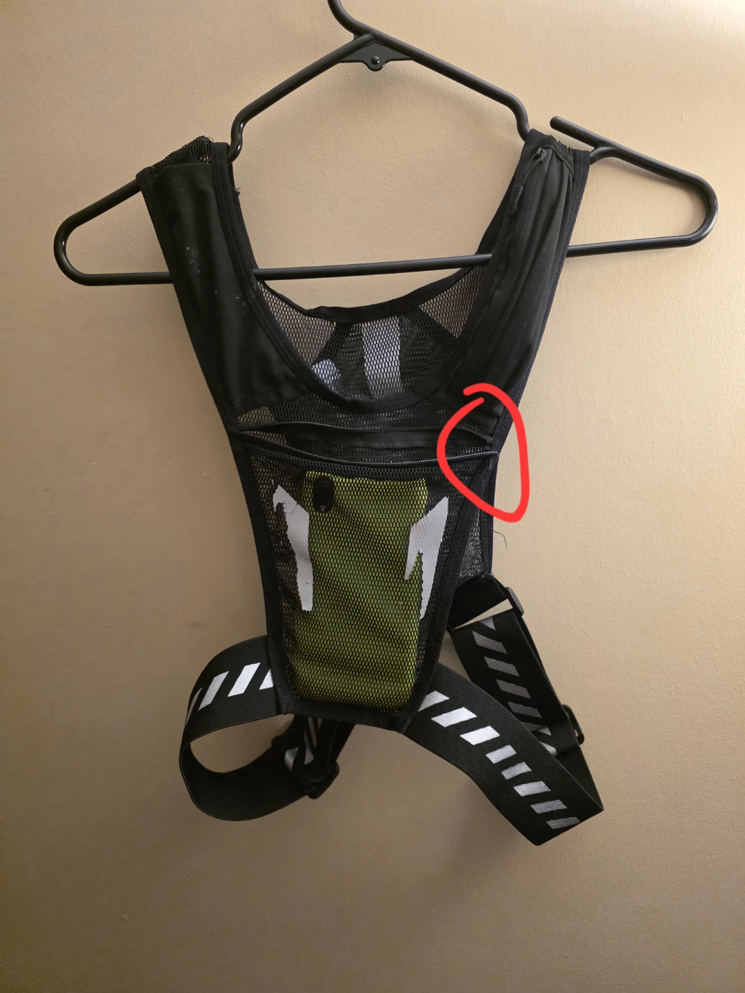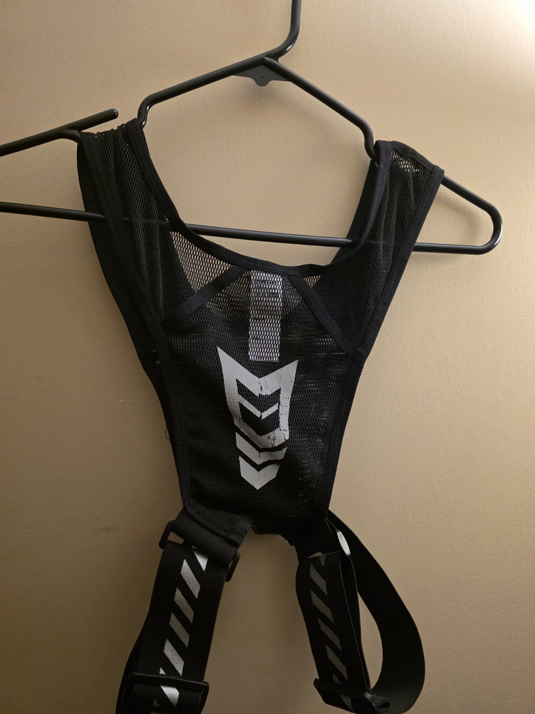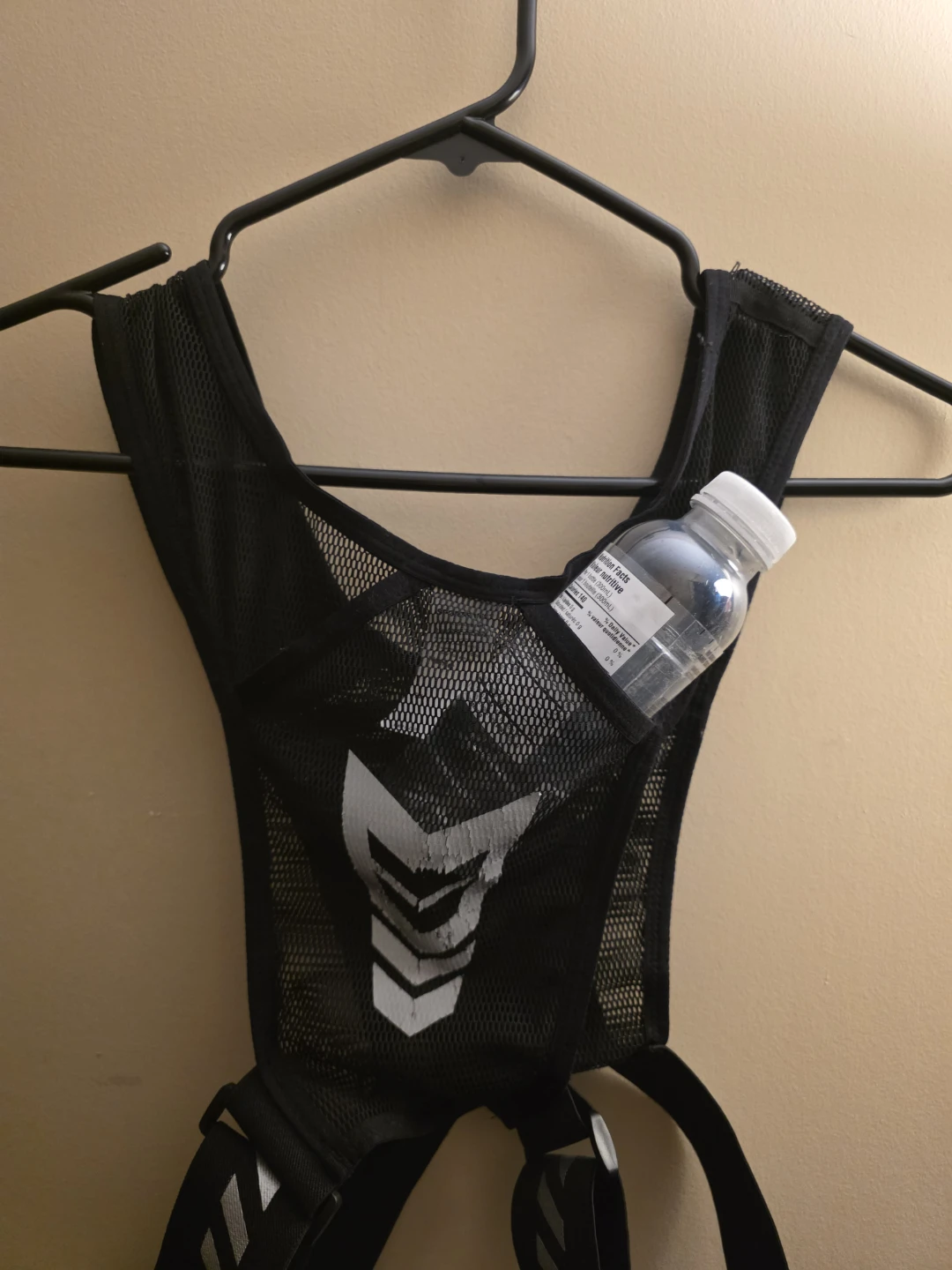 Selling a black running vest. It has a mesh design for breathability and adjustable straps for a comfortable fit. Perfect for carrying small water bottle , the pocket infront is ok for a phone , the pocket on the right for the keys