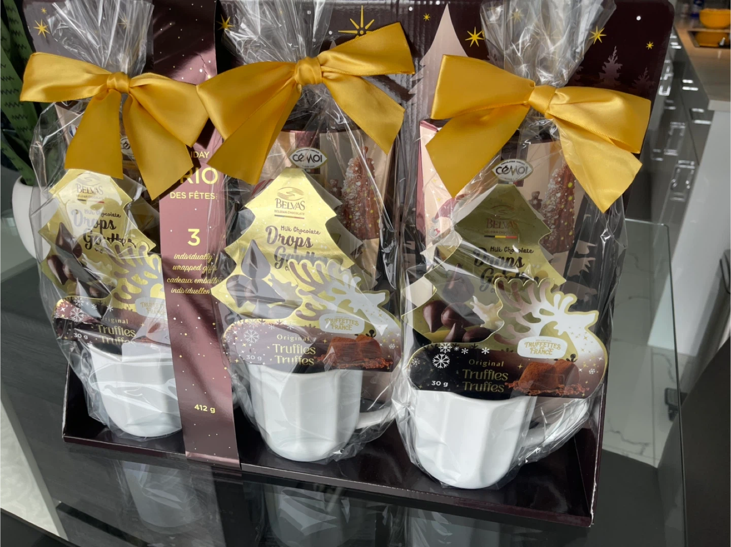 Selling a Belvas chocolate gift set! Each gift set contains Chocomod original cocoa-dusted truffles, Deavas milk chocolate drops, and Cemo's milk chocolate-covered marshmallow bears. It also includes a cute mug! The net weight is 412 g a perfect gift for the holidays or a birthday.
