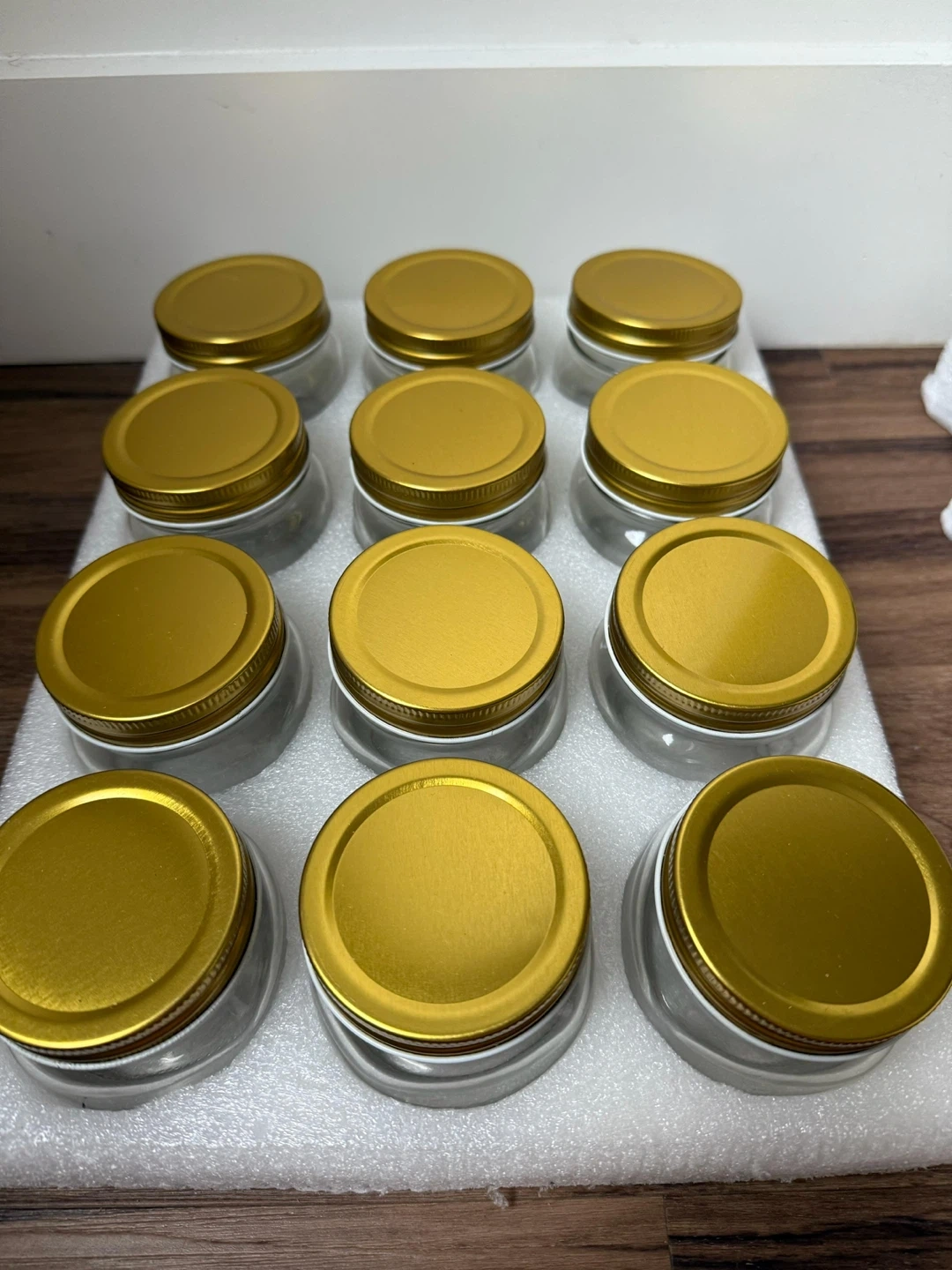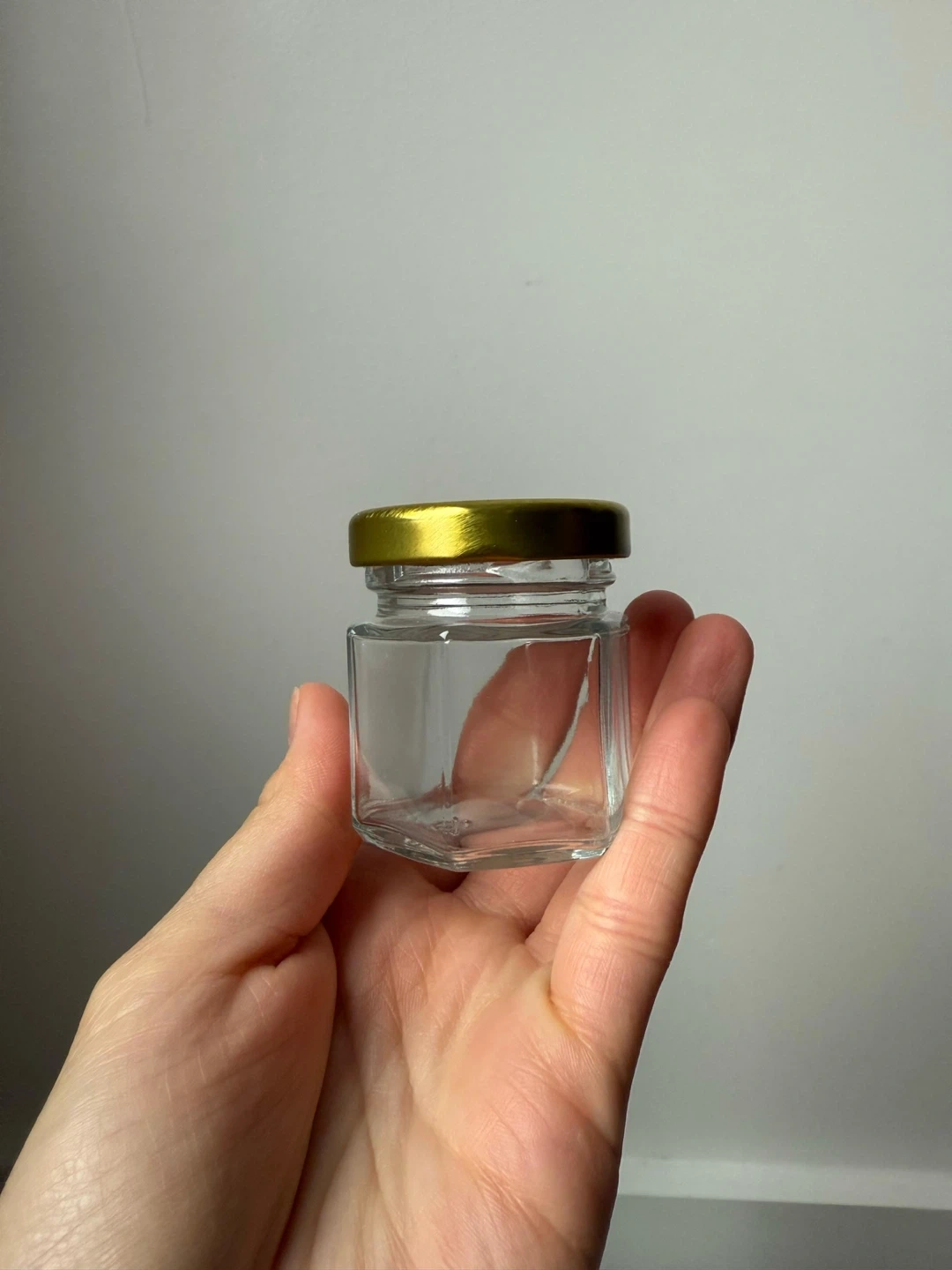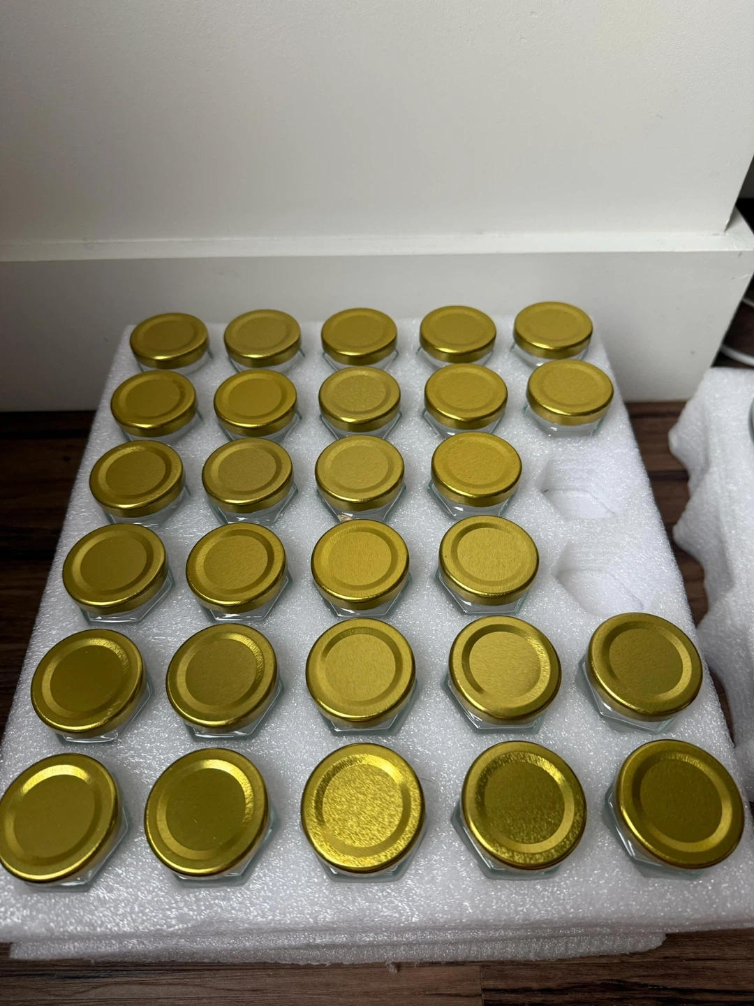 - 1.5oz Mini Glass Hexagonal set of 28 Honey Jars Golden Lids,