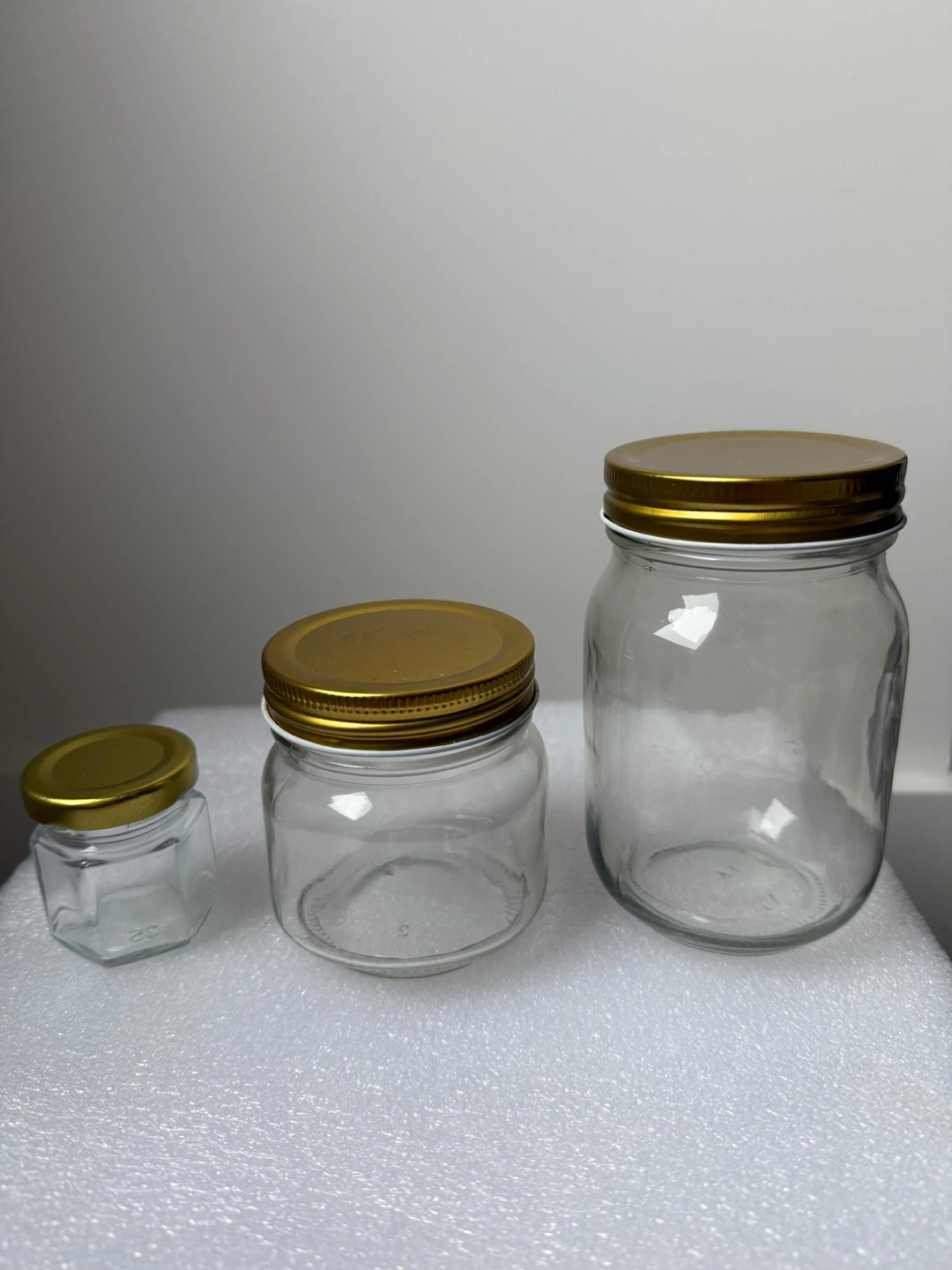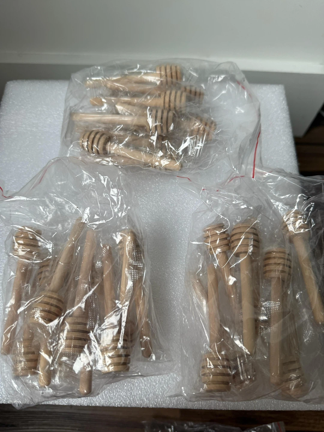 Selling a NEW set of glass jars with gold lids. They come with wooden honey dippers. Perfect for storing honey, jams, or other homemade goodies!
