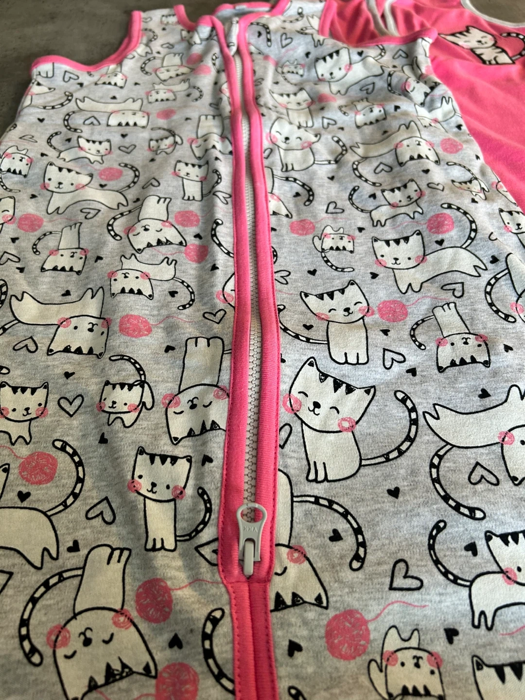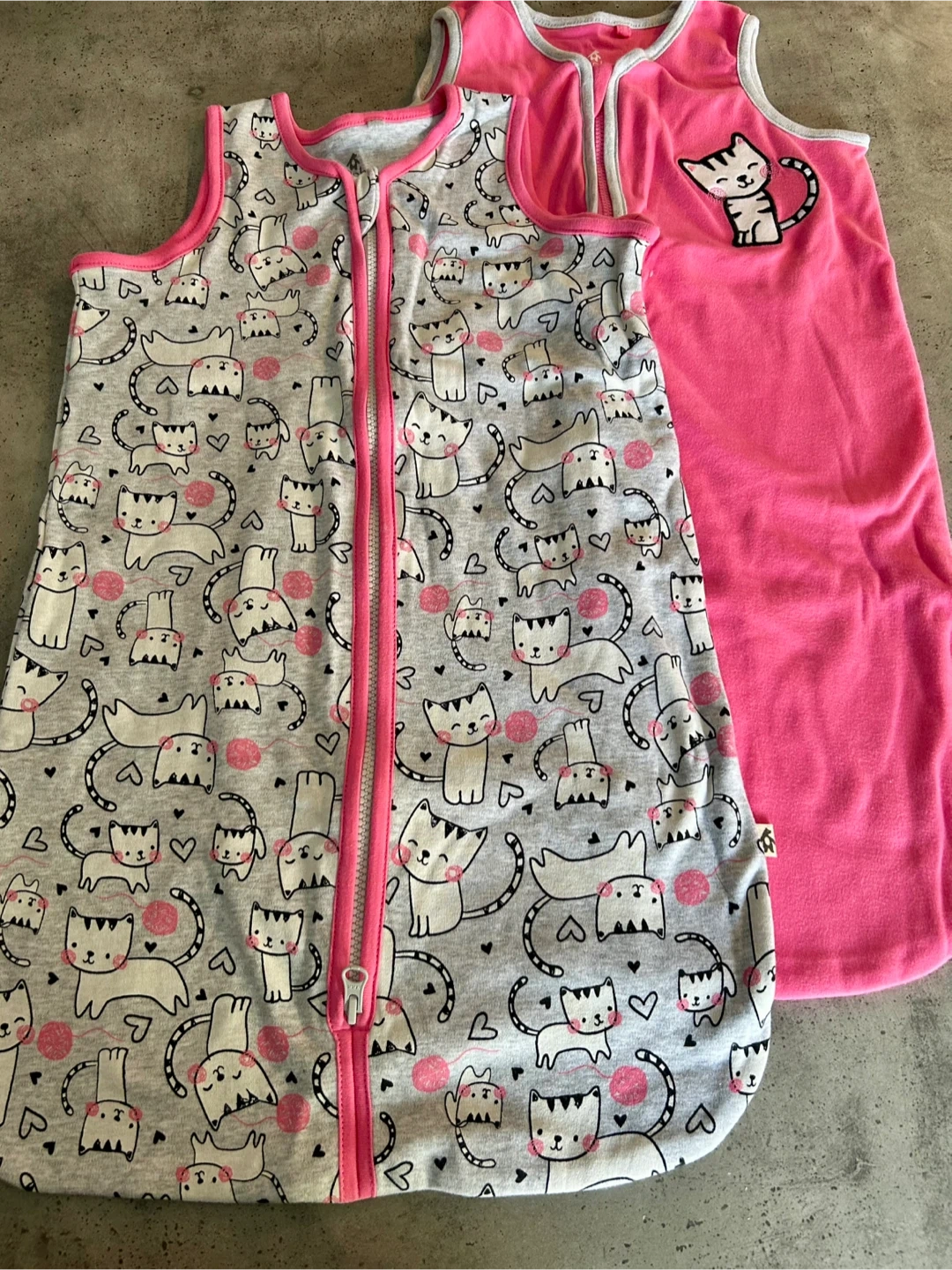 One is grey with a cute cat pattern, and the other is solid pink with a cat applique. Both are size 9-12M from Snugabye. Perfect for keeping your little one cozy and safe while they sleep.