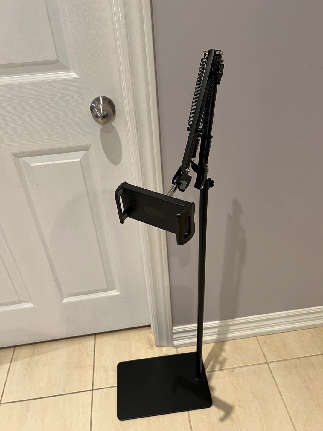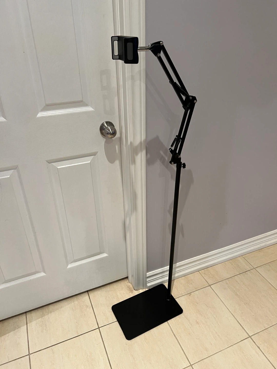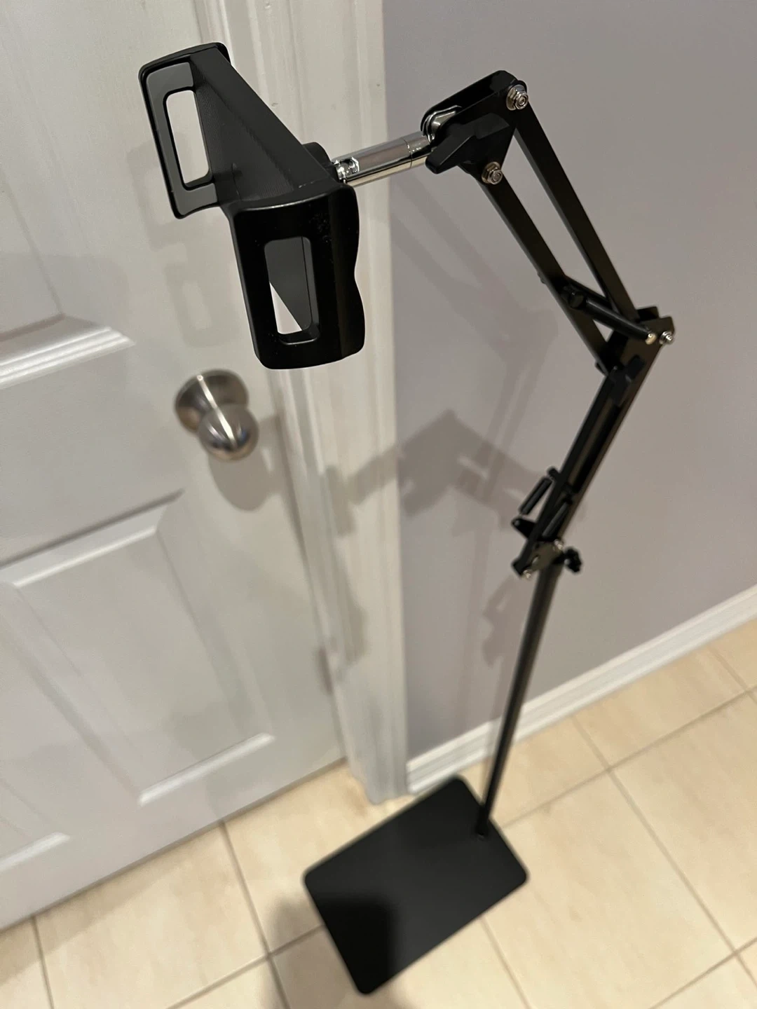 Selling a handy adjustable phone stand in black! It's in great condition and perfect for holding your phone while you watch videos or take photos. The base is approximately 15 inches long and the stand can extend up to 54 inches tall. It's super easy to adjust to the perfect height and angle for your needs