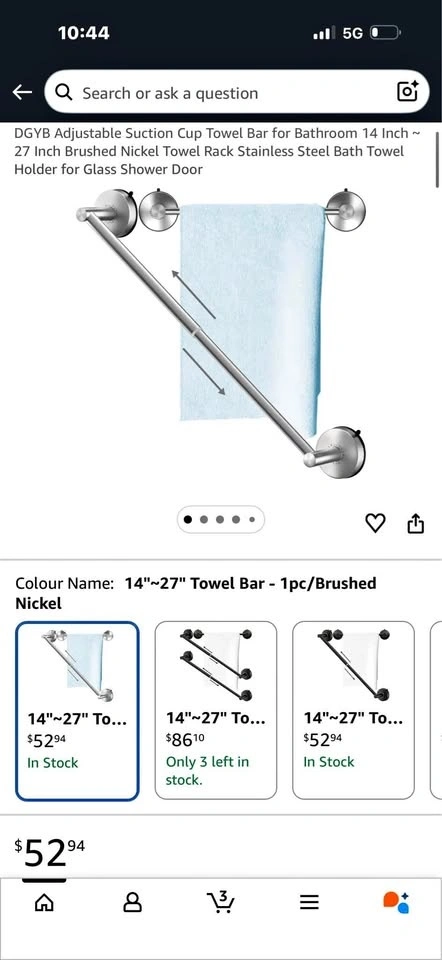 Brand new DGYB adjustable suction cup towel bar made of stainless steel with brushed nickel finish. Adjustable length from 14 inch to 27 inch. Perfect for bathrooms and glass shower doors.