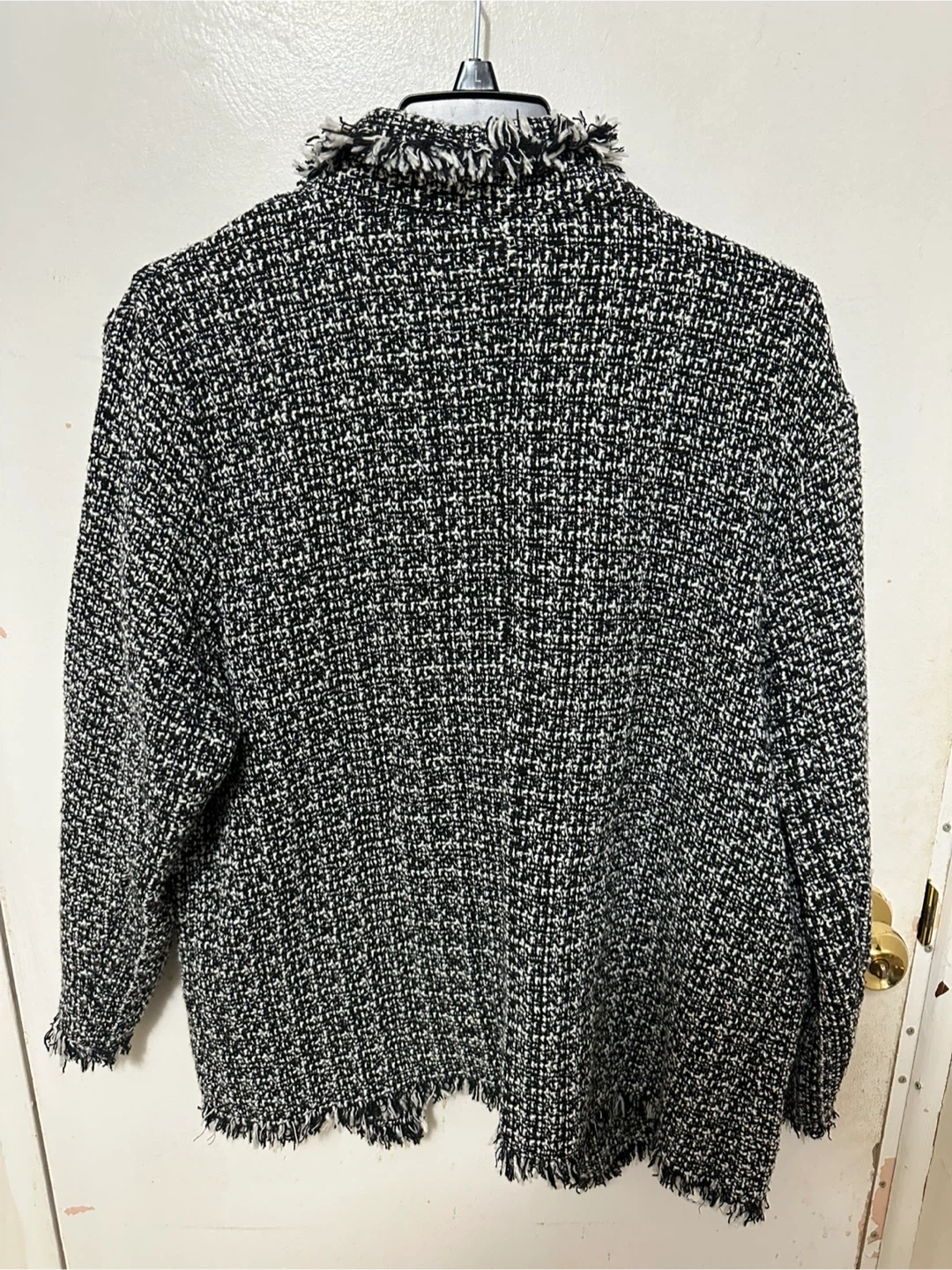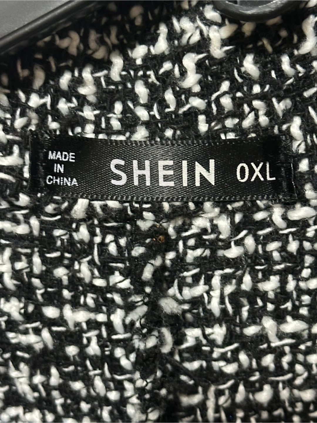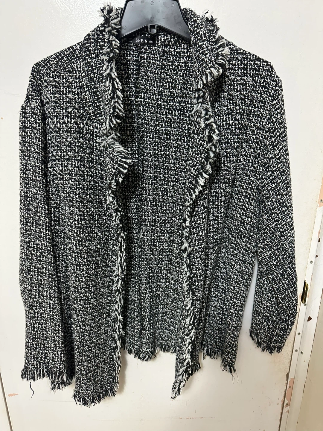 Selling a Shein tweed jacket in size 0XL. It features a classic tweed pattern and a fringed trim. Perfect for adding a touch of sophistication to any outfit! Worn once