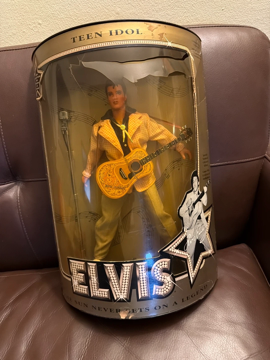 Selling an Elvis Presley Teen Idol doll. The box has some wear and tear, but the doll is in good condition. "The sun never sets on a legend"