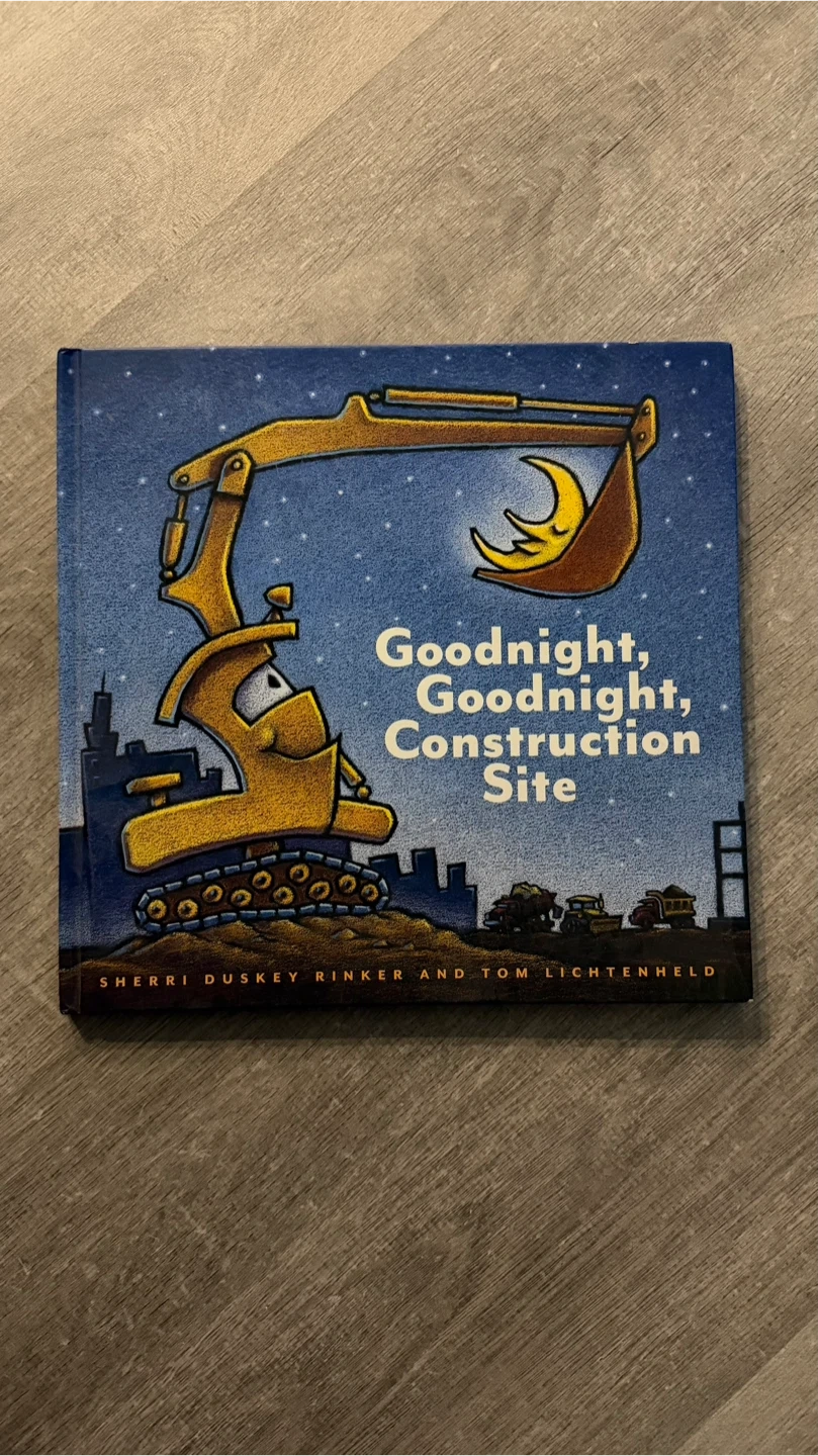 Hardcover "Goodnight, Goodnight, Construction Site" by Sherri Duskey Rinker and Tom Lichtenheld. A sweet bedtime story about construction vehicles settling down for the night. Perfect for little ones who love trucks and diggers.