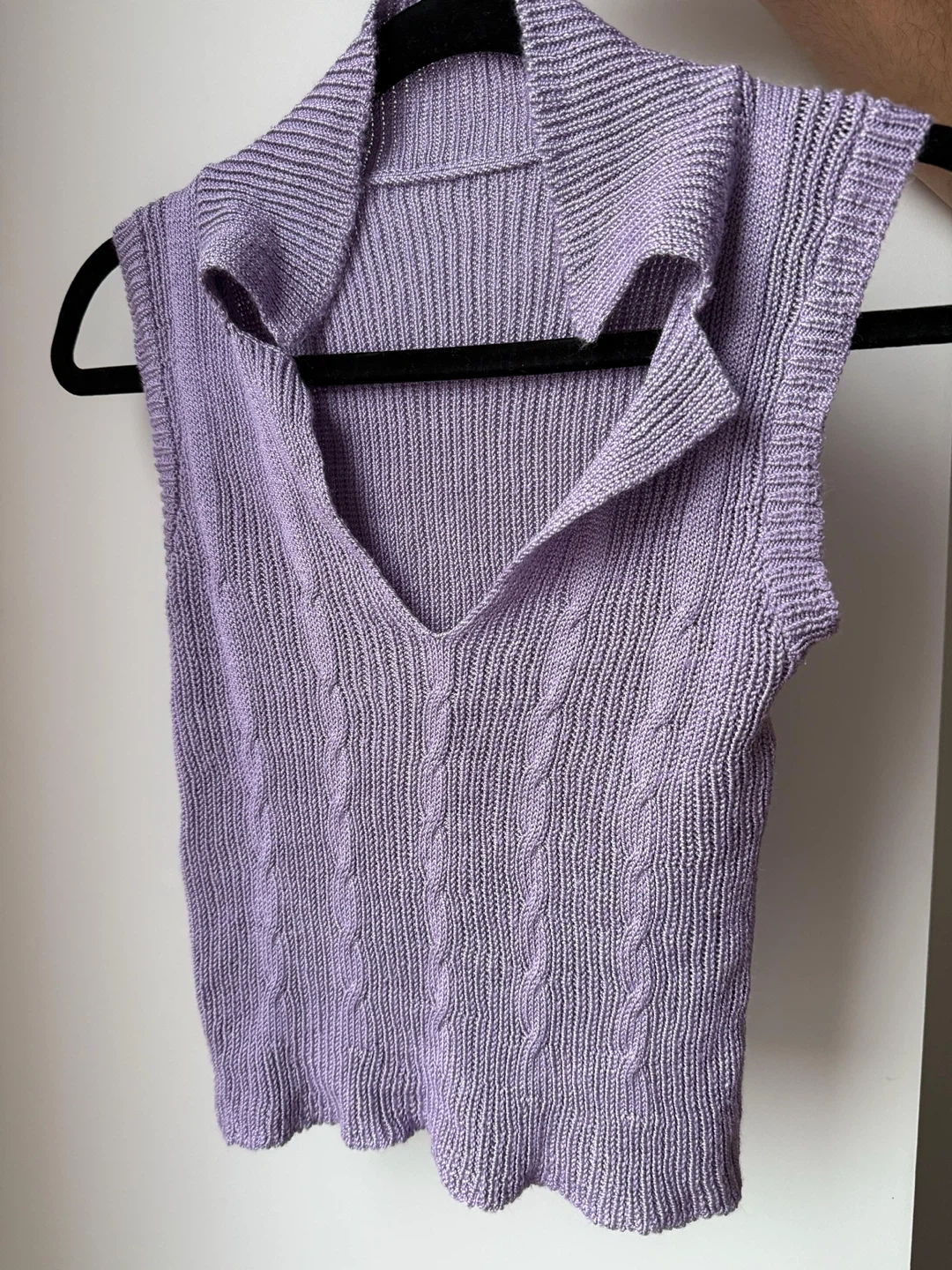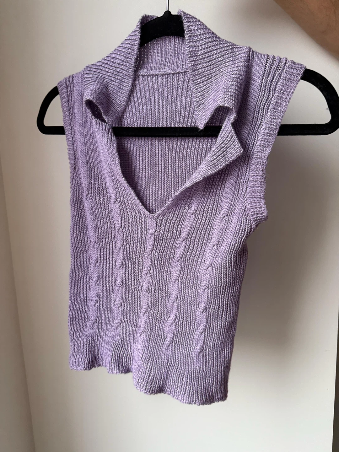 Selling a lilac knit sleeveless top! The material is soft and comfortable, perfect for layering or wearing on its own. It's in great condition and ready for a new home