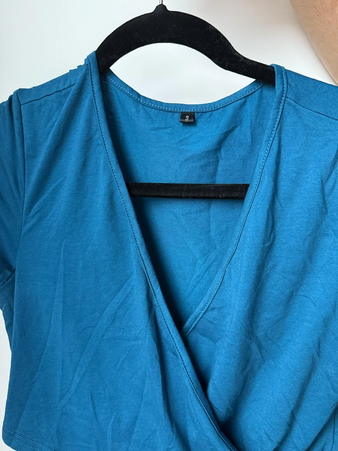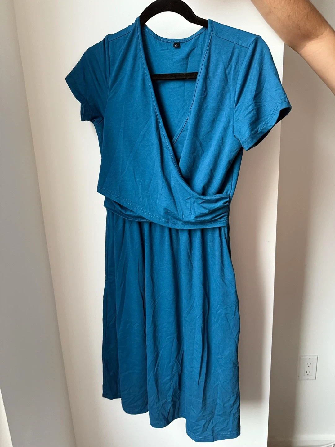 Cute teal wrap dress in size small. Perfect for a casual day out or a summer event. The wrap style is super flattering and comfortable!