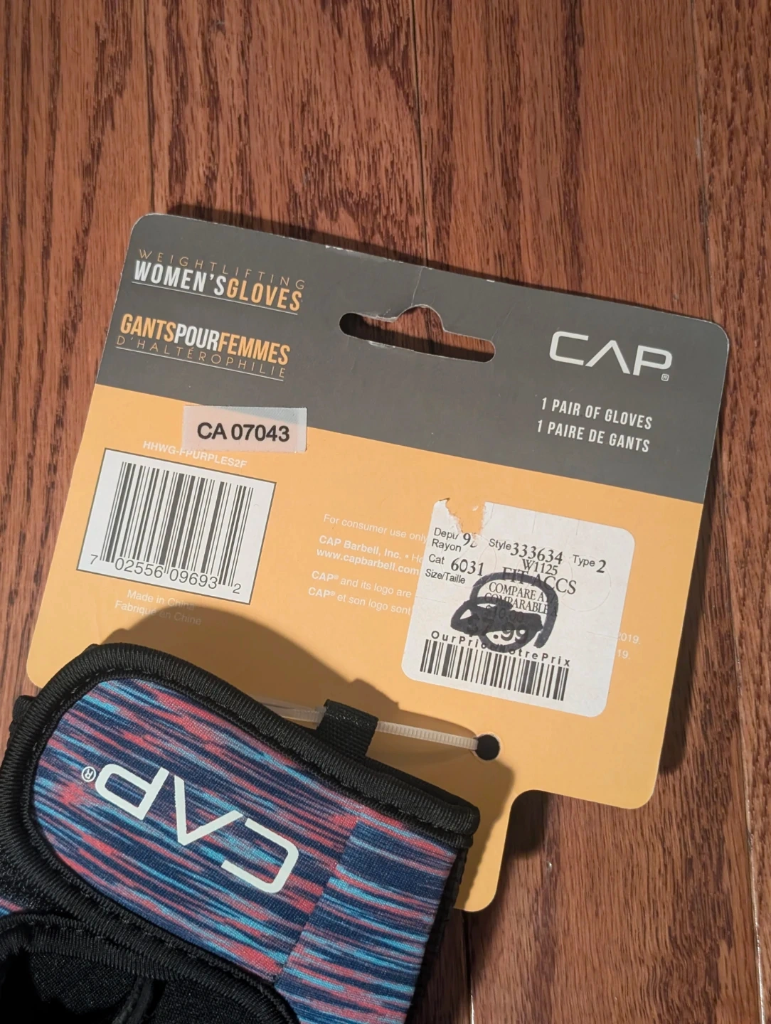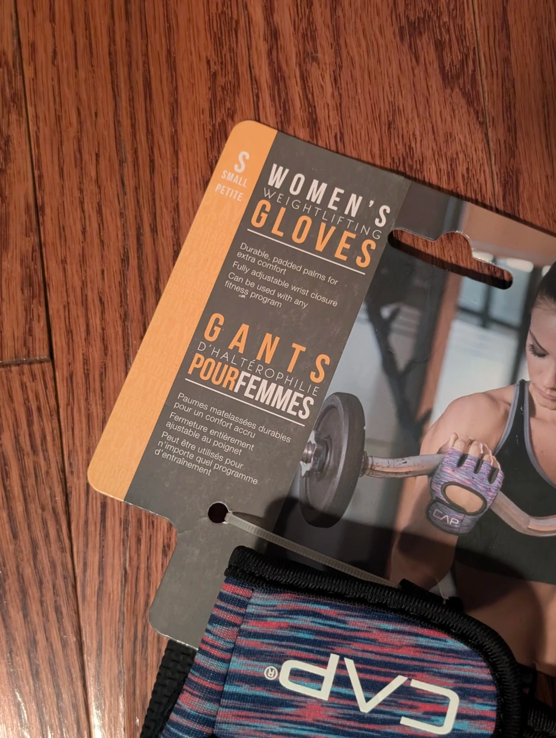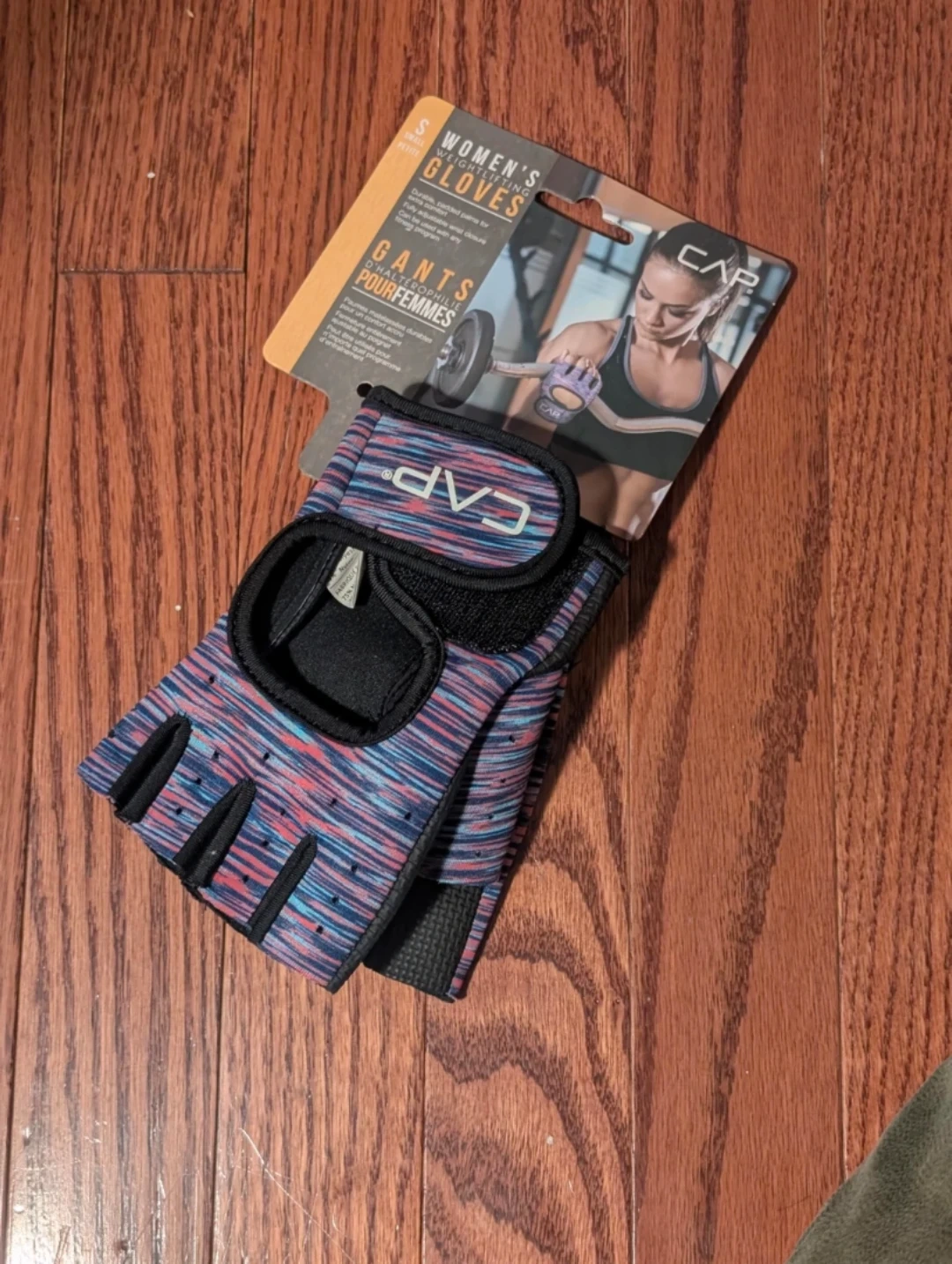 New unopened women's weightlifting gloves. Fingerless. Adjustable Velcro wrist. Neoprene and rubber grip.