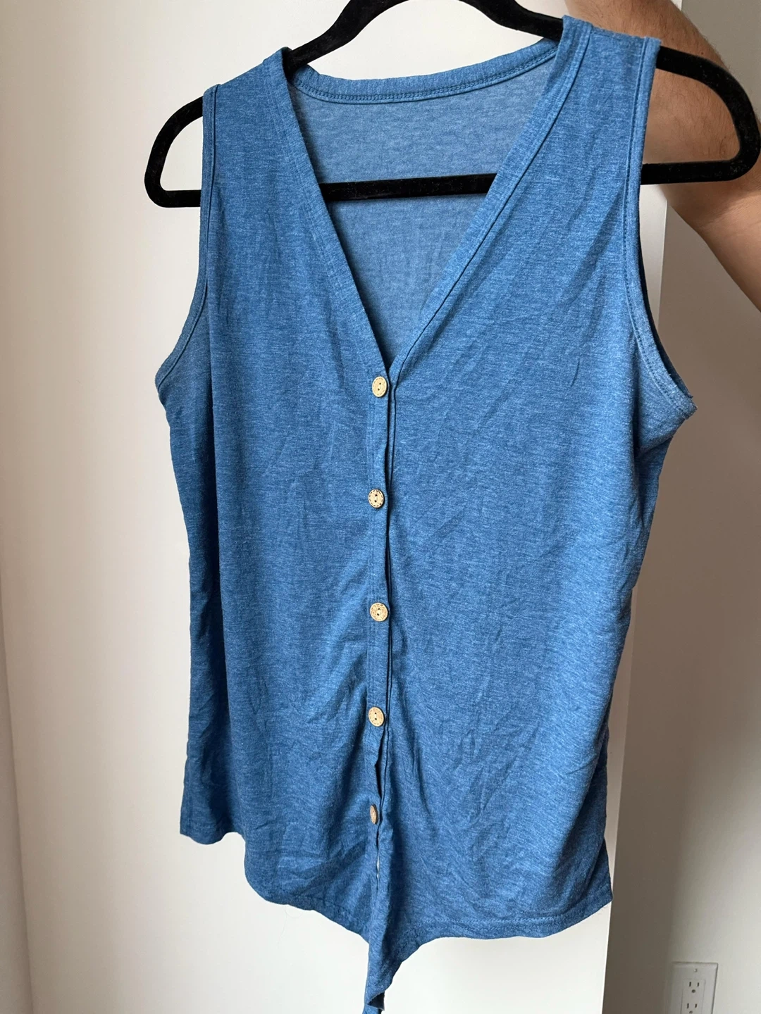 Here's a cute blue sleeveless top with button-down detailing! It's in great condition and ready for a new home. The material has a nice texture, and it's perfect for layering or wearing on its own