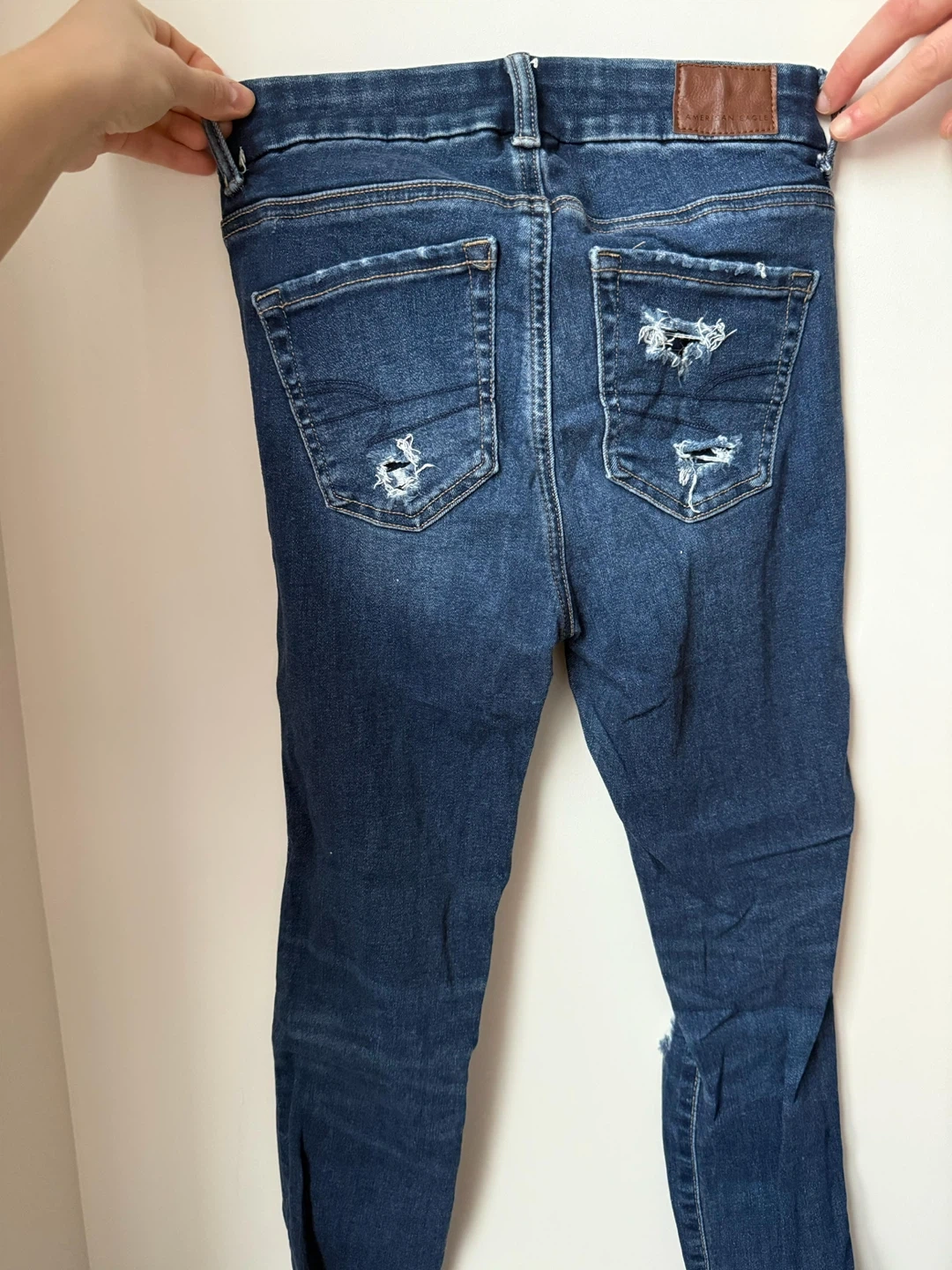 Selling a pair of American Eagle Luxe Stretch jeans. They are a dark wash and feature ripped detailing. Perfect for a casual look!