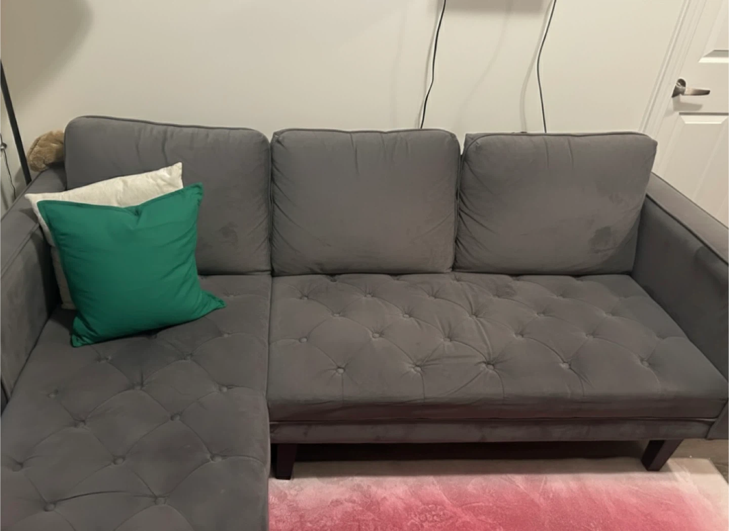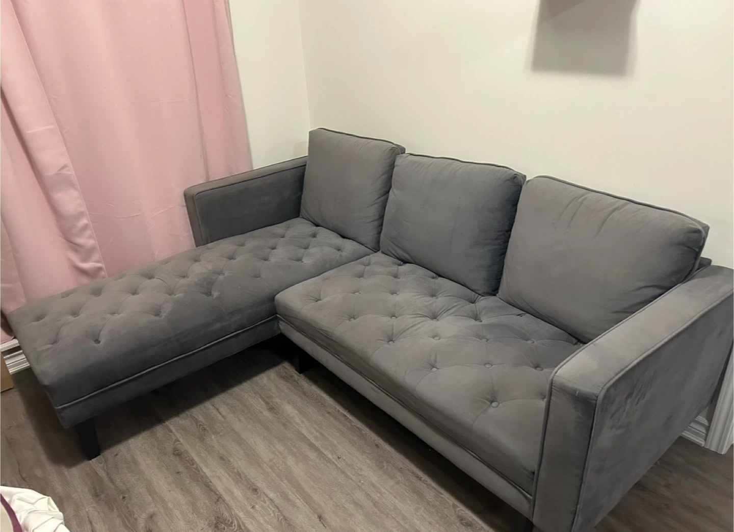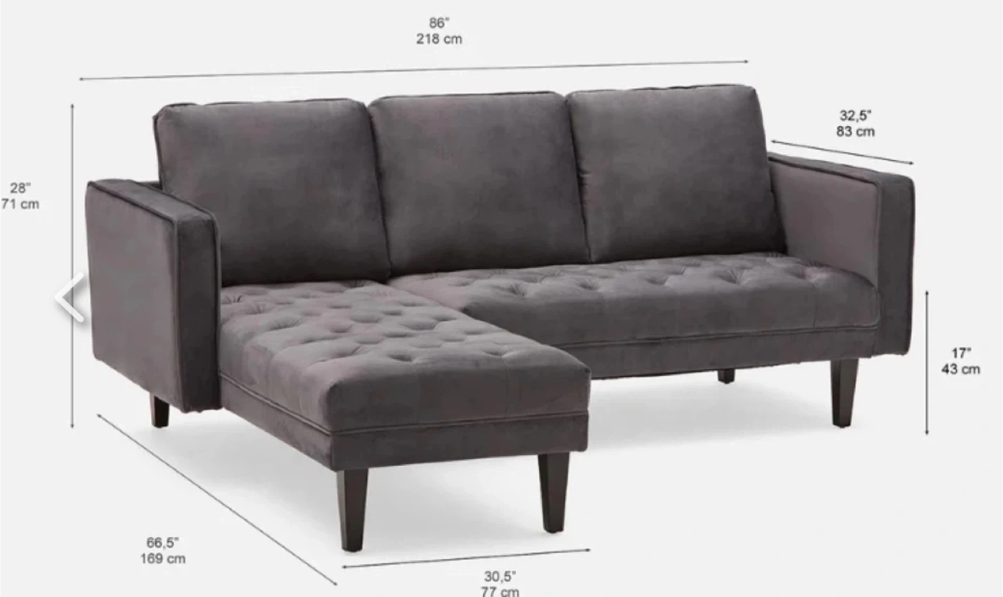 * Grey velvet sectional from Structube. Chaise is interchangeable (left or right).