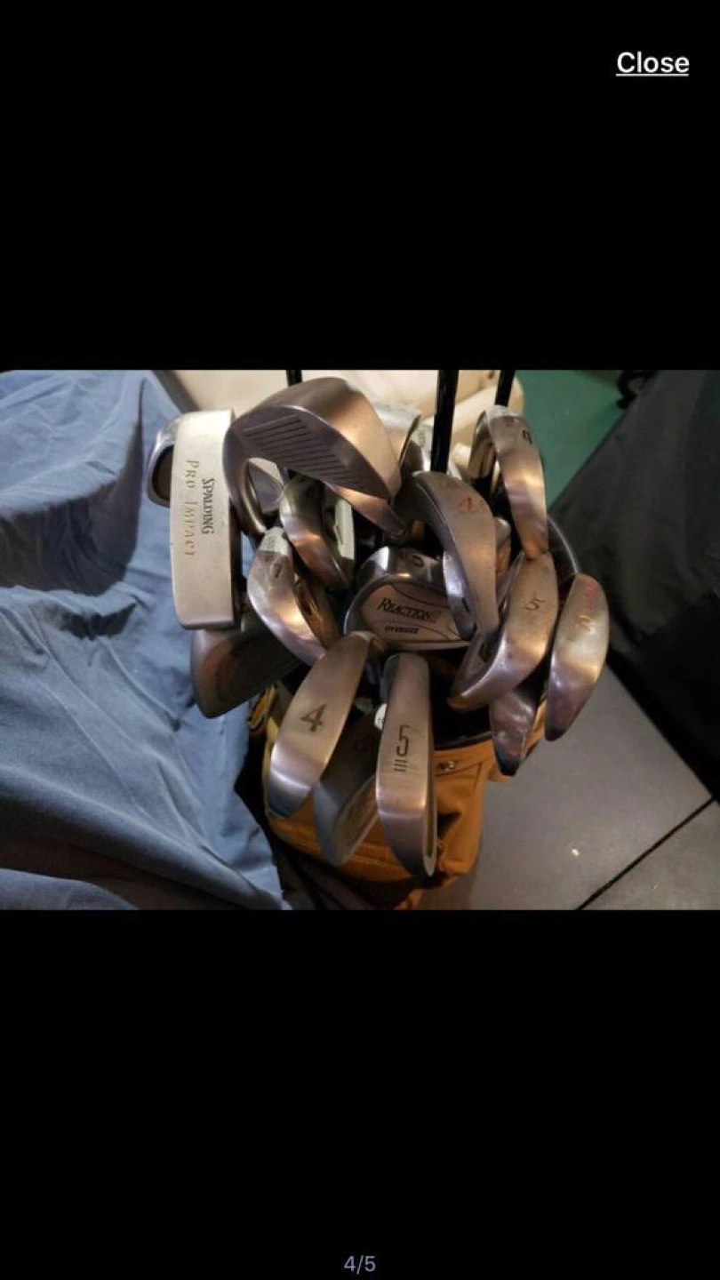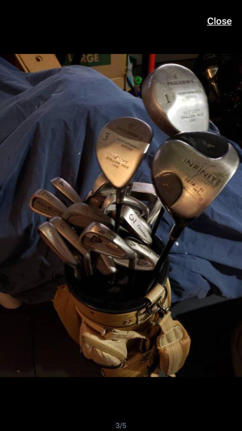 Bag of mixed golf clubs as shown in picture, plus the bag. Unfortunately, don’t know too much about them but mostly right handed with a few left handed clubs. Bag is in good working condition.