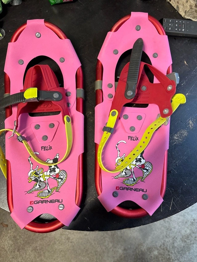 I'm offering a pair of new Garneau Felix snowshoes, perfect for young adventurers ready to explore the winter wonderland. These snowshoes are designed with a vibrant pink and red frame, coupled with a fun Felix the dog design, making them both functional and visually appealing. The yellow straps are easy to adjust, ensuring a snug and secure fit for little feet. ,are ready for snowy trails.