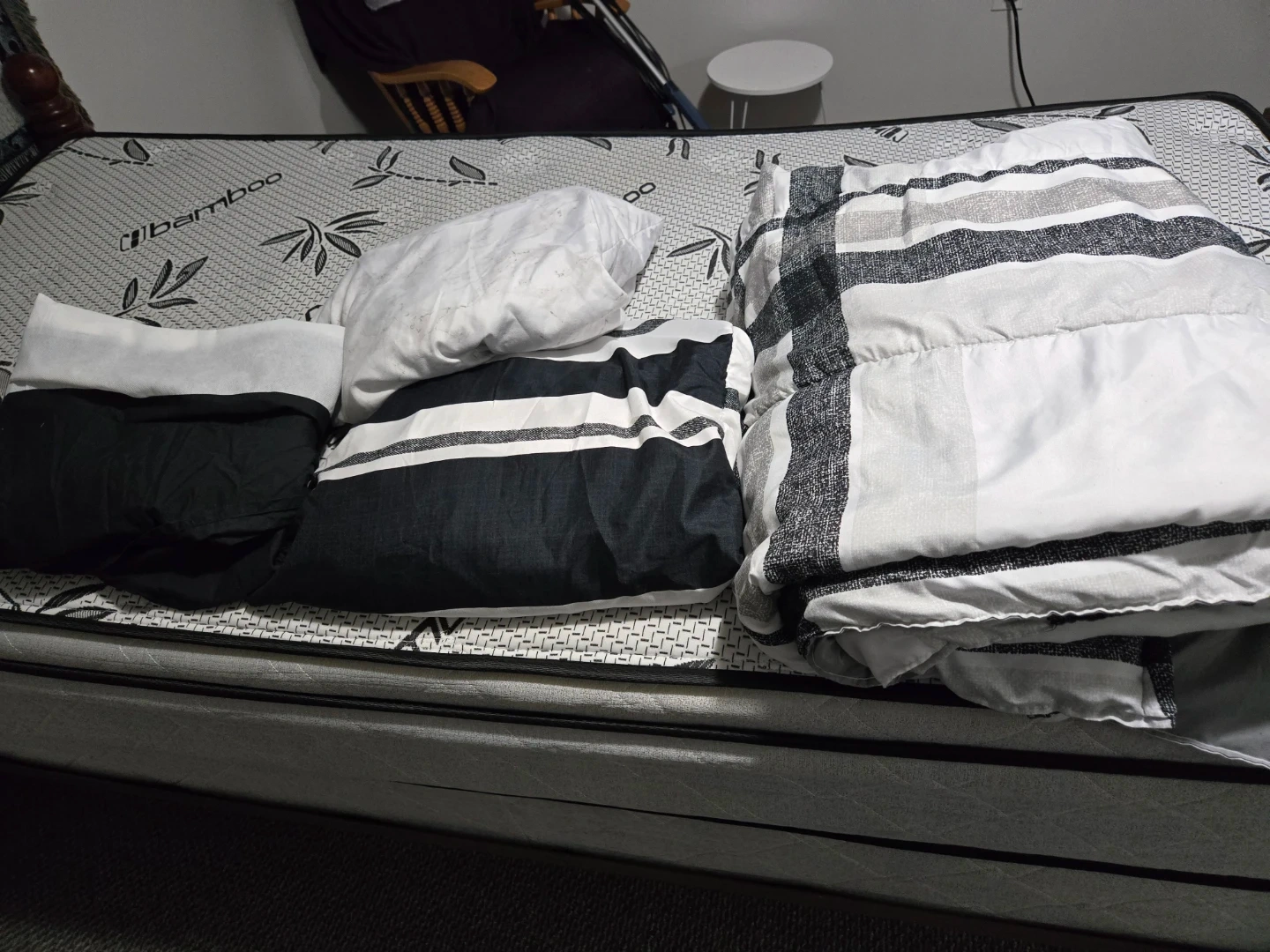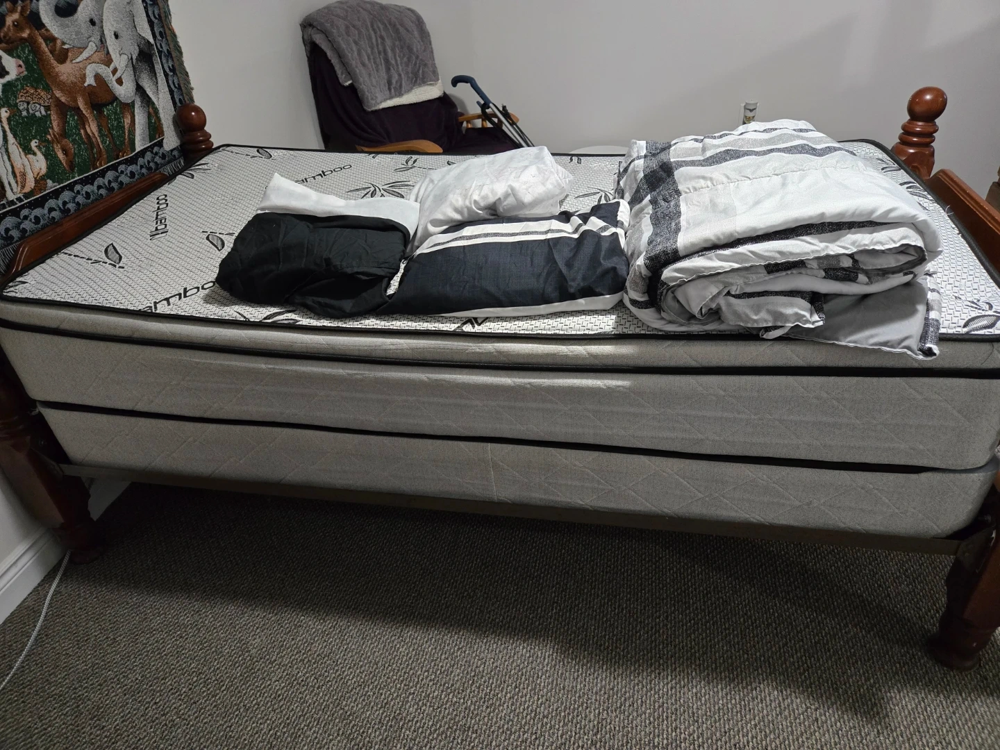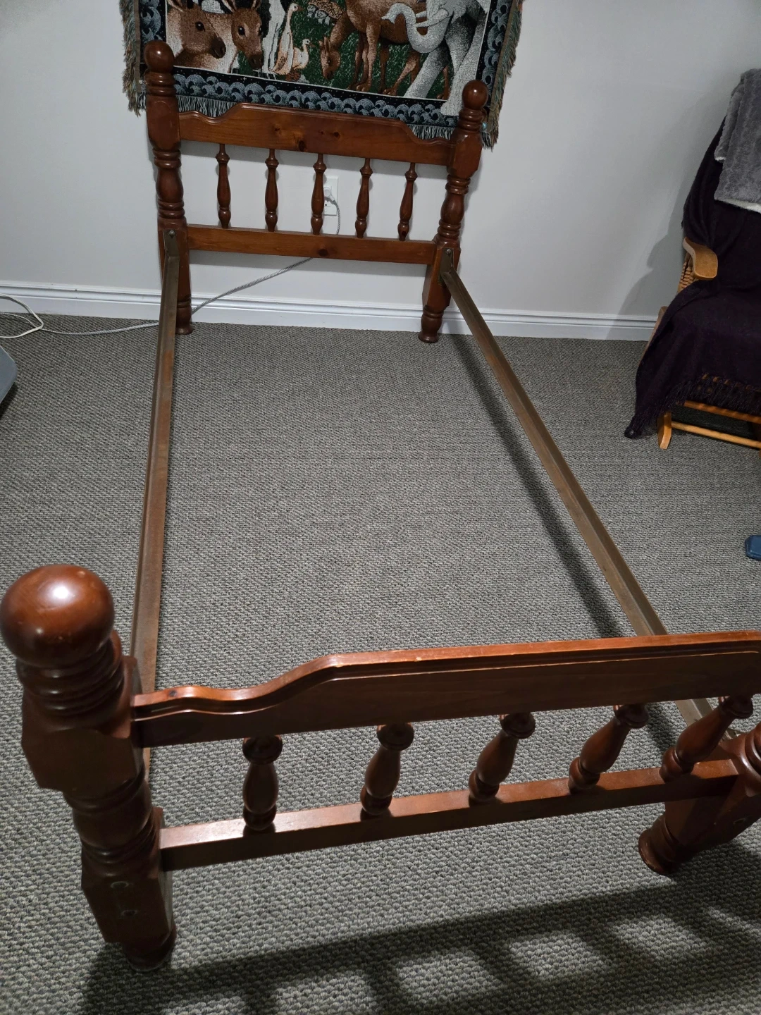 Selling a twin bed frame and mattress. The bed frame is made of wood and the mattress(bought 1 year ago) and box spring (2 years old) is included. There is some wear and tear on the box spring. Bed frame was purchased at the habitat for humanity restore. Comforter, 3 sheet sets and a bed skirt is included. Must be picked up...bed frame will be disassembled for moving.