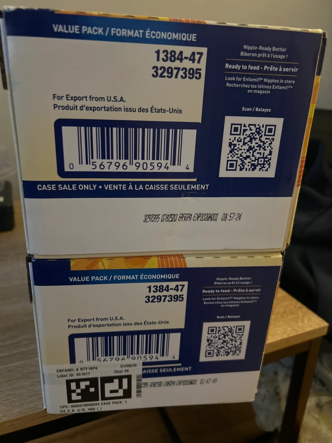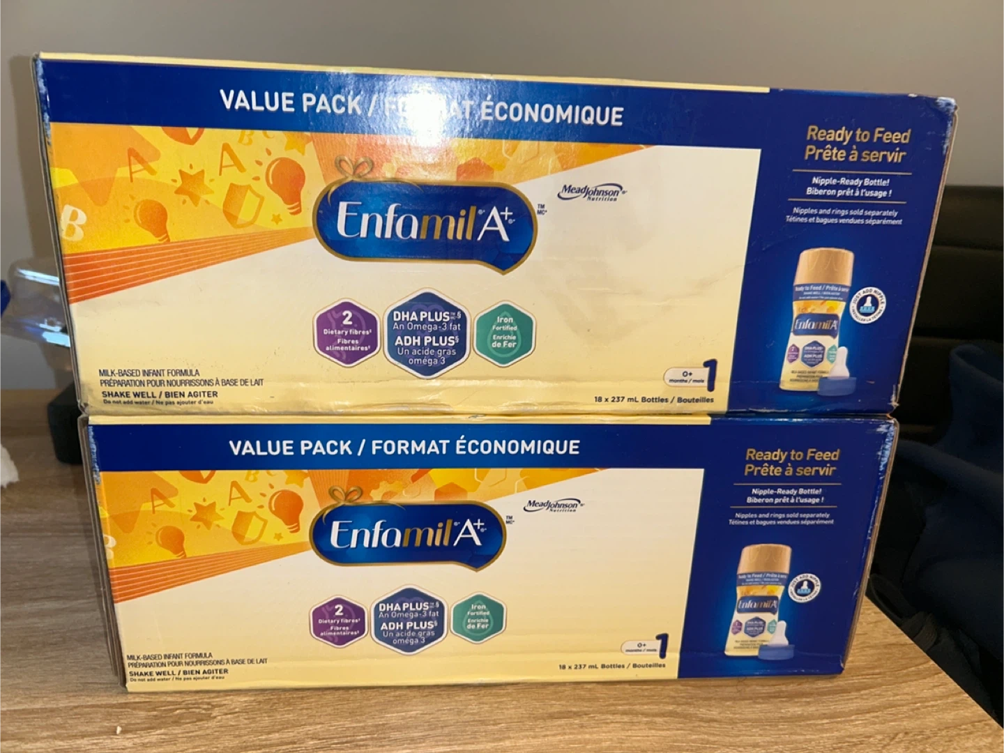 Selling two Enfamil A+ Value Packs! Each pack contains 18 x 237 mL bottles of ready-to-feed infant formula. Perfect for newborns (0+ months).