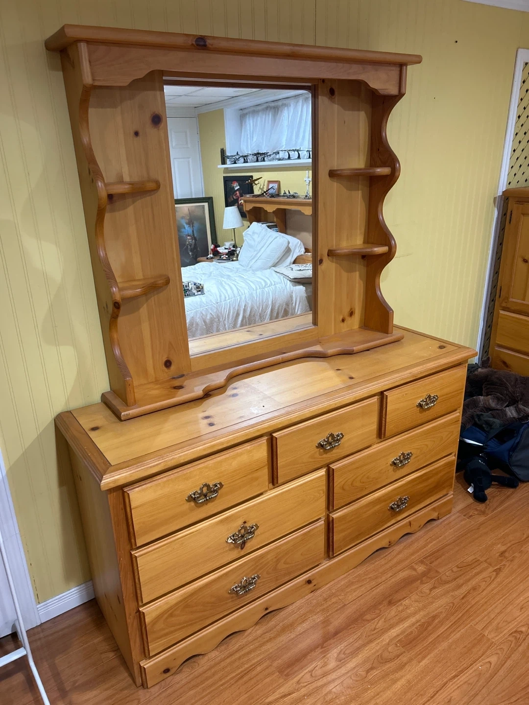 Selling a wooden dresser with an attached mirror. It has a total of seven drawers and a decorative mirror with small shelves on either side. Perfect for adding storage and a touch of classic style to your bedroom!
