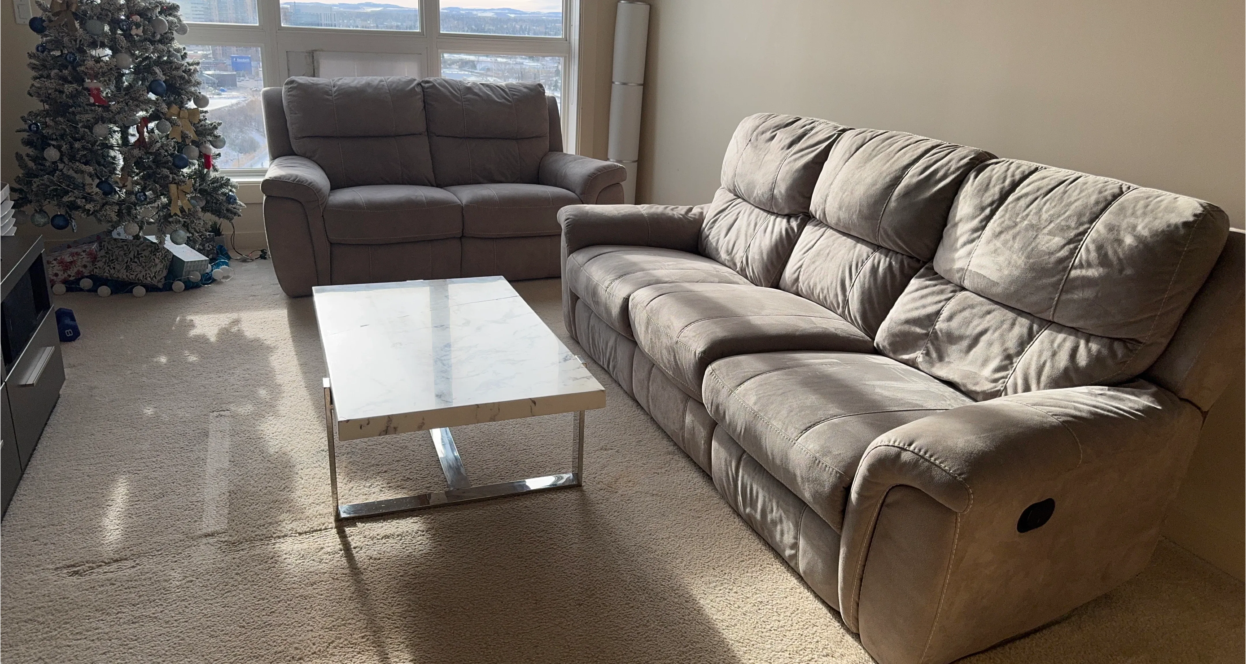 Selling a comfy recliner sofa set, including a three-seater sofa and a two-seater loveseat. Also comes with a stylish coffee table with a faux marble top and chrome legs for FREE!