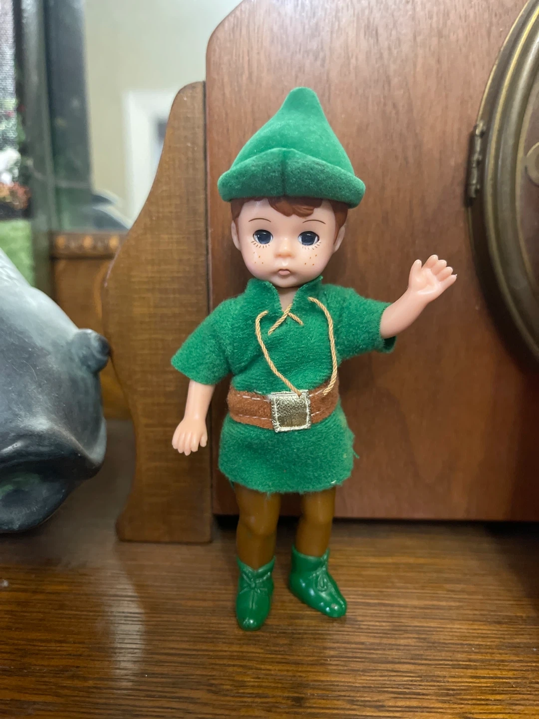 Here's a vintage Peter Pan doll dressed in a charming green outfit! It's a lovely collectible piece. Movable arms and legs and eyelids open and close. About 4 inches tall.
