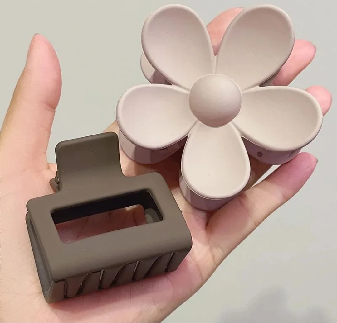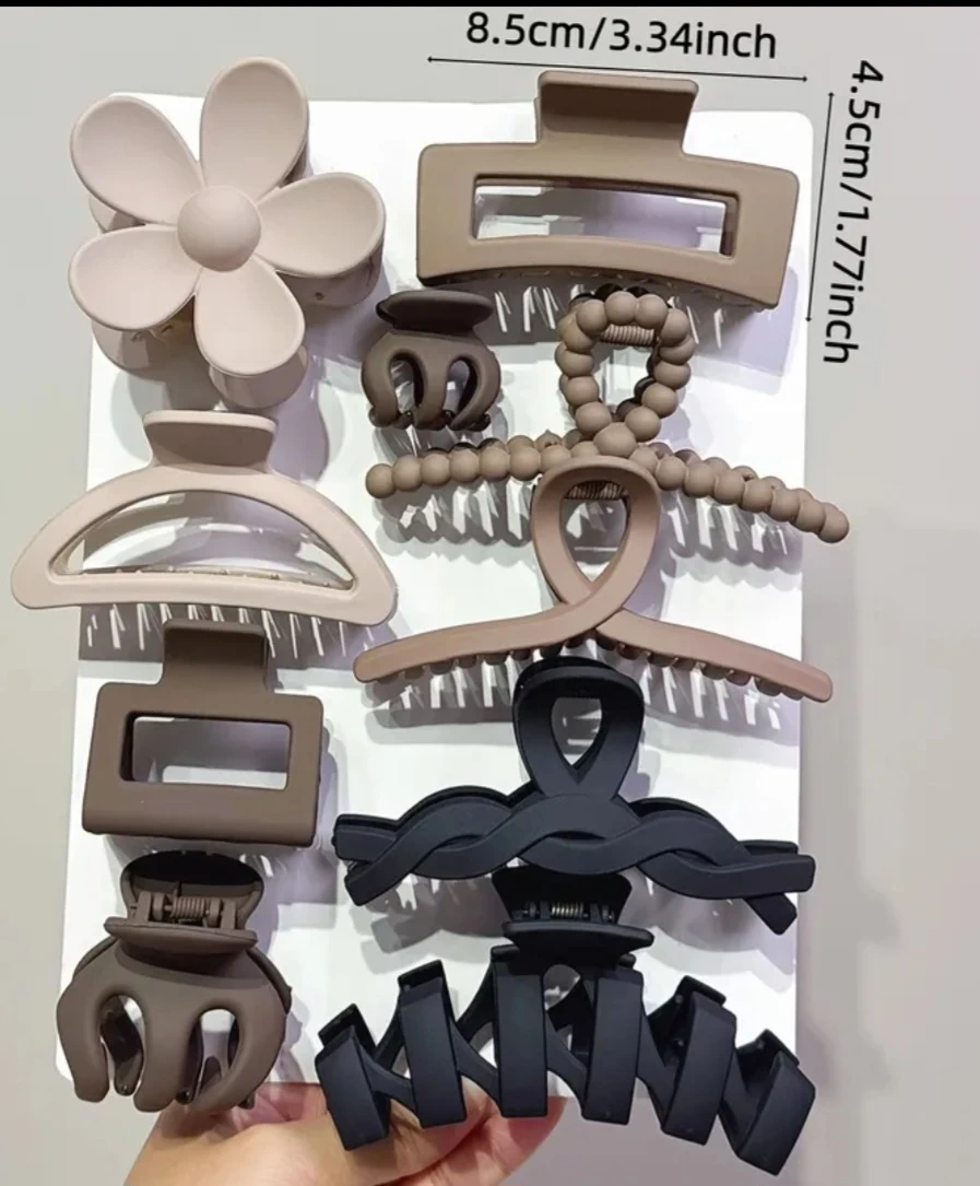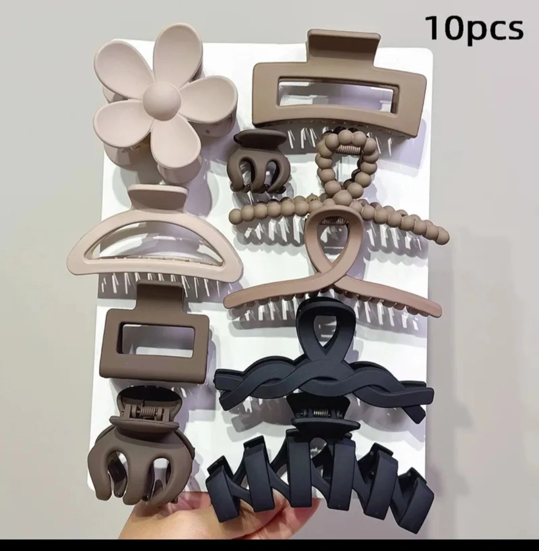 Here's a set of 10 hair claw clips in various neutral tones, mutltiple sizes! They're perfect for adding a touch of style to any hairstyle. The clips come in different shapes and sizes, as you can see in the photos, including flower and braided designs.