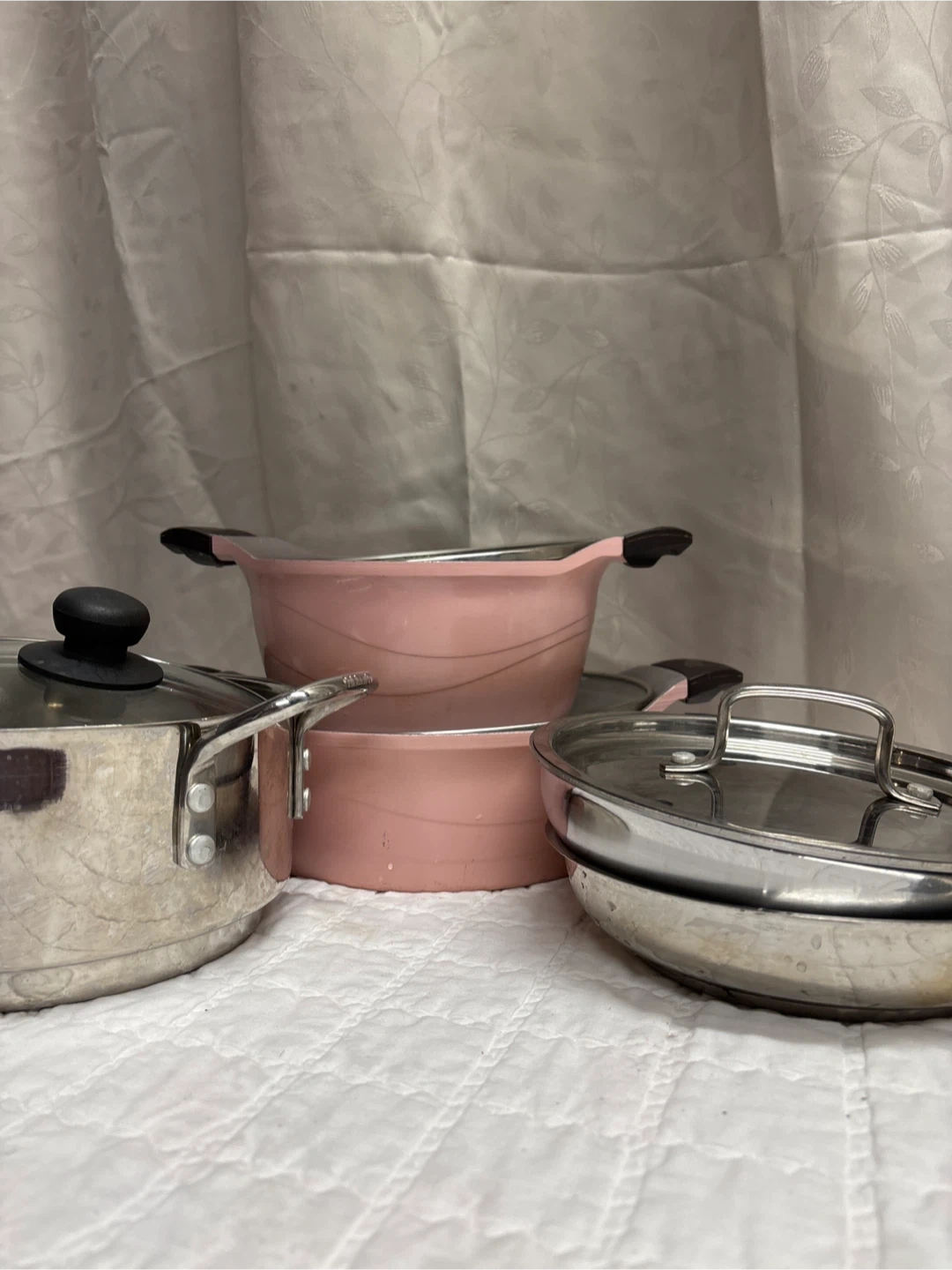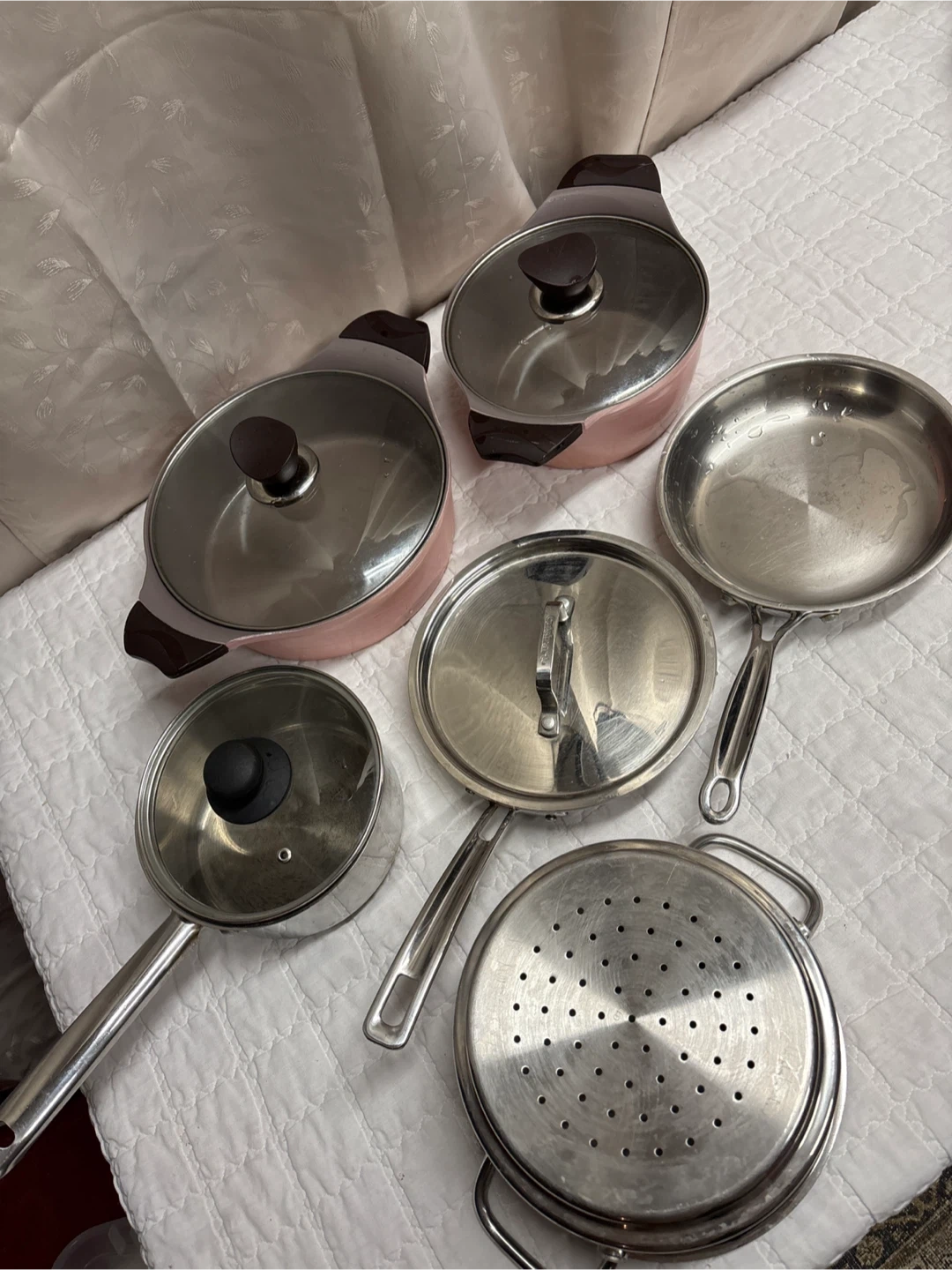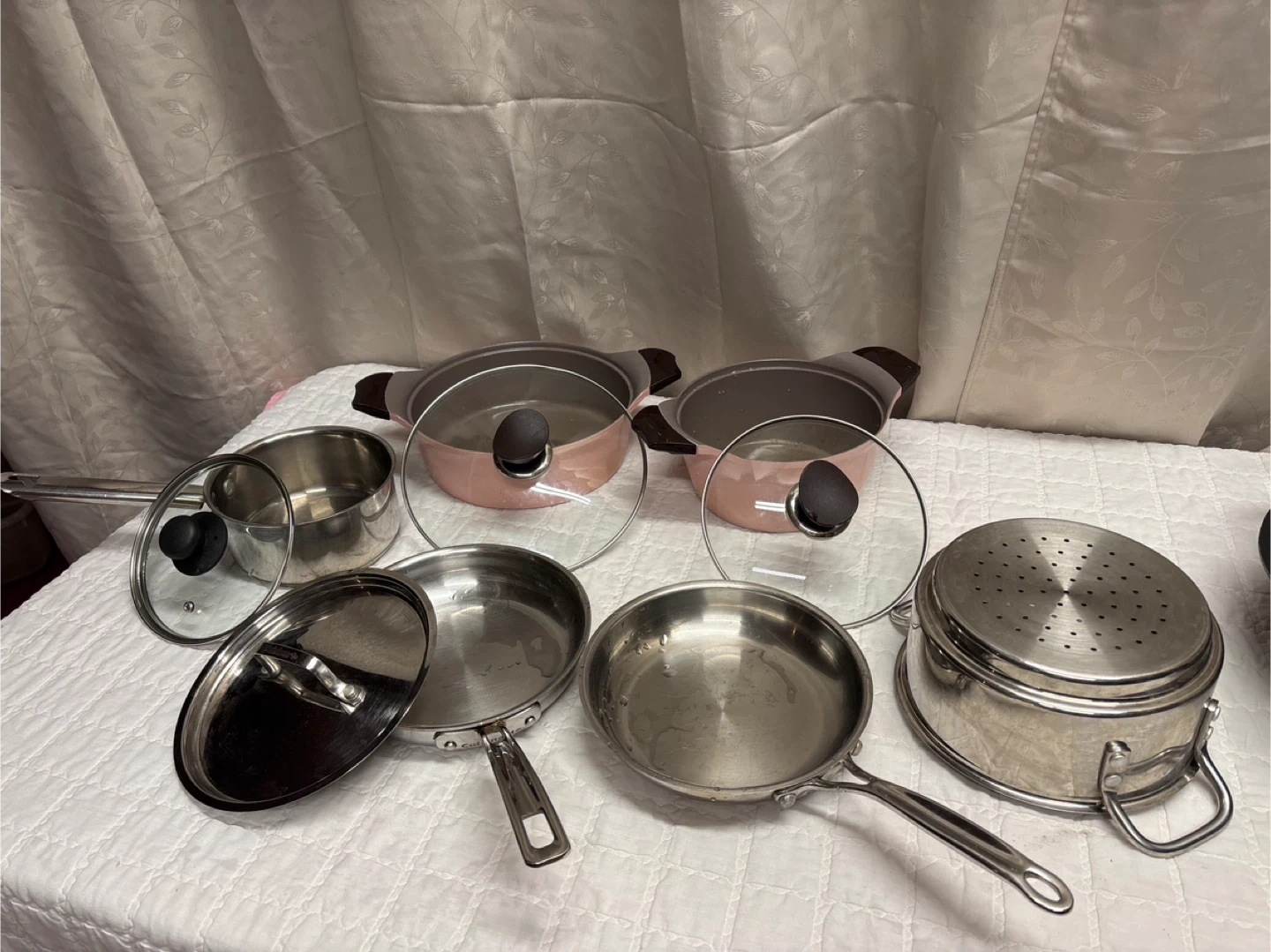 Selling a used cookware set that includes a variety of pots, pans, and a colander. This set is perfect for anyone looking to expand their kitchen supplies or for someone just starting out! All items are in good used condition and ready for a new home. Includes lids for some of the pots and pans