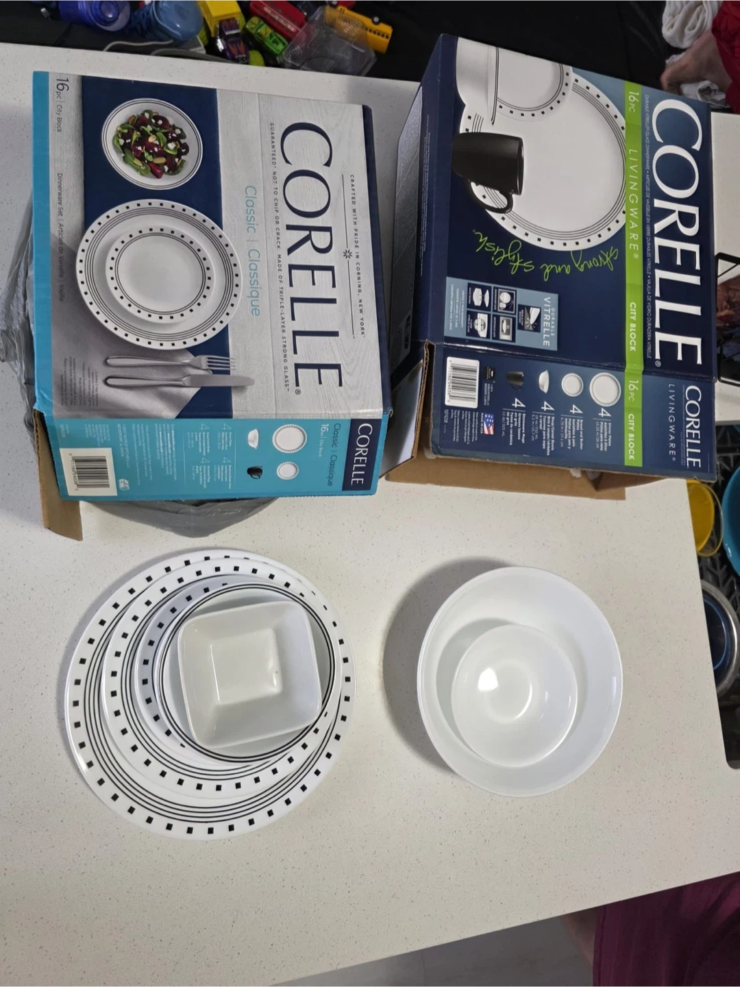 Selling a brand new Corelle Classic 16-piece dinnerware set, still in its original box! This set is known for being lightweight and durable. It includes everything you need for a service of four: dinner plates, salad plates, bowls, and mugs. Perfect for everyday use or special occasions!