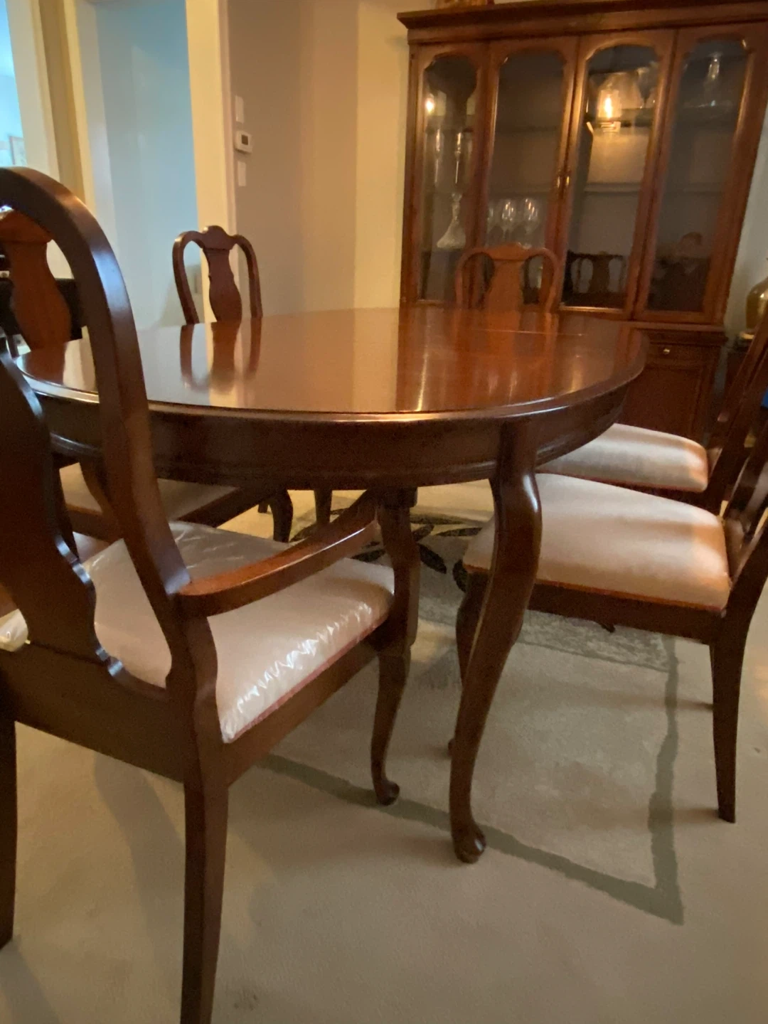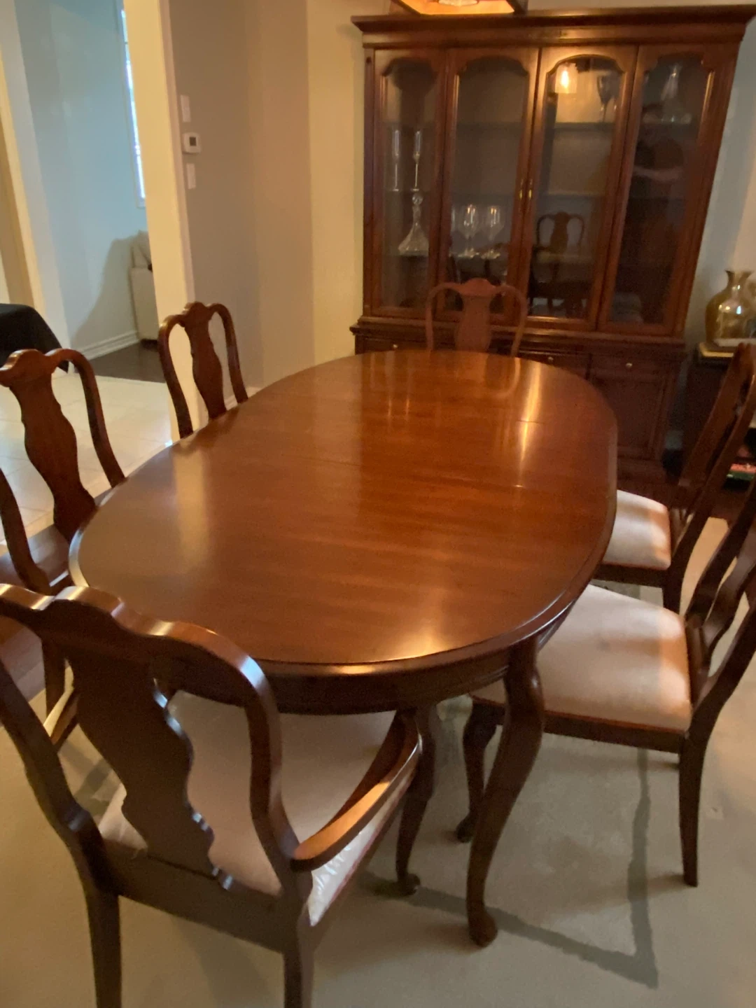 Beautiful solid wood dining room set featuring an extendable oval table, 6 matching chairs, and a two-piece china cabinet (top hutch and bottom base). Classic, timeless design with a rich wood finish that suits both traditional and transitional spaces.