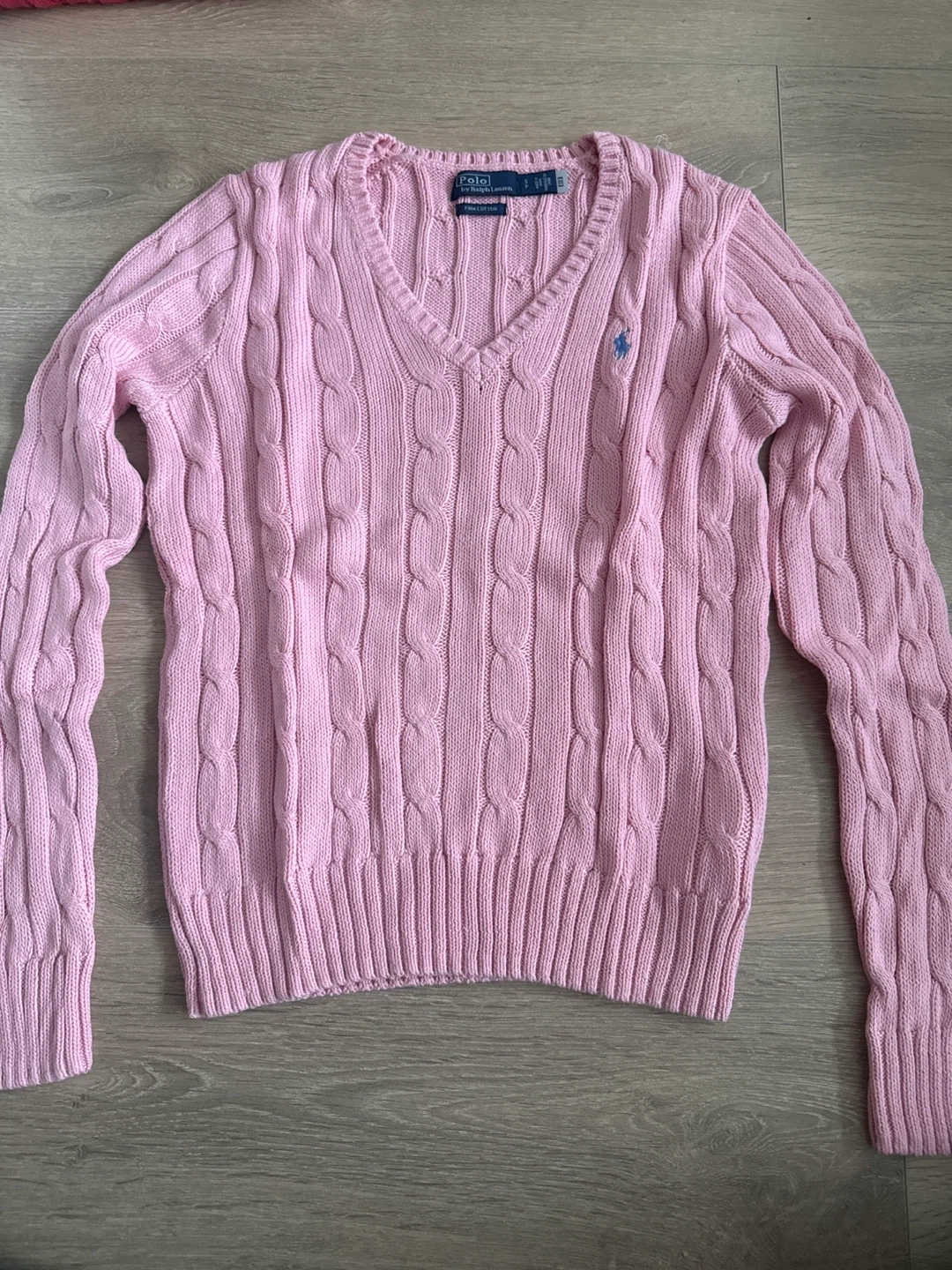 A lovely pink cable knit sweater from Ralph Lauren! It's a size small and made of 100% cotton. Perfect for adding a pop of colour to your wardrobe. Its never worn.