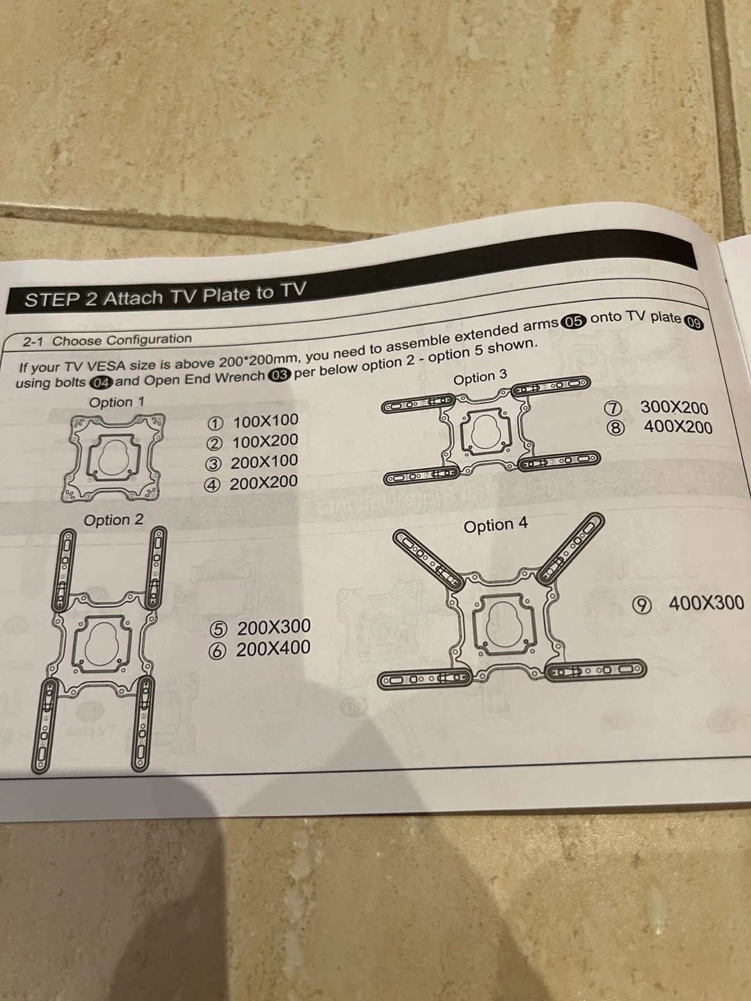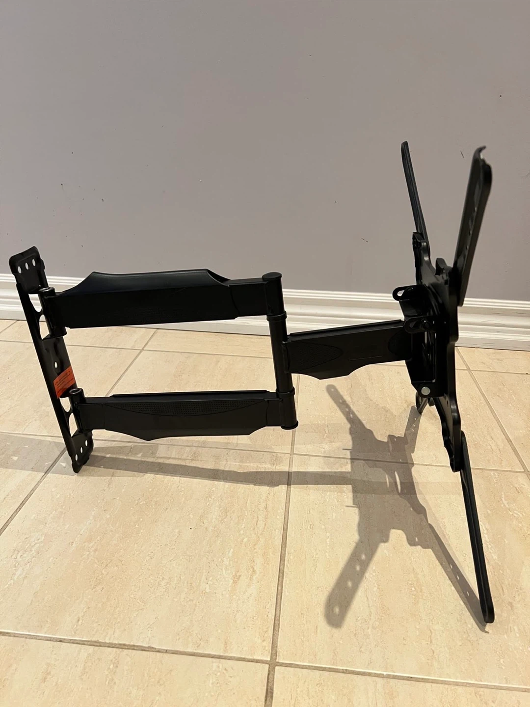 Selling a UX-Mount full motion TV wall mount in black. It appears to be in great condition. The included instruction manual shows VESA compatibility options for various TV sizes, including 100x100, 100x200, 200x100, 200x200, 200x300, 200x400, 300x200, 400x200, and 400x300