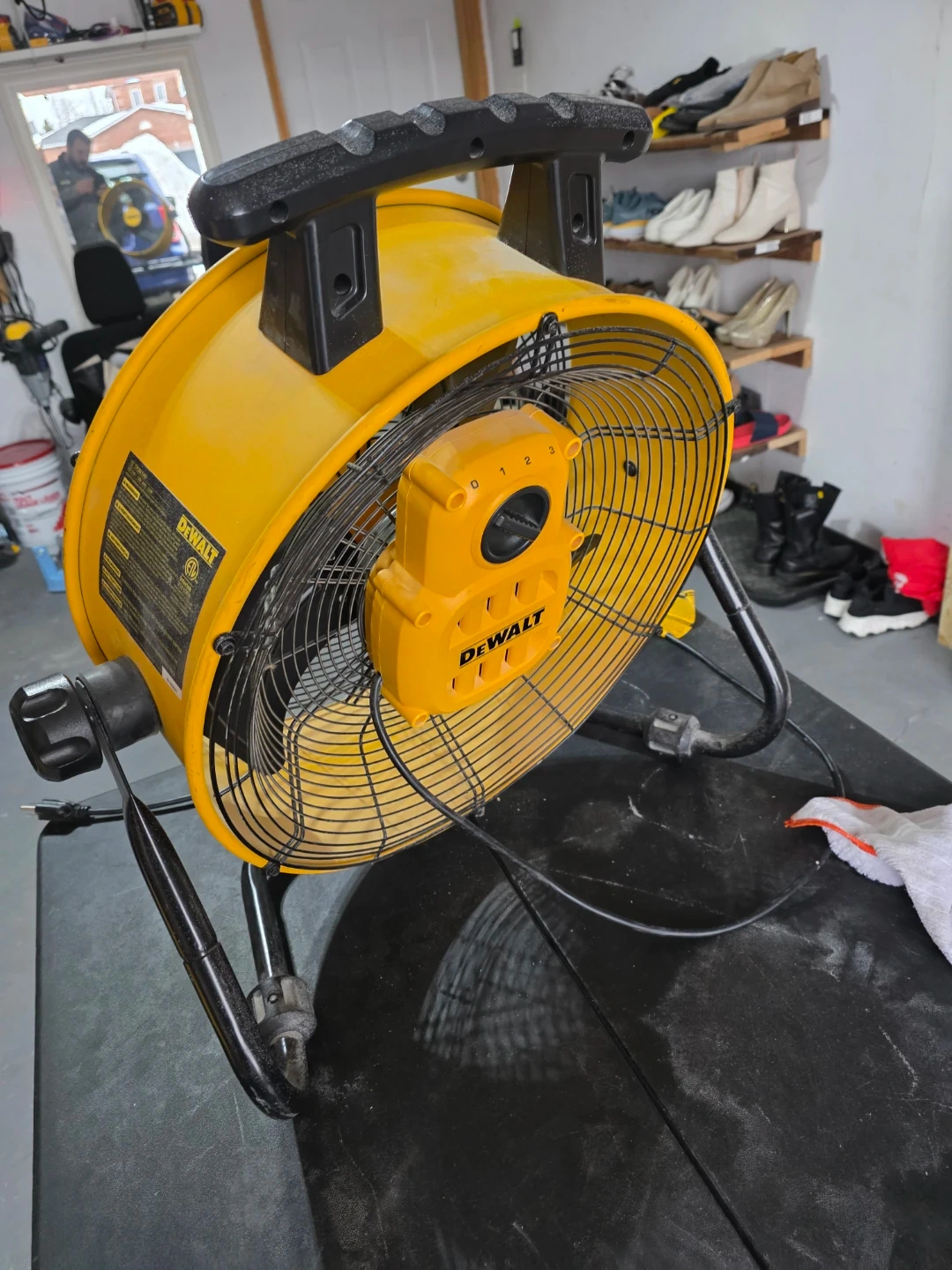 Selling a DeWalt 18" drum fan in great condition! It's yellow and black with a sturdy stand. This fan is perfect for cooling down a garage or workshop. It has three speeds to choose from!