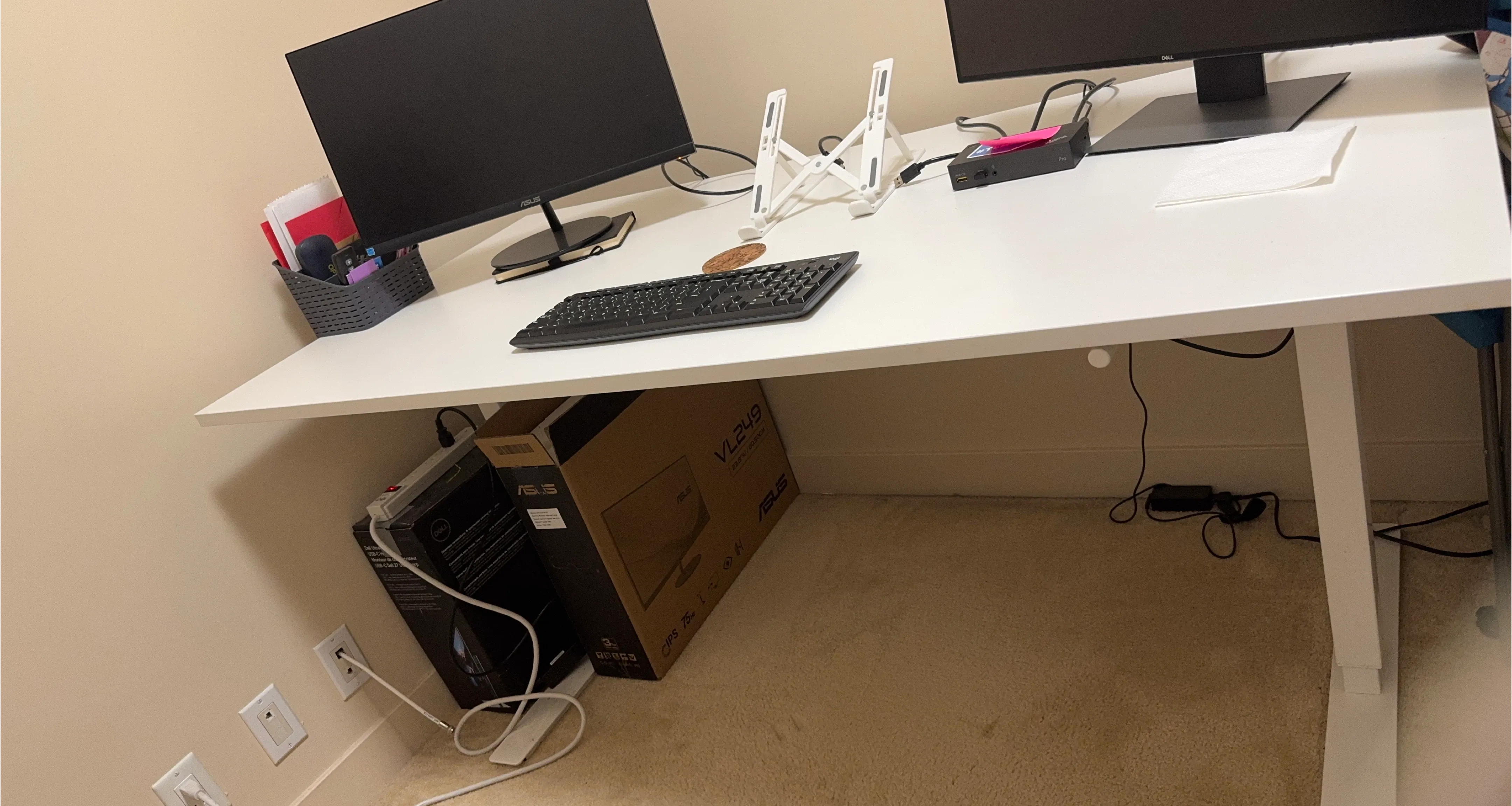 Selling a white standing desk. It's in great condition and ready for a new workspace! The desk is spacious and perfect for setting up your computer, monitors, and other work essentials.