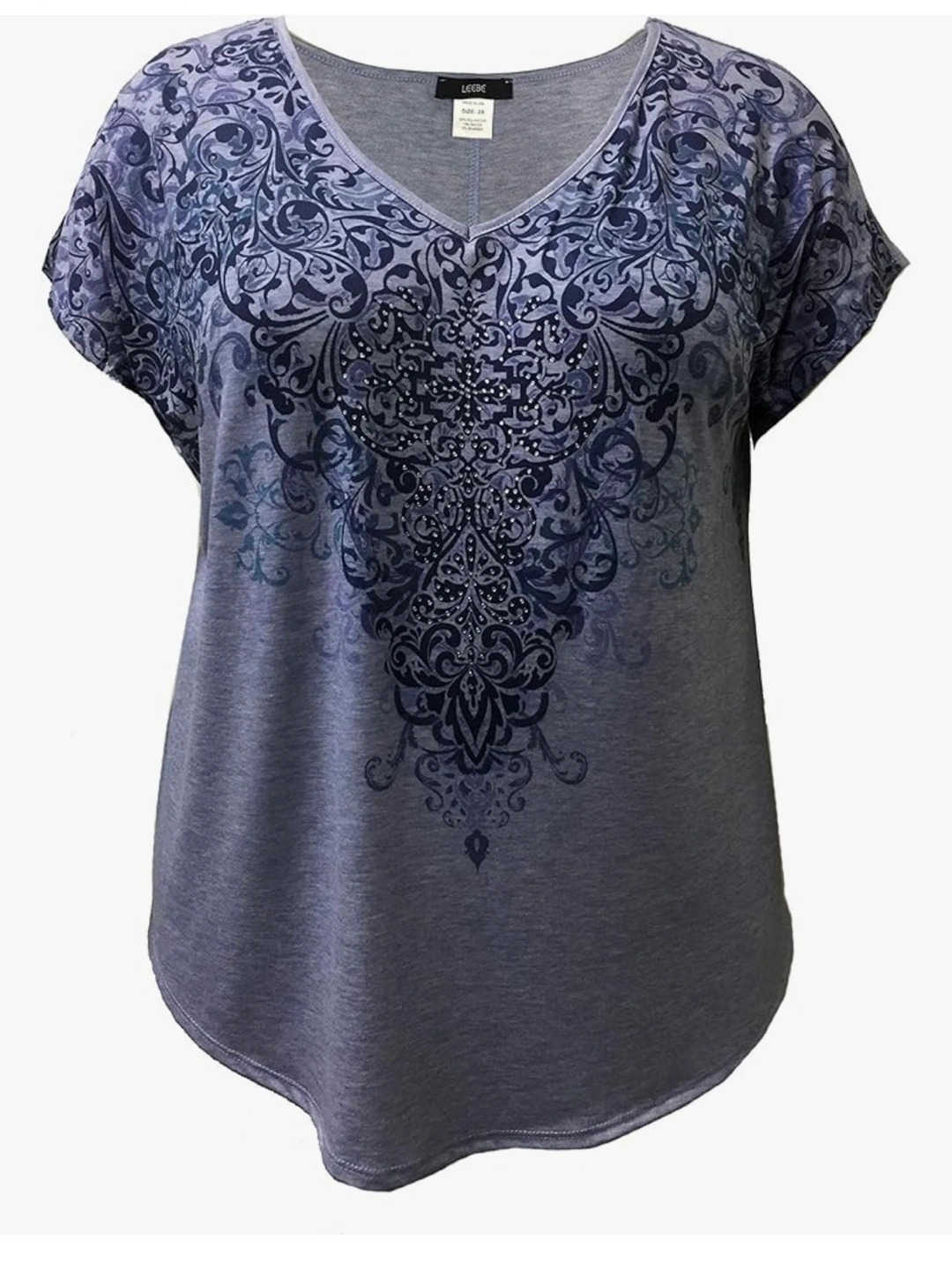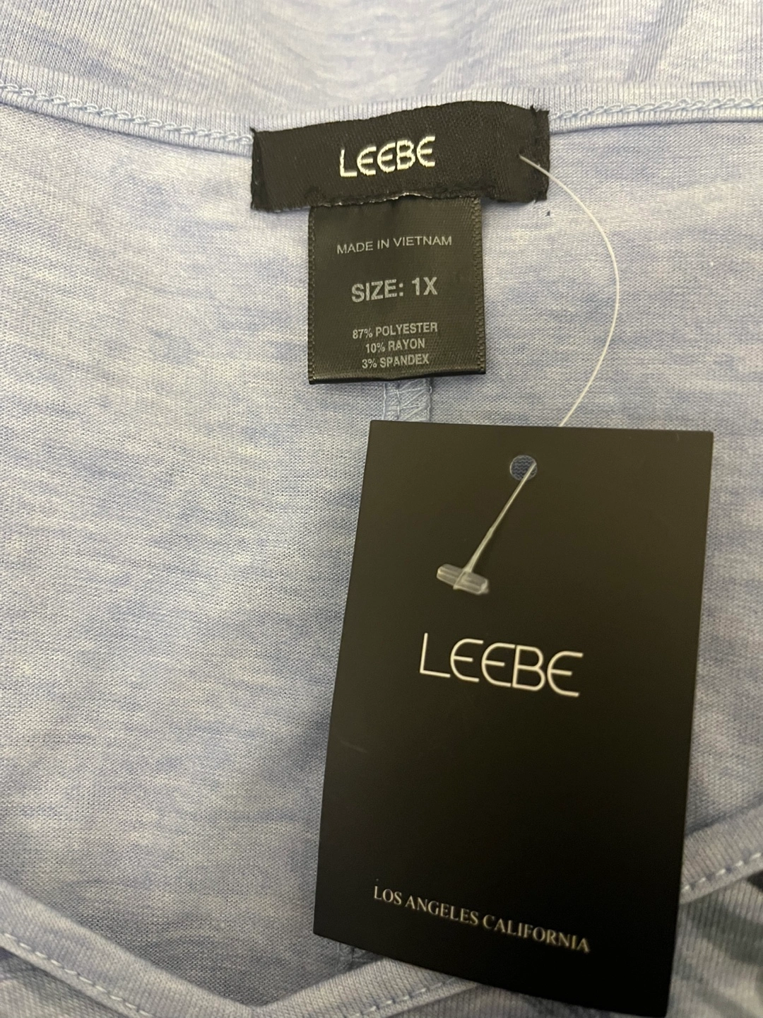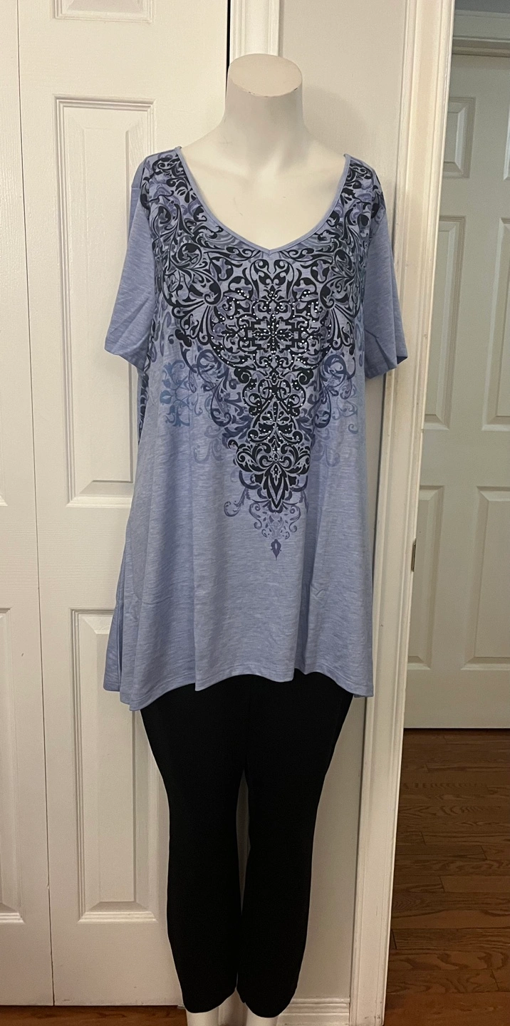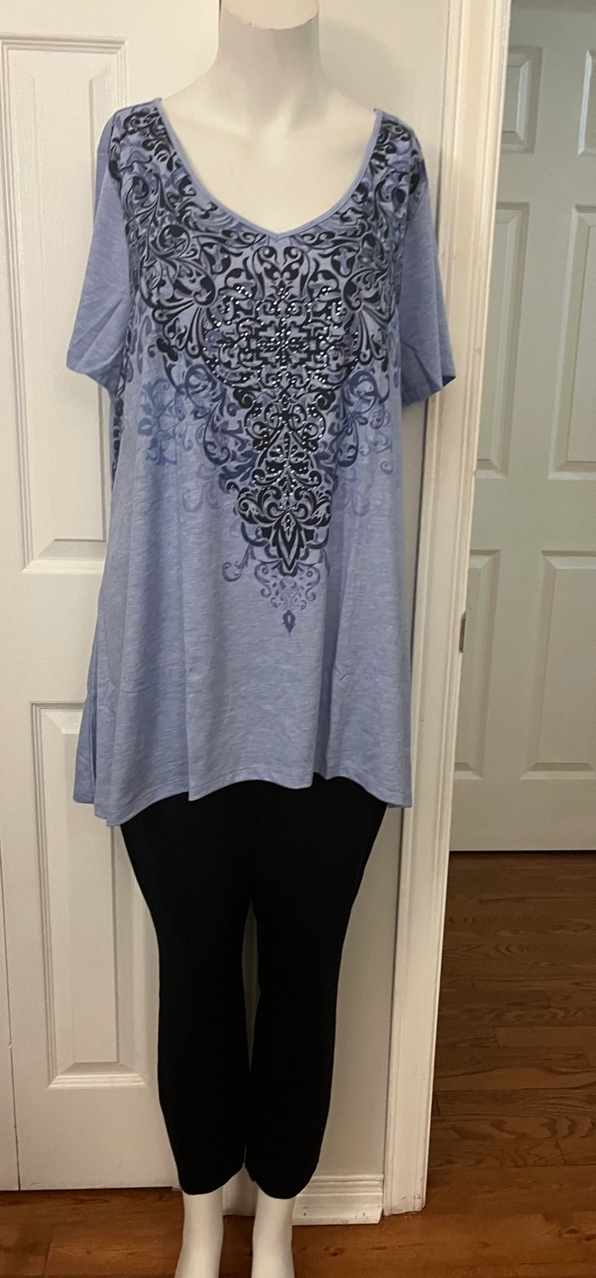 This is a Leebe tunic top in size 1X. It's a pretty light blue colour with a dark blue and black design. The material is 87% polyester, 10% rayon, and 3% spandex, so it's nice and stretchy