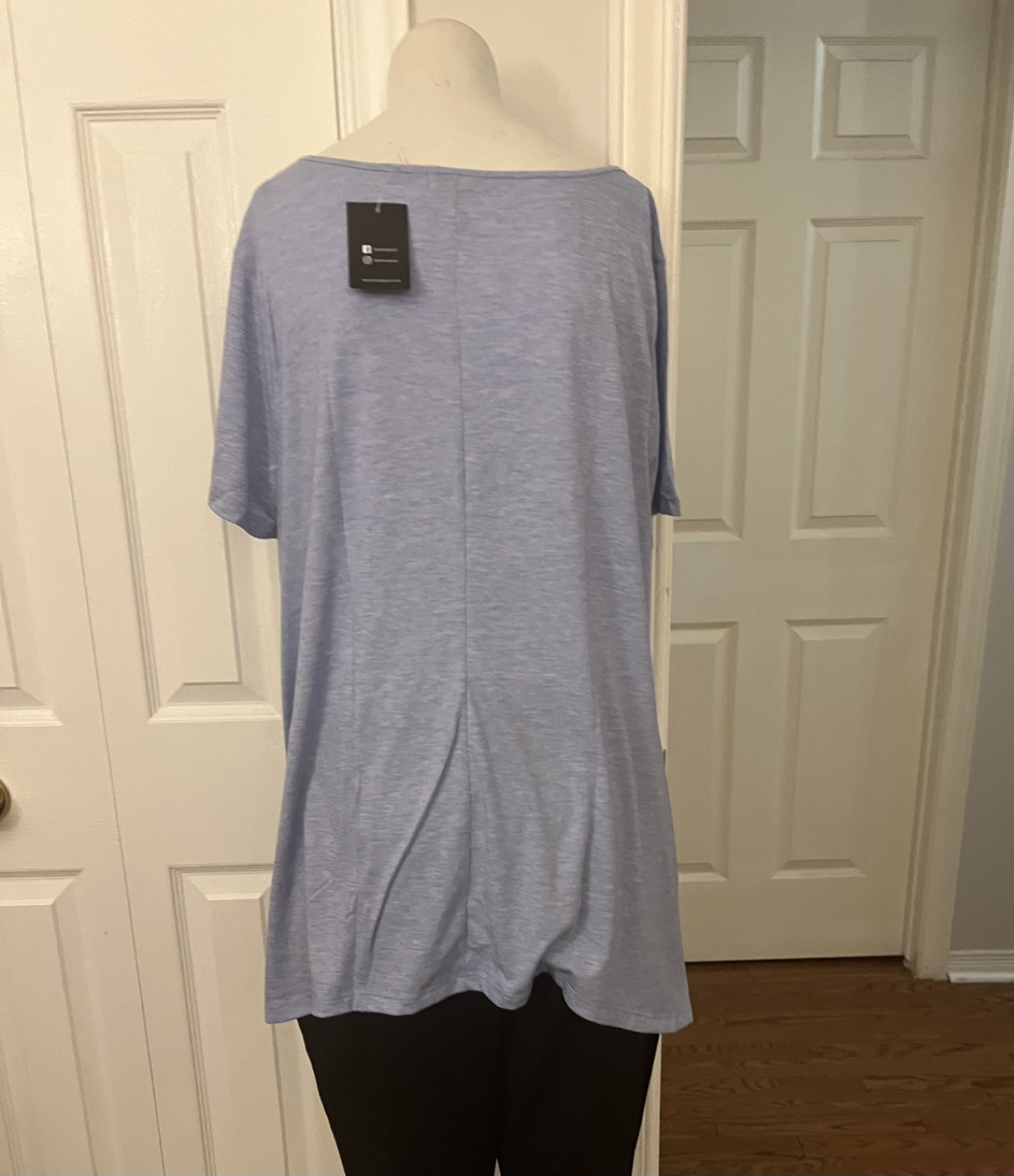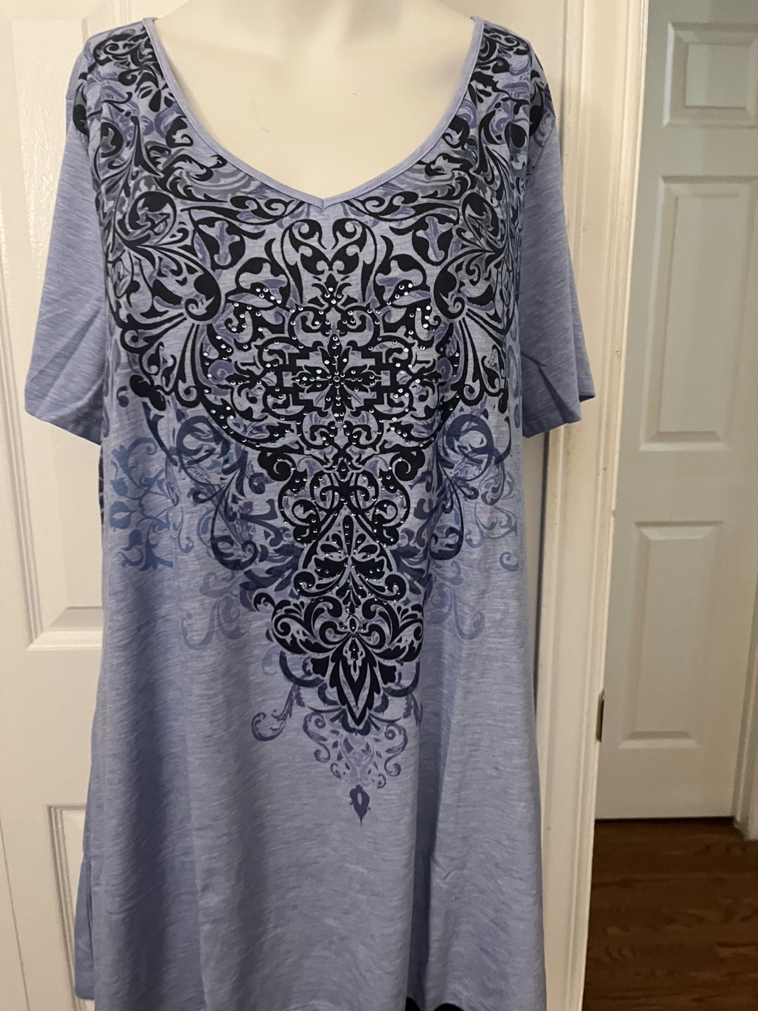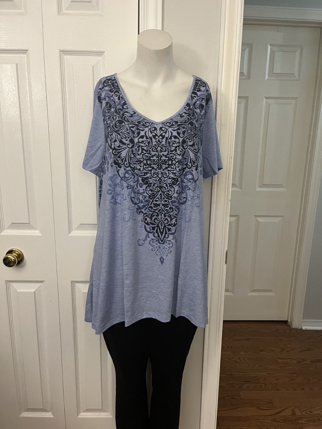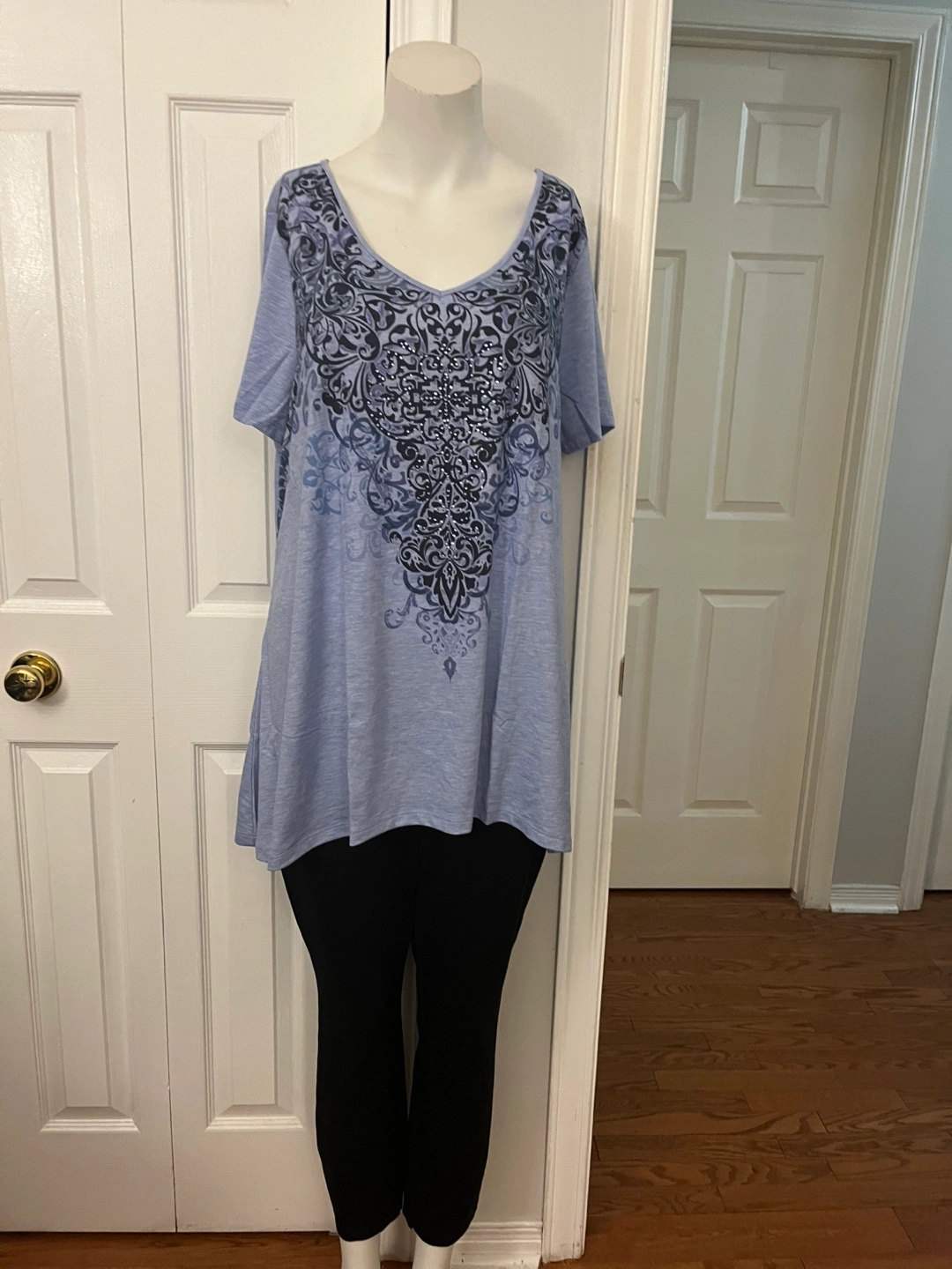This is a Leebe tunic top in size 1X. It's a pretty light blue colour with a dark blue and black design. The material is 87% polyester, 10% rayon, and 3% spandex, so it's nice and stretchy