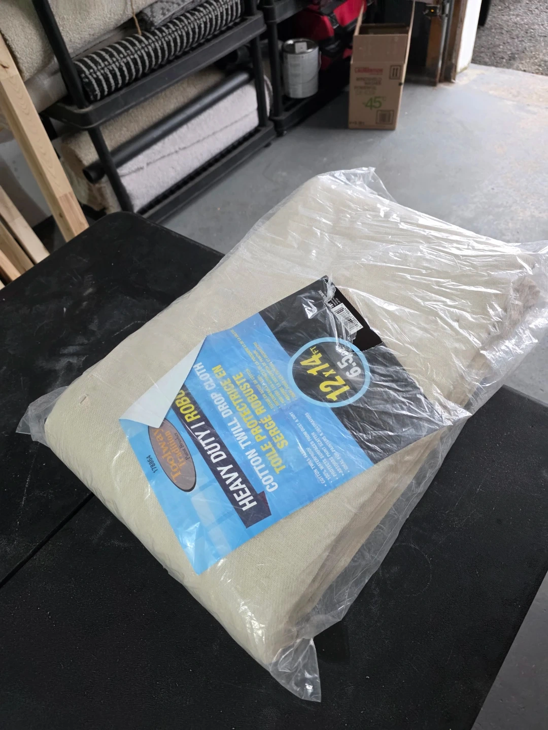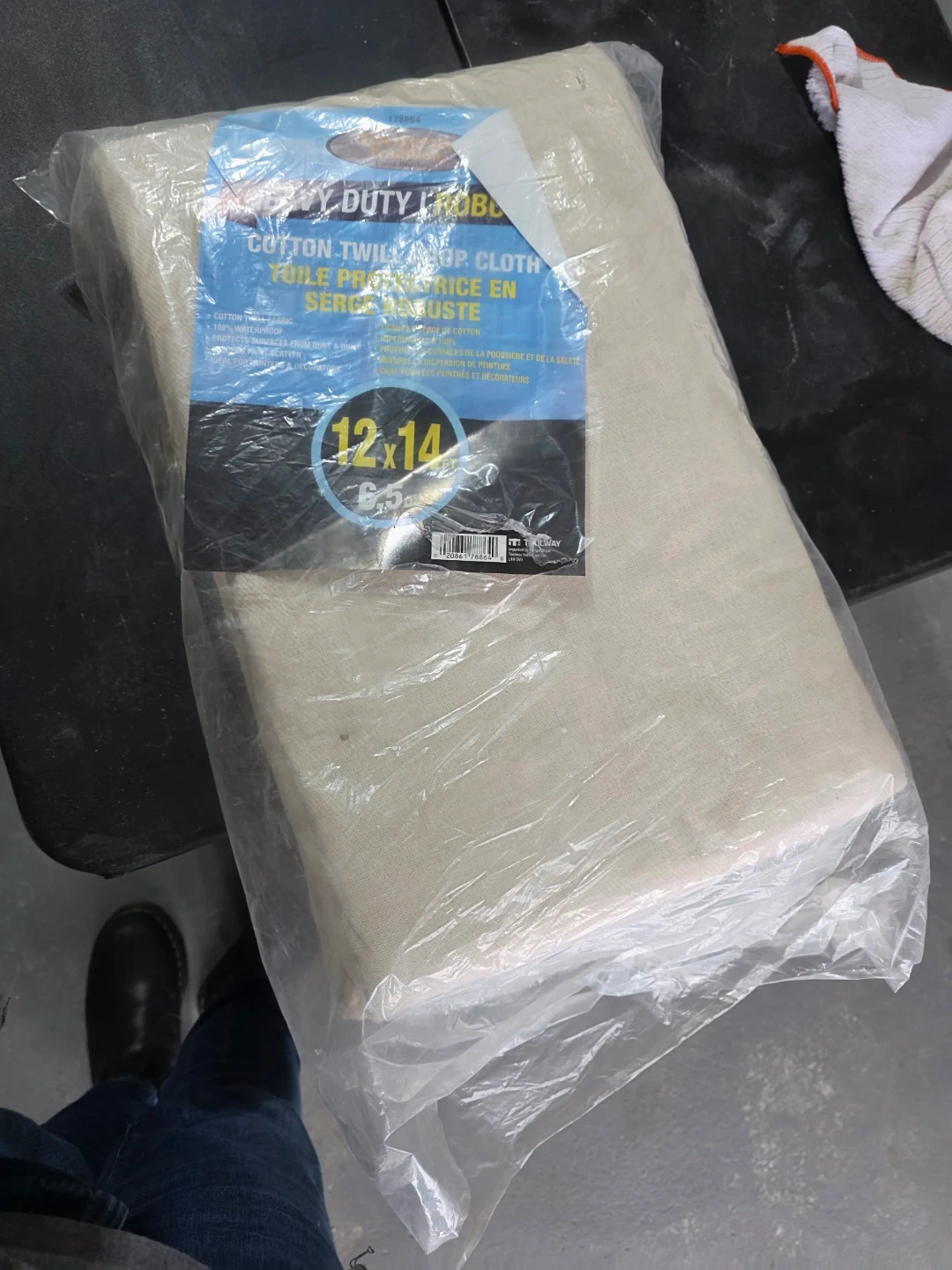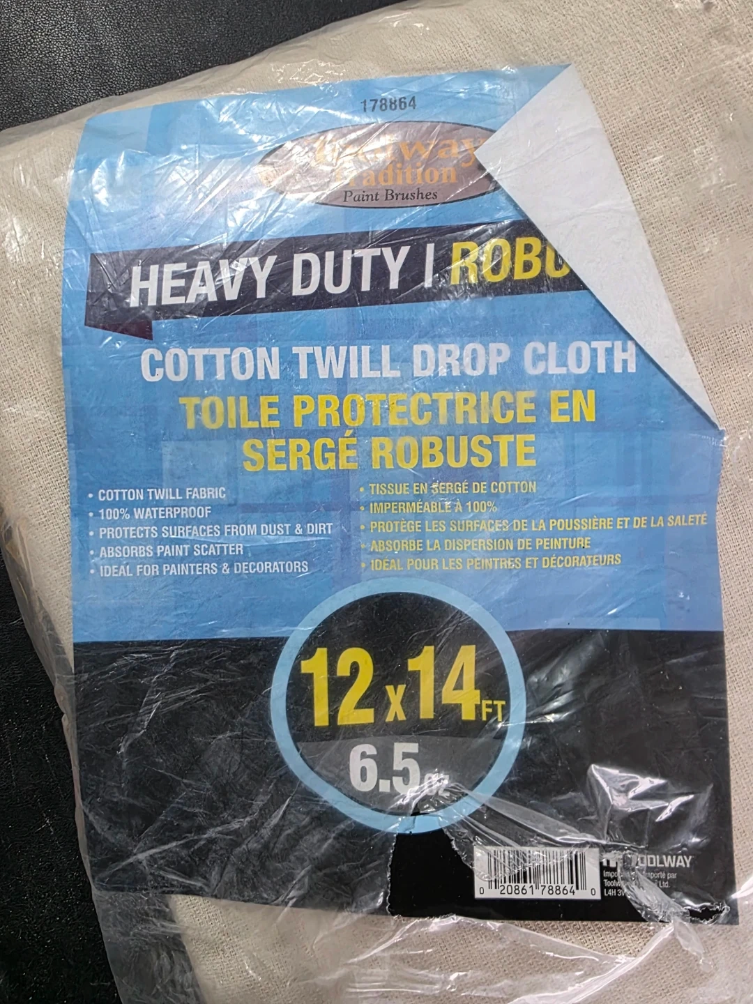 I'm selling a heavy-duty cotton twill drop cloth, perfect for painters and decorators! This drop cloth is 12x14 ft and is ideal for protecting surfaces from dust and dirt, and it absorbs paint splatter. It's also 100% waterproof