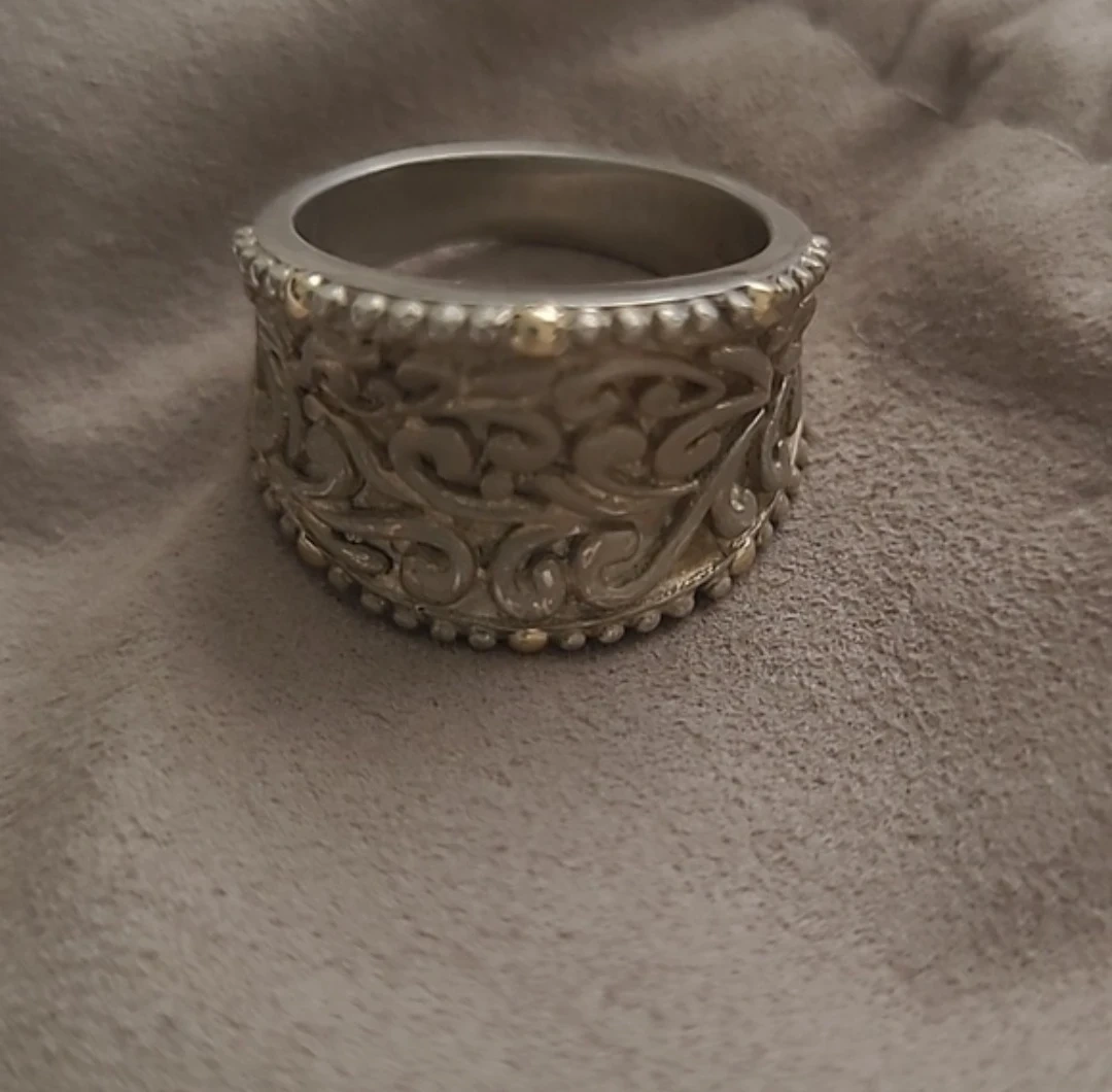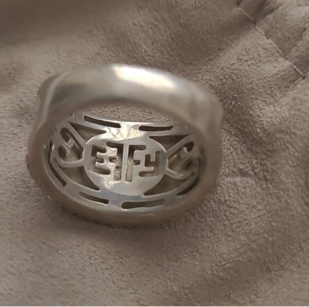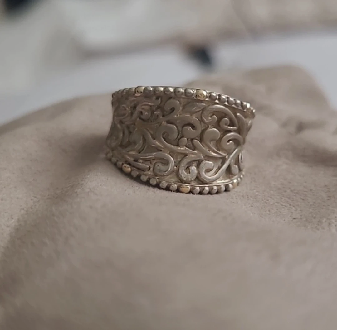 Here's a unique ring with a vintage-inspired design! It's made of sterling silver and has intricate detailing around the band. The ring is marked with '925 18K' on the inside and fits comfortably. It's around 6.5/7 size wise.