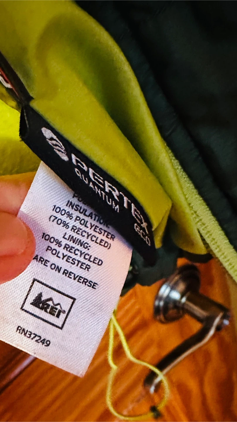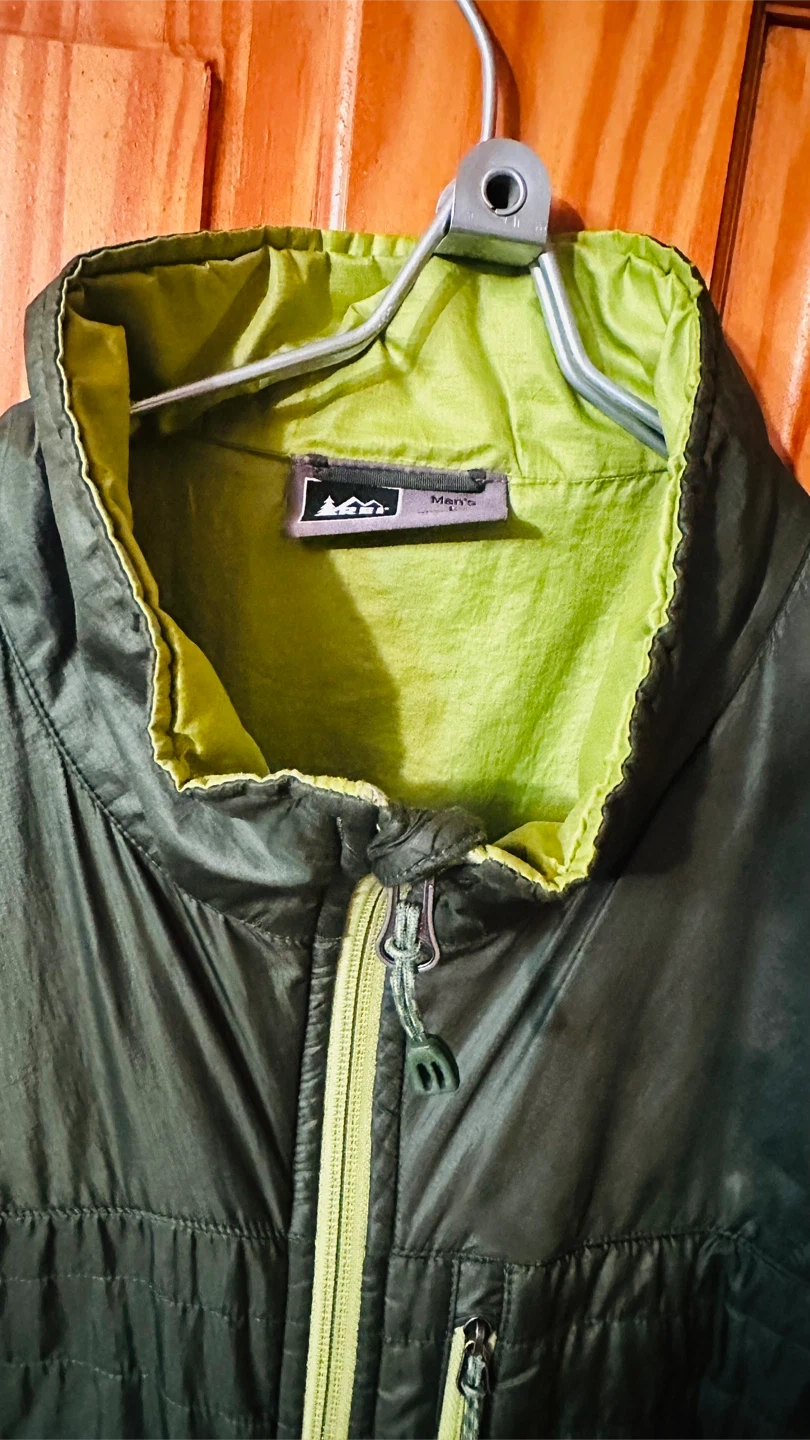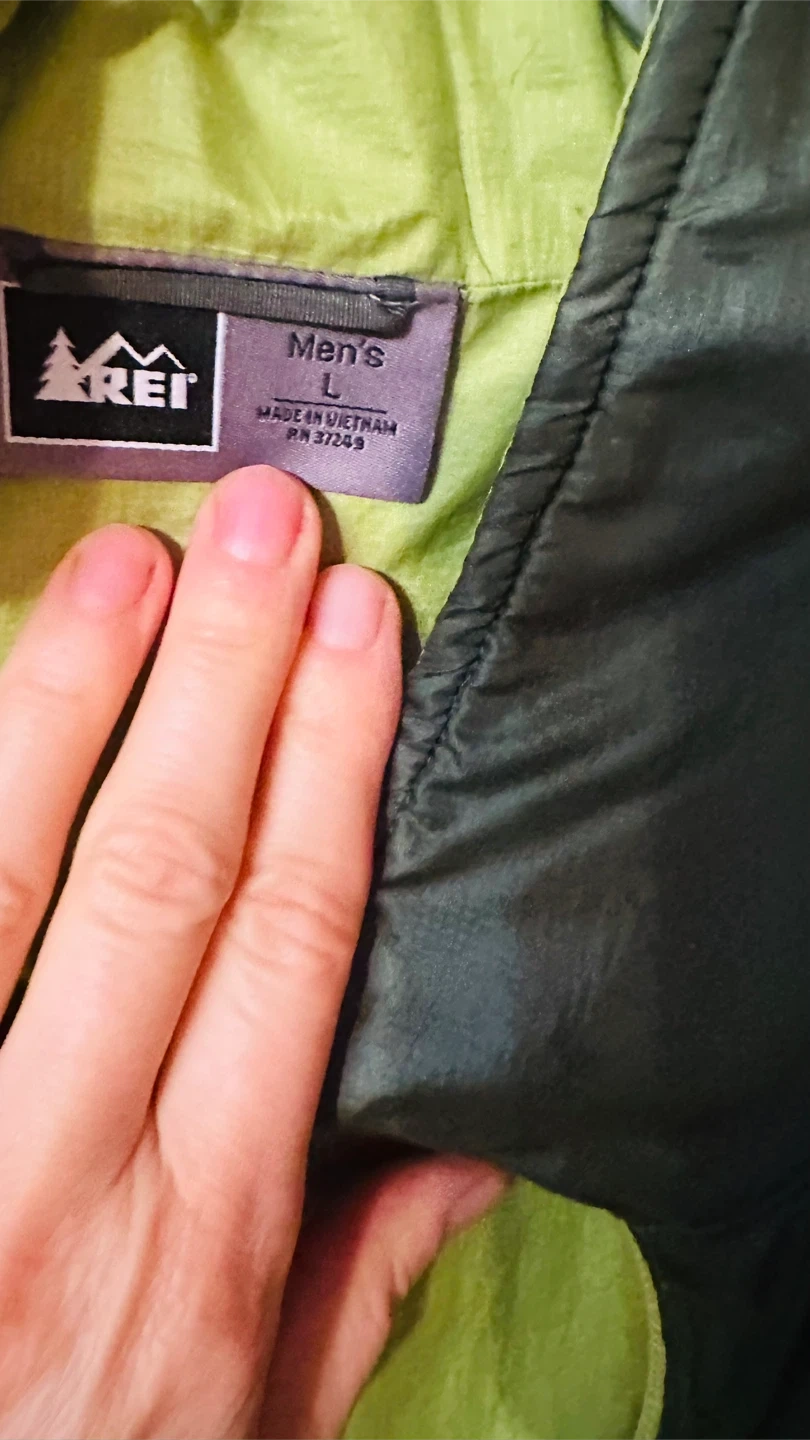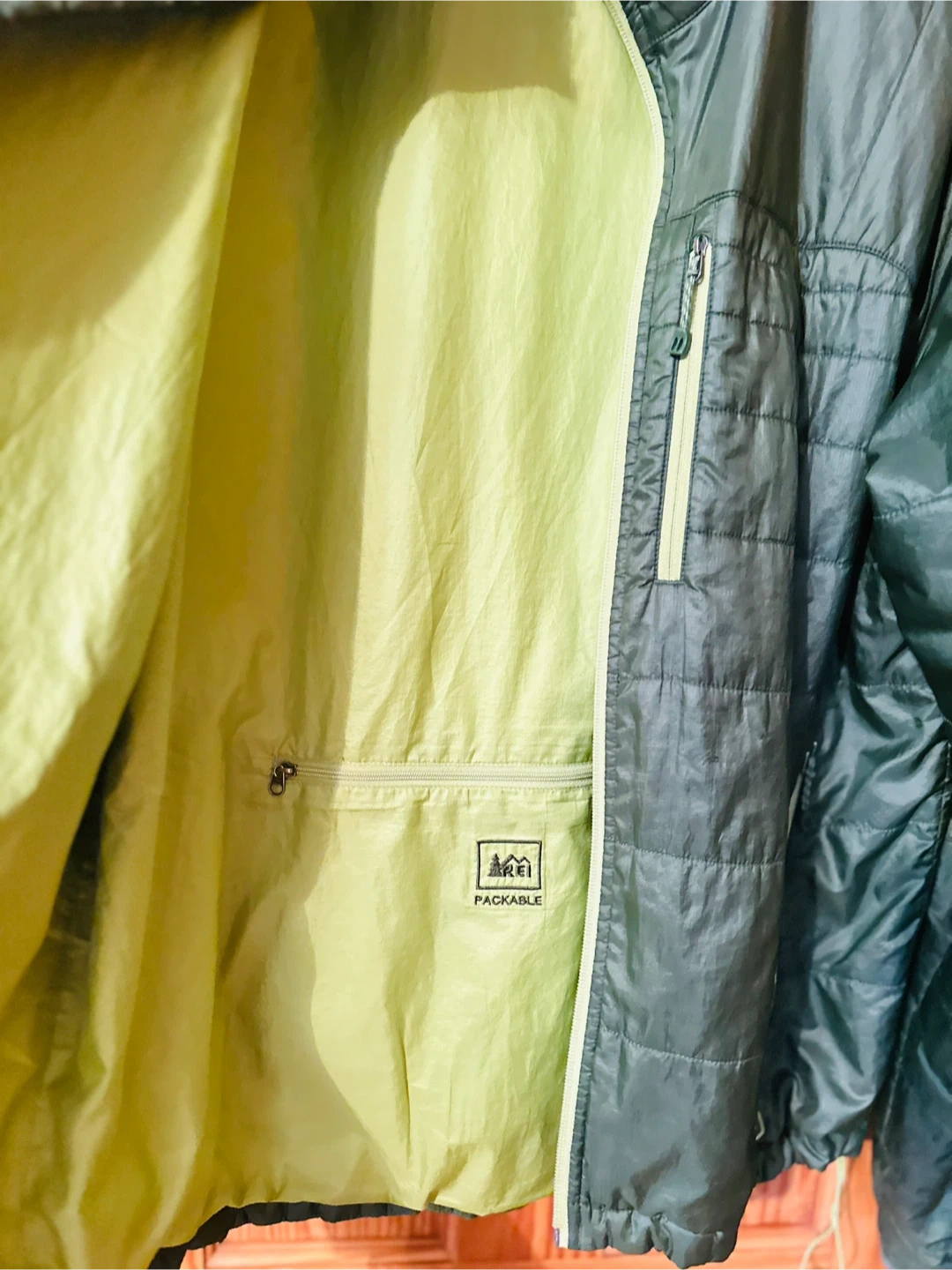 Selling a men's REI Co-op packable jacket in size large. It's a lightweight jacket perfect for travel or outdoor activities. The jacket is green with a light green interior and features a packable design for easy storage. It's in great used condition and ready for a new owner!