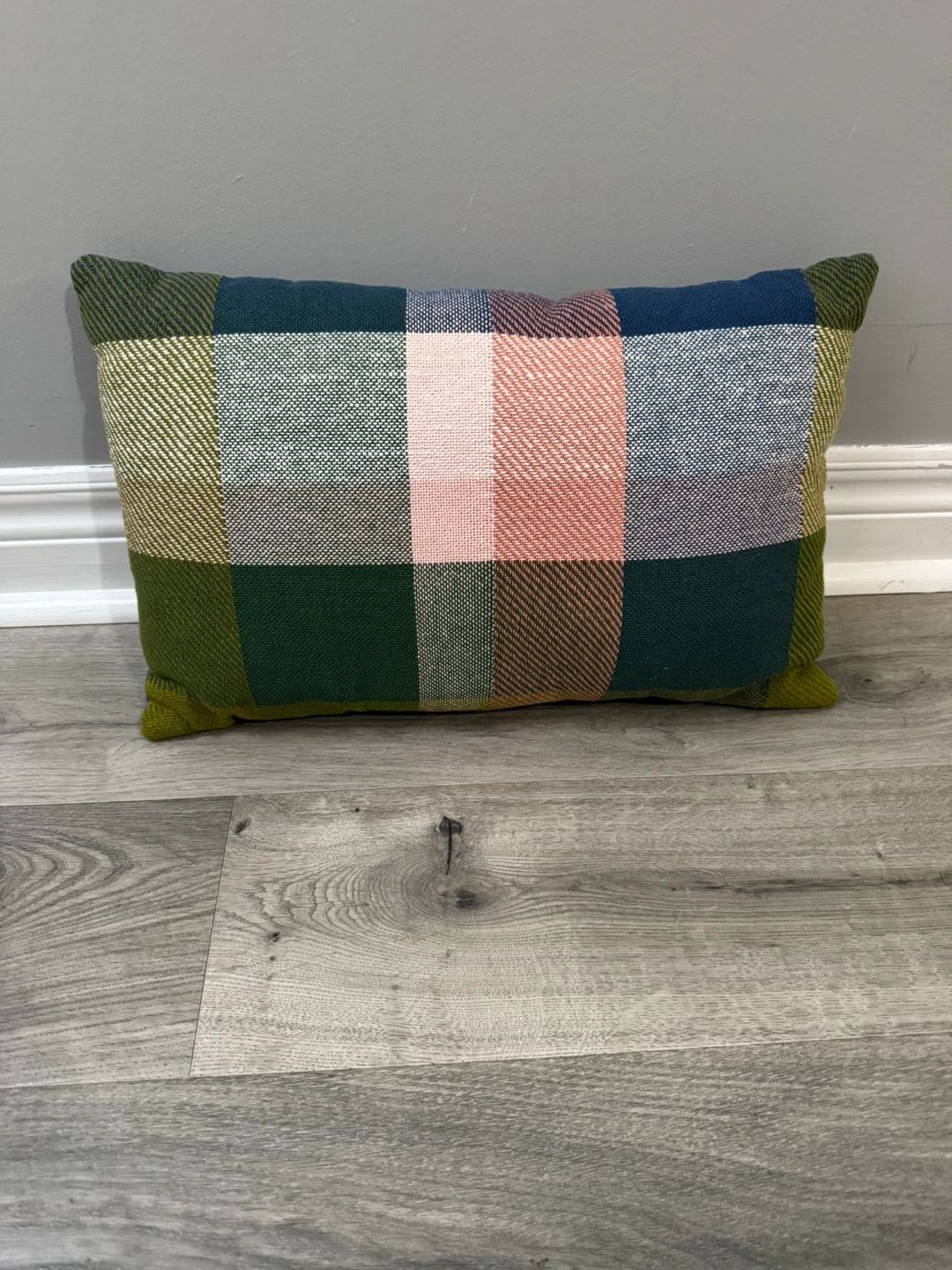 Here's a colourful plaid throw pillow! It's in great shape and would look lovely on a couch or bed. The colours are a mix of greens, blues, pinks and other colours. Feel free to message me if you're interested.