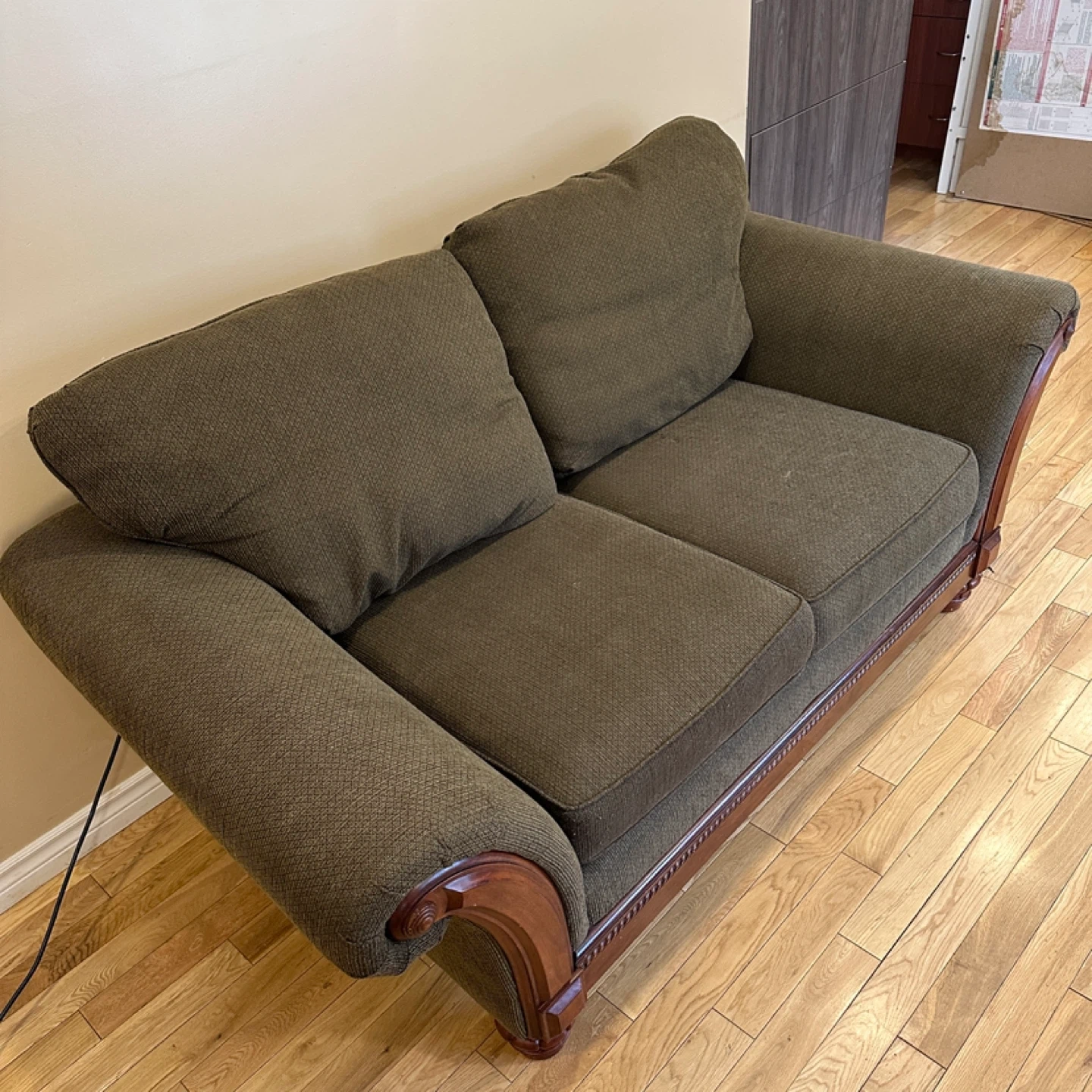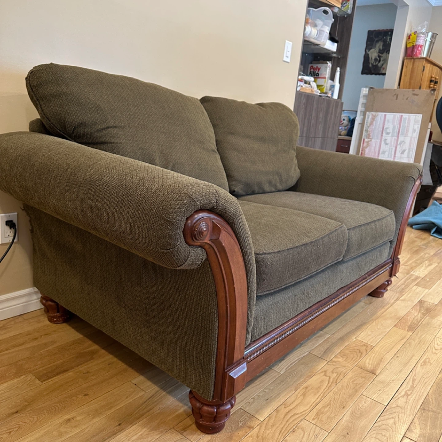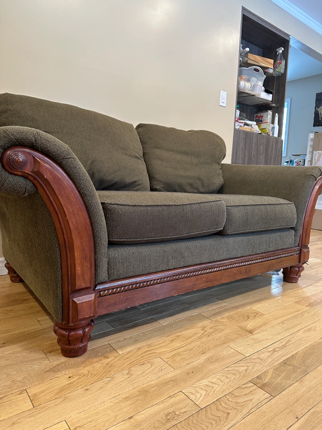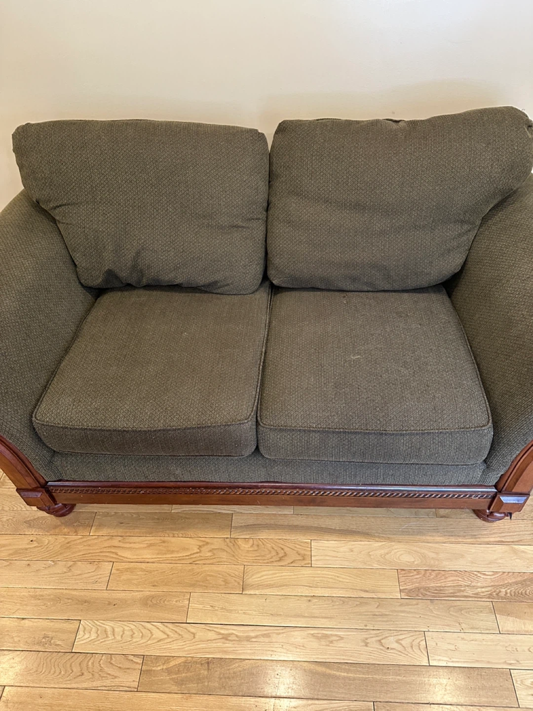 Beautiful traditional loveseat with olive brownish upholstery and solid wood carved detailing. Very comfortable, sturdy, and well-made. From a smoke-free home and in excellent condition.