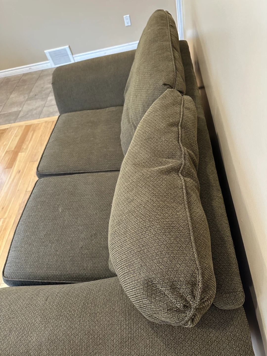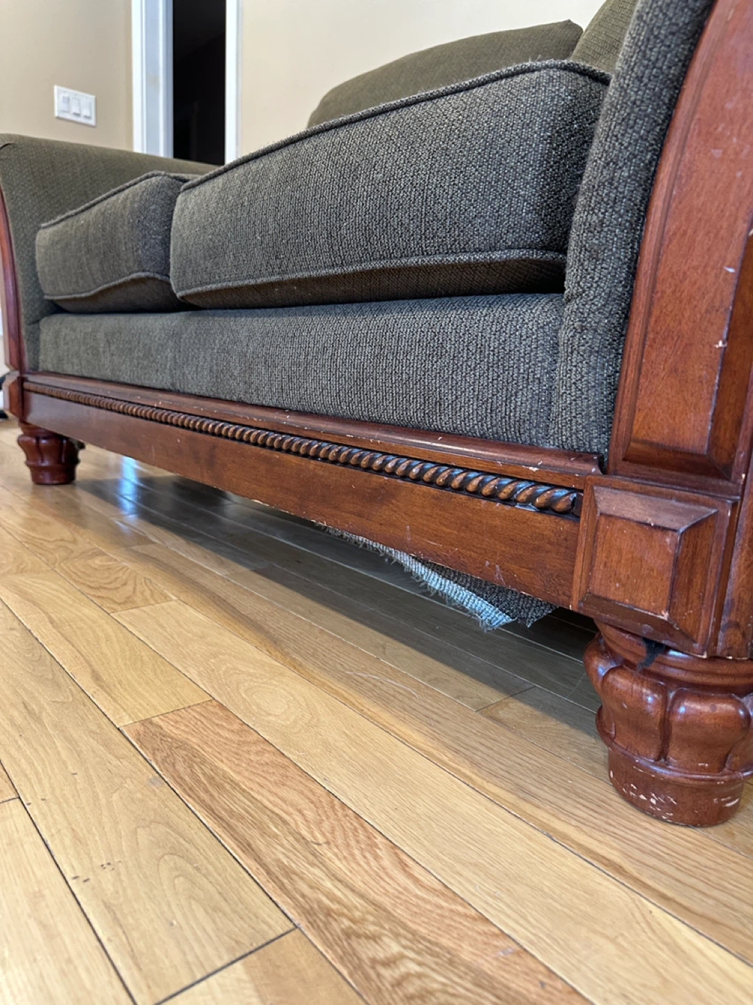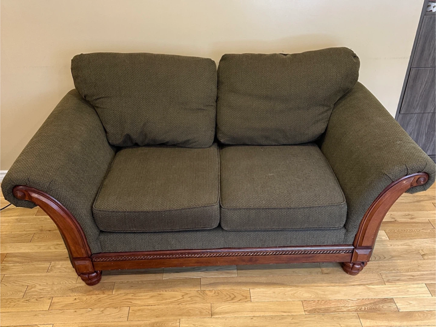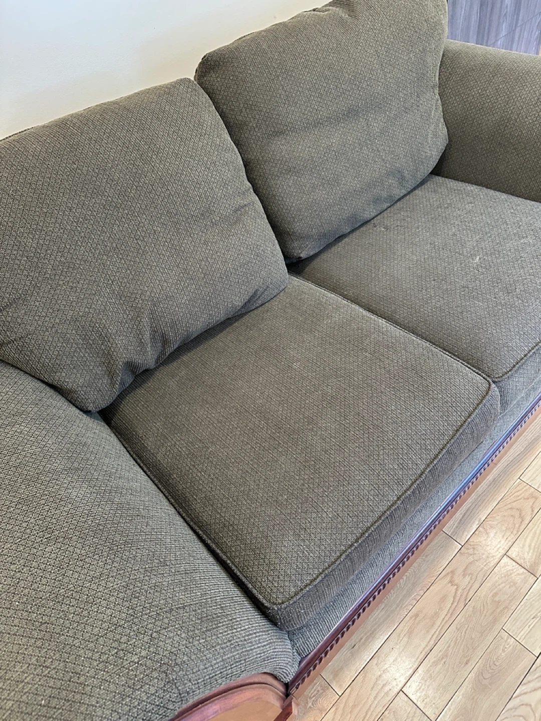 Beautiful traditional loveseat with olive brownish upholstery and solid wood carved detailing. Very comfortable, sturdy, and well-made. From a smoke-free home and in excellent condition.